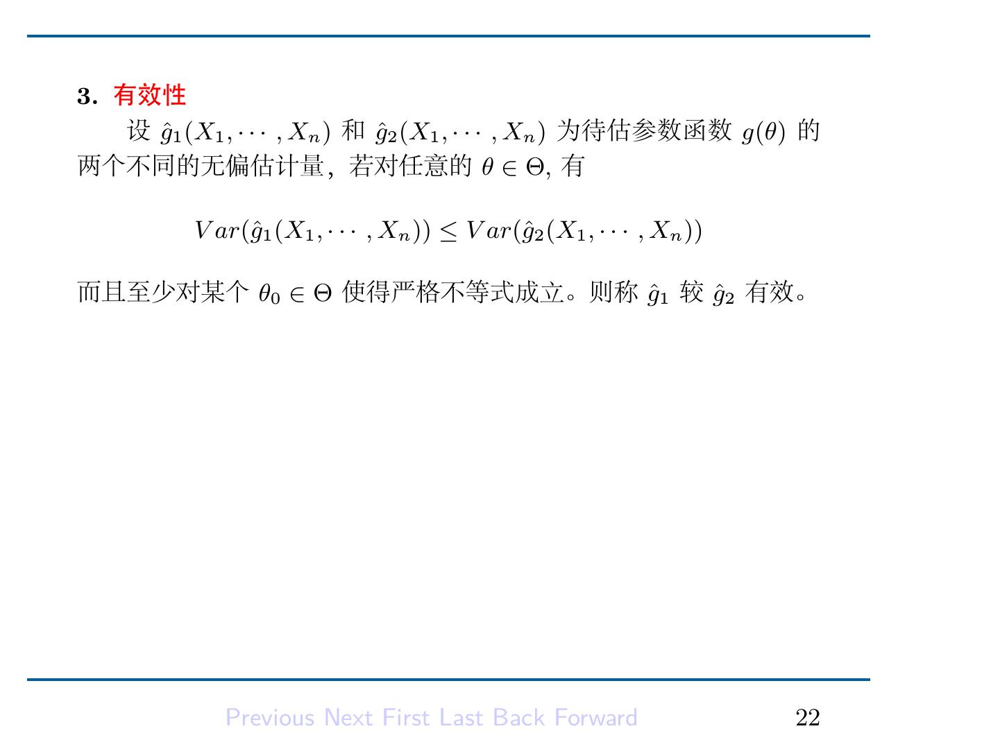 24 .3. 有效性 设 gˆ1 (X1 , · · · , Xn ) 和 gˆ2 (X1 , · · · , Xn ) 为待估参数函数 g(θ) 的 两个不同的无偏估计量,若对任意的 θ ∈ Θ, 有 g1 (X1 , · · · , Xn )) ≤ V ar(ˆ V ar(ˆ g2 (X1 , · · · , Xn )) 而且至少对某个 θ0 ∈ Θ 使得严格不等式成立。则称 gˆ1 较 gˆ2 有效。 Previous Next First Last Back Forward 22