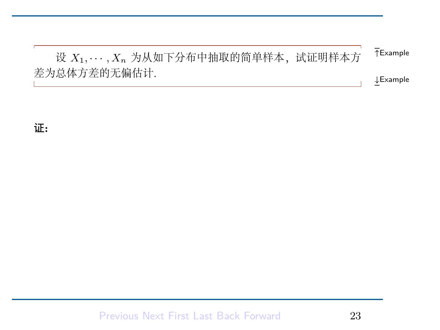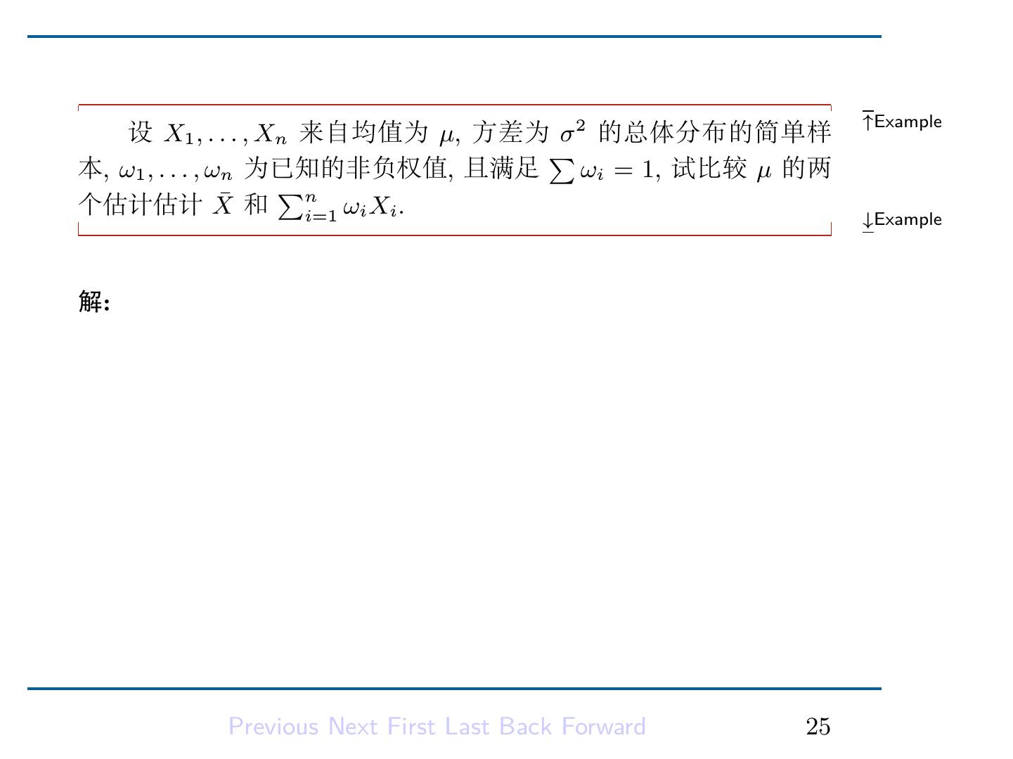 27 . ↑Example 设 X1 , . . . , Xn 来自均值为 µ, 方差为 σ 2 的总体分布的简单样 ∑ 本, ω1 , . . . , ωn 为已知的非负权值, 且满足 ωi = 1, 试比较 µ 的两 ¯ ∑ n 个估计估计 X 和 i=1 ωi Xi . ↓Example 解: 因为 2 ∑ ∑ n ¯ = σ , V ar(X) V ar( ωi Xi ) = ωi2 σ 2 , n i=1 所以 ∑ V ar( ωi Xi ) ≥ V ar(X) ¯ 且等号成立当且仅当 ωi = 1 n . Previous Next First Last Back Forward 25