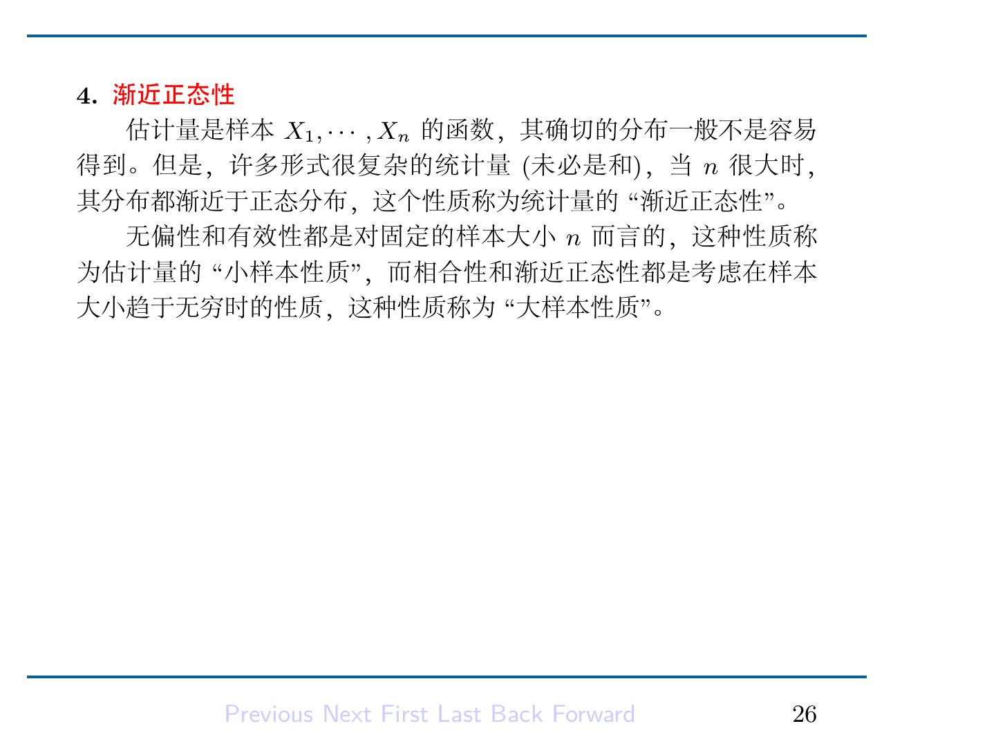 28 .4. 渐近正态性 估计量是样本 X1 , · · · , Xn 的函数,其确切的分布一般不是容易 得到。但是,许多形式很复杂的统计量 (未必是和),当 n 很大时, 其分布都渐近于正态分布,这个性质称为统计量的 “渐近正态性”。 无偏性和有效性都是对固定的样本大小 n 而言的,这种性质称 为估计量的 “小样本性质”,而相合性和渐近正态性都是考虑在样本 大小趋于无穷时的性质,这种性质称为 “大样本性质”。 Previous Next First Last Back Forward 26