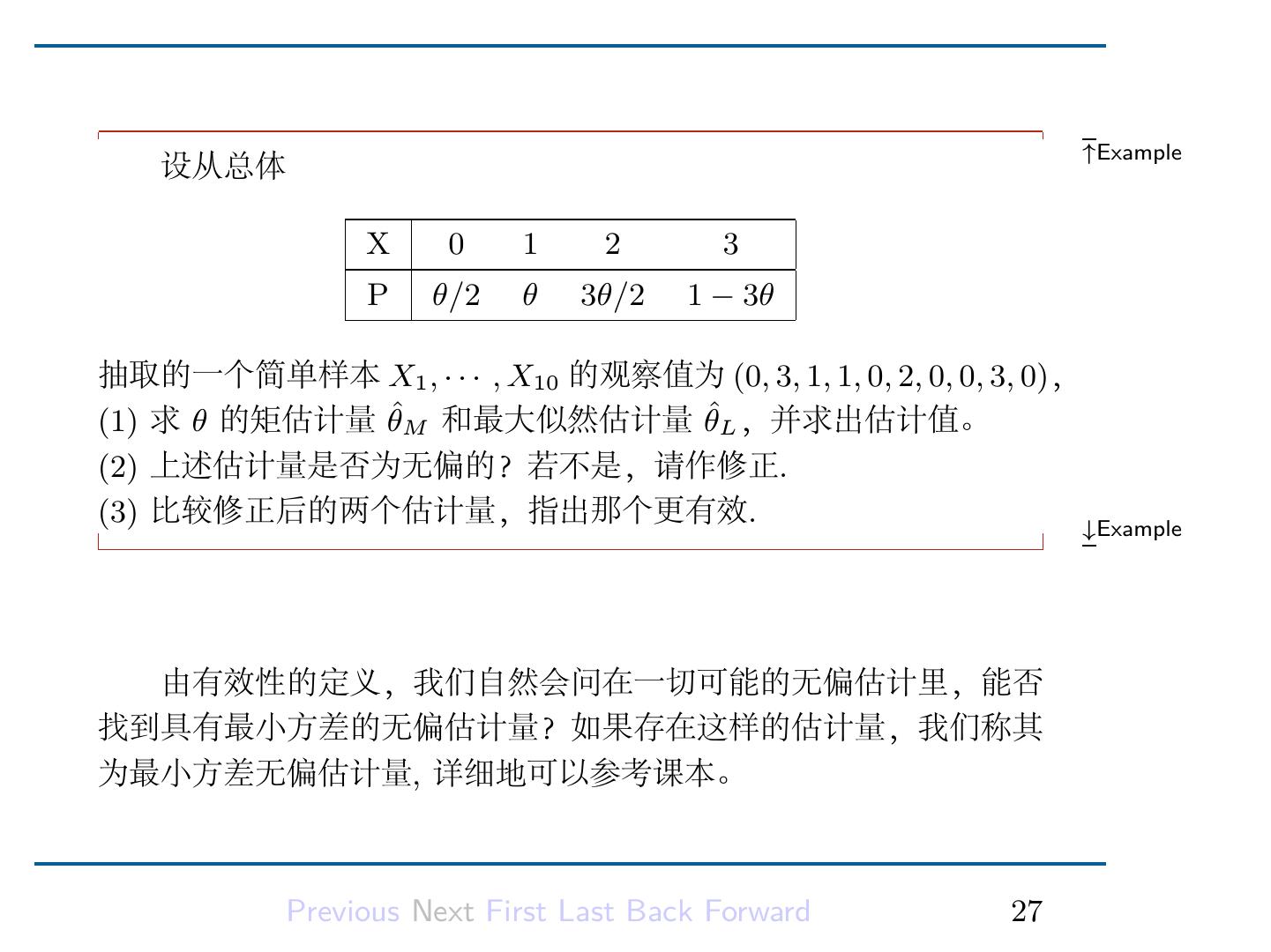 29 . ↑Example 设从总体 X 0 1 2 3 P θ/2 θ 3θ/2 1 − 3θ 抽取的一个简单样本 X1 , · · · , X10 的观察值为 (0, 3, 1, 1, 0, 2, 0, 0, 3, 0), (1) 求 θ 的矩估计量 θˆM 和最大似然估计量 θˆL ,并求出估计值。 (2) 上述估计量是否为无偏的?若不是,请作修正. (3) 比较修正后的两个估计量,指出那个更有效. ↓Example 由有效性的定义,我们自然会问在一切可能的无偏估计里,能否 找到具有最小方差的无偏估计量?如果存在这样的估计量,我们称其 为最小方差无偏估计量, 详细地可以参考课本。 Previous Next First Last Back Forward 27