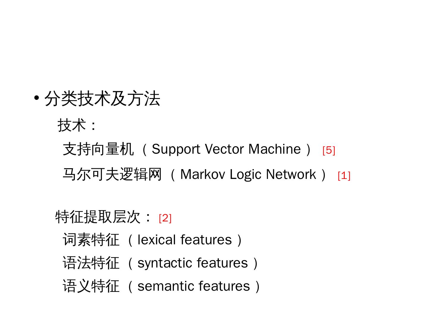 支持向量机(Support Vector Machine)[5]. 马尔可夫逻辑网(Markov Logic Network)[1]. 特征提取层次:[2]. 词素特征(lexical features). 语法特征(syntactic features).