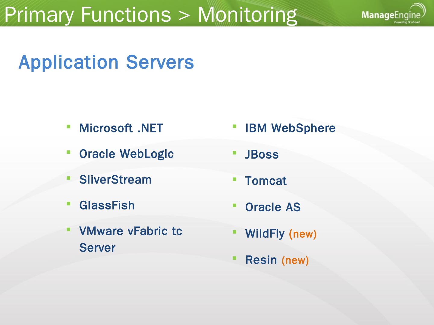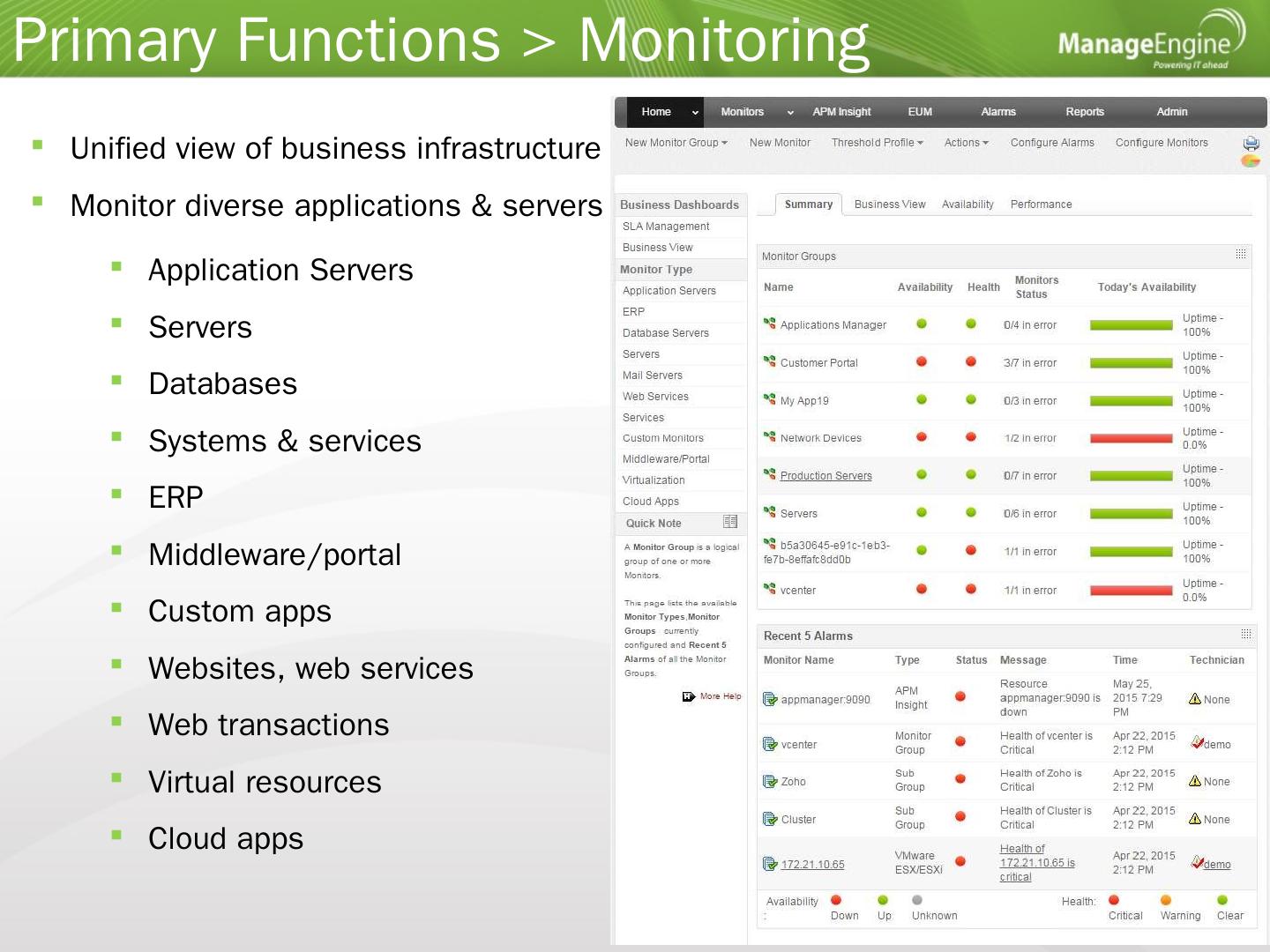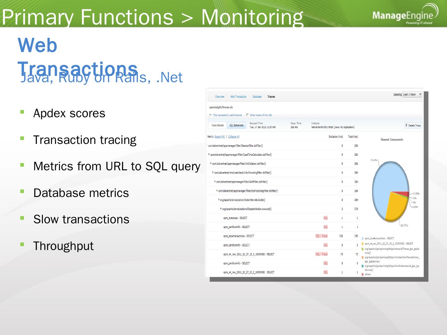 Java, Ruby on Rails, .Net. Primary Functions > Monitoring. Web Transactions. Java, Ruby on Rails, .Net. Apdex scores; Transaction tracing; Metrics from URL to ...