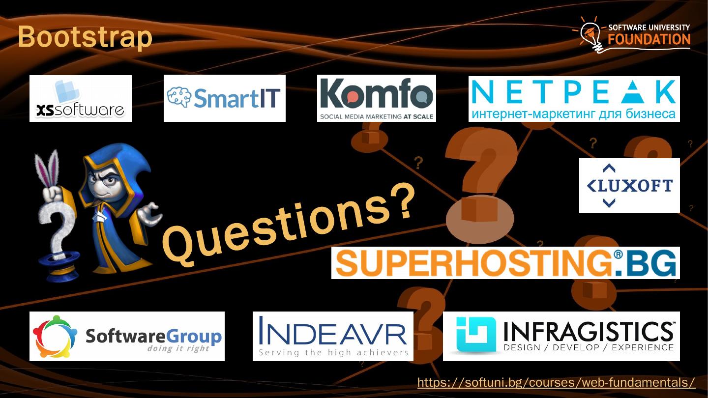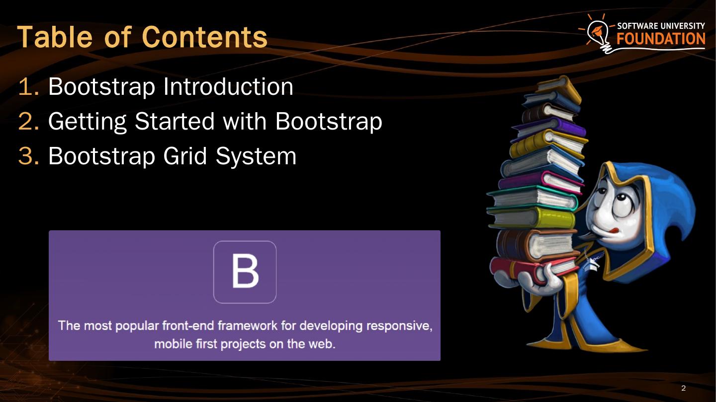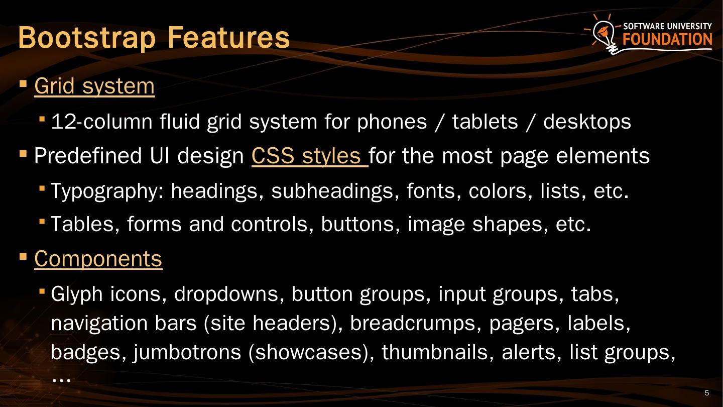Bootstrap. Introduction. 4. Bootstrap is a front-end framework for responsive Web sites. Developed by former Twitter employees (a.k.a. Twitter Bootstrap) ...