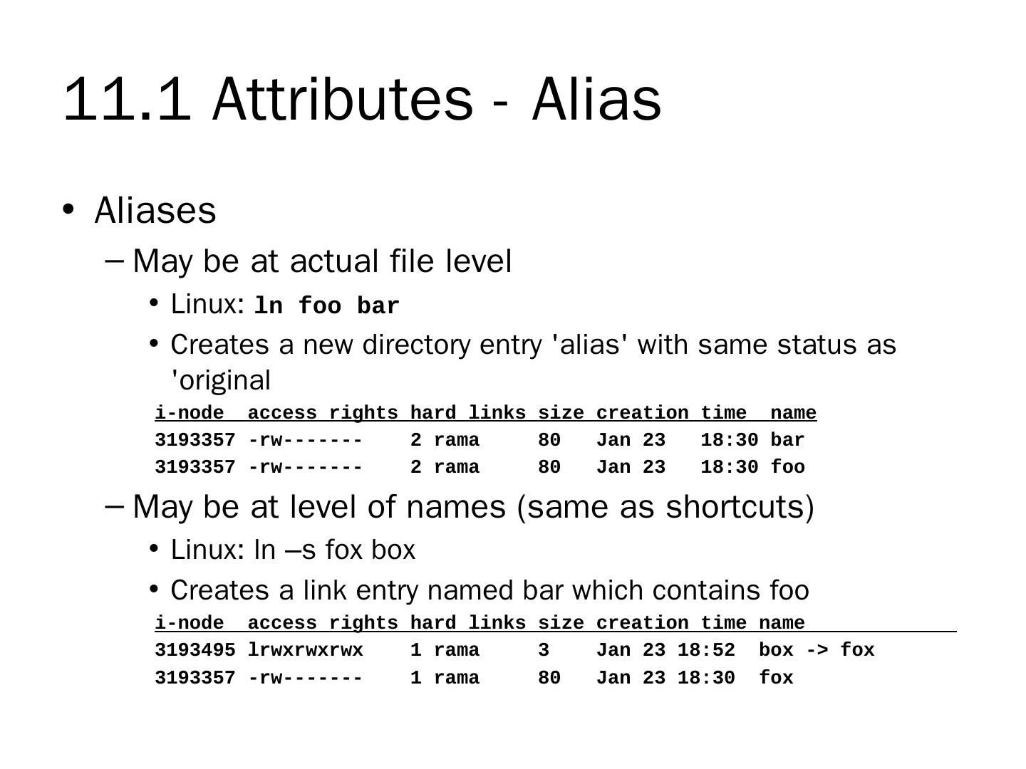 Linux: ln foo bar; Creates a new directory entry 'alias' with same status ... Size, Total space occupied on the file system, Attribute gets set every ...