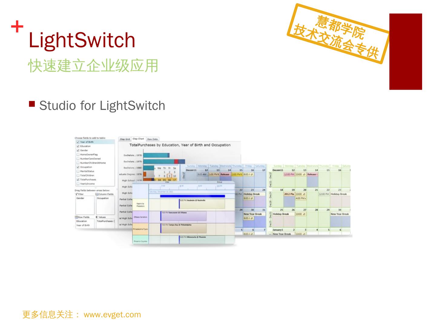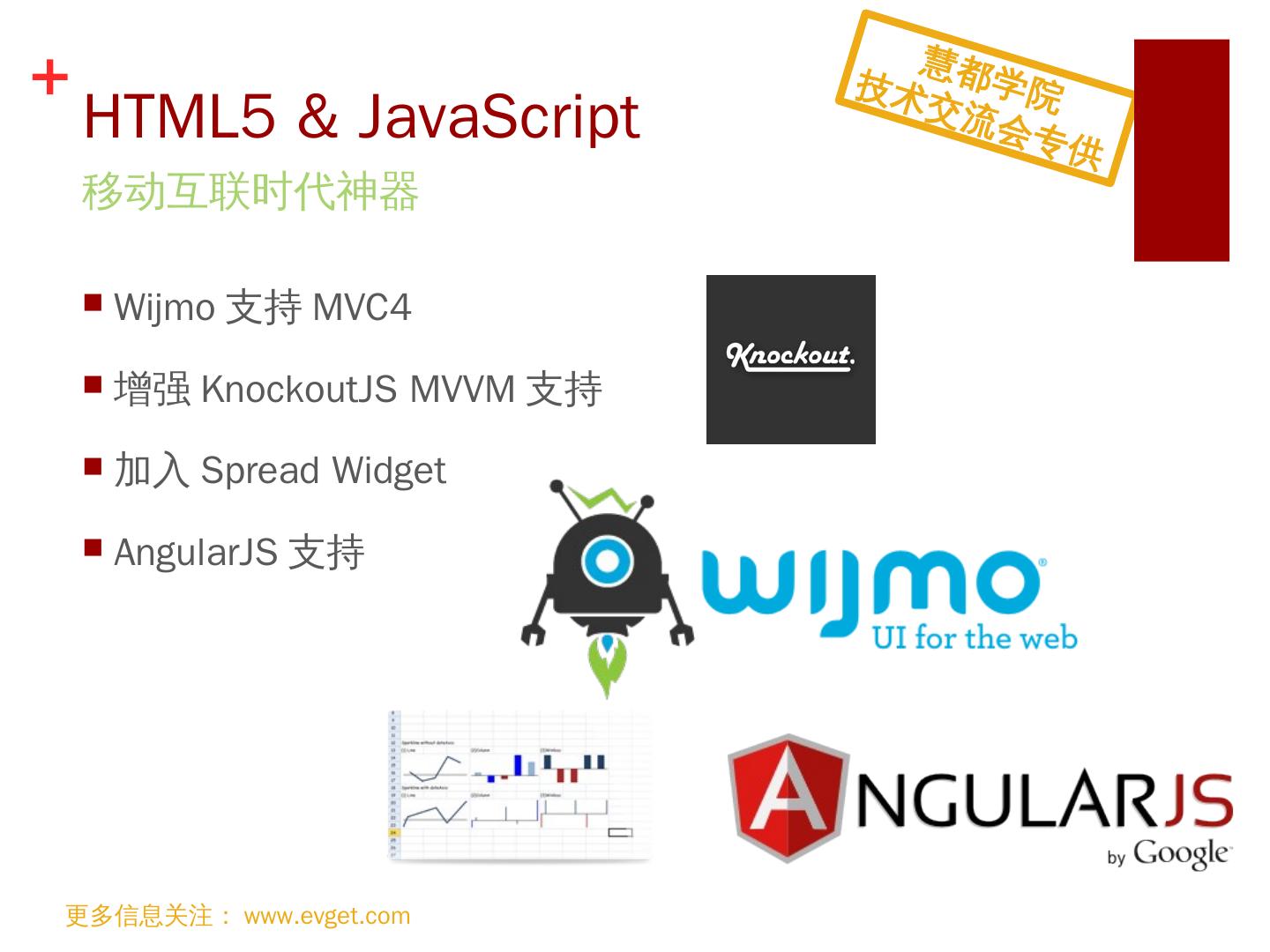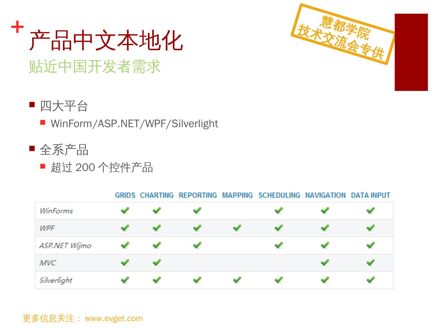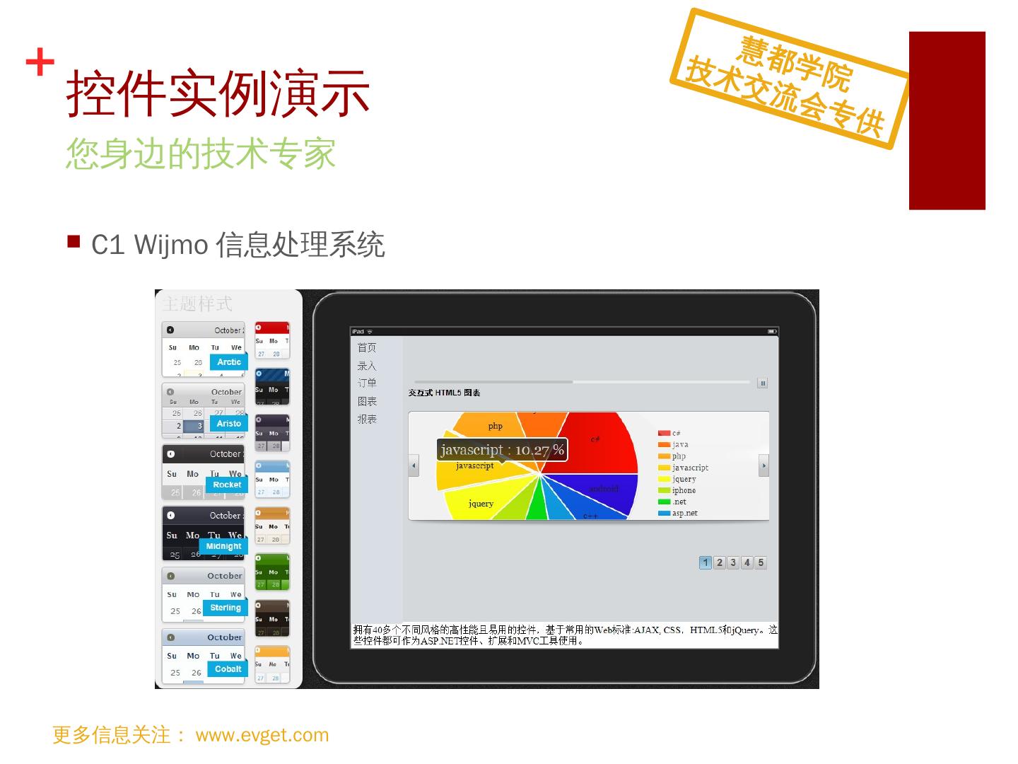 支持HTML5; 跨浏览器支持; 便捷切换主题; 支持MVVM KnockoutJS; 支持iCal格式. 引领. Web. 前端控件潮流. 更多信息关注:www.evget.com. 慧都学院. 技术交流会 ...