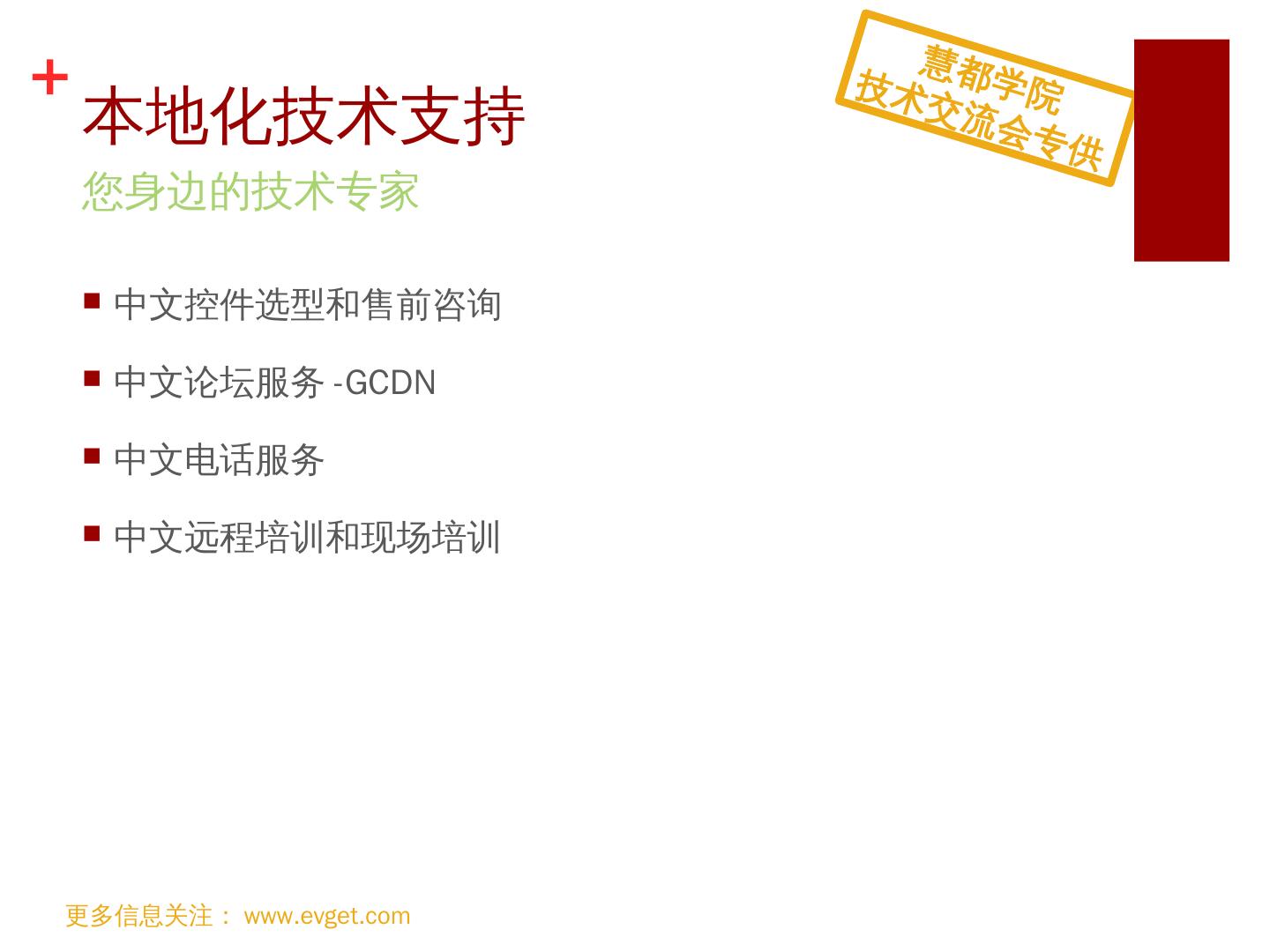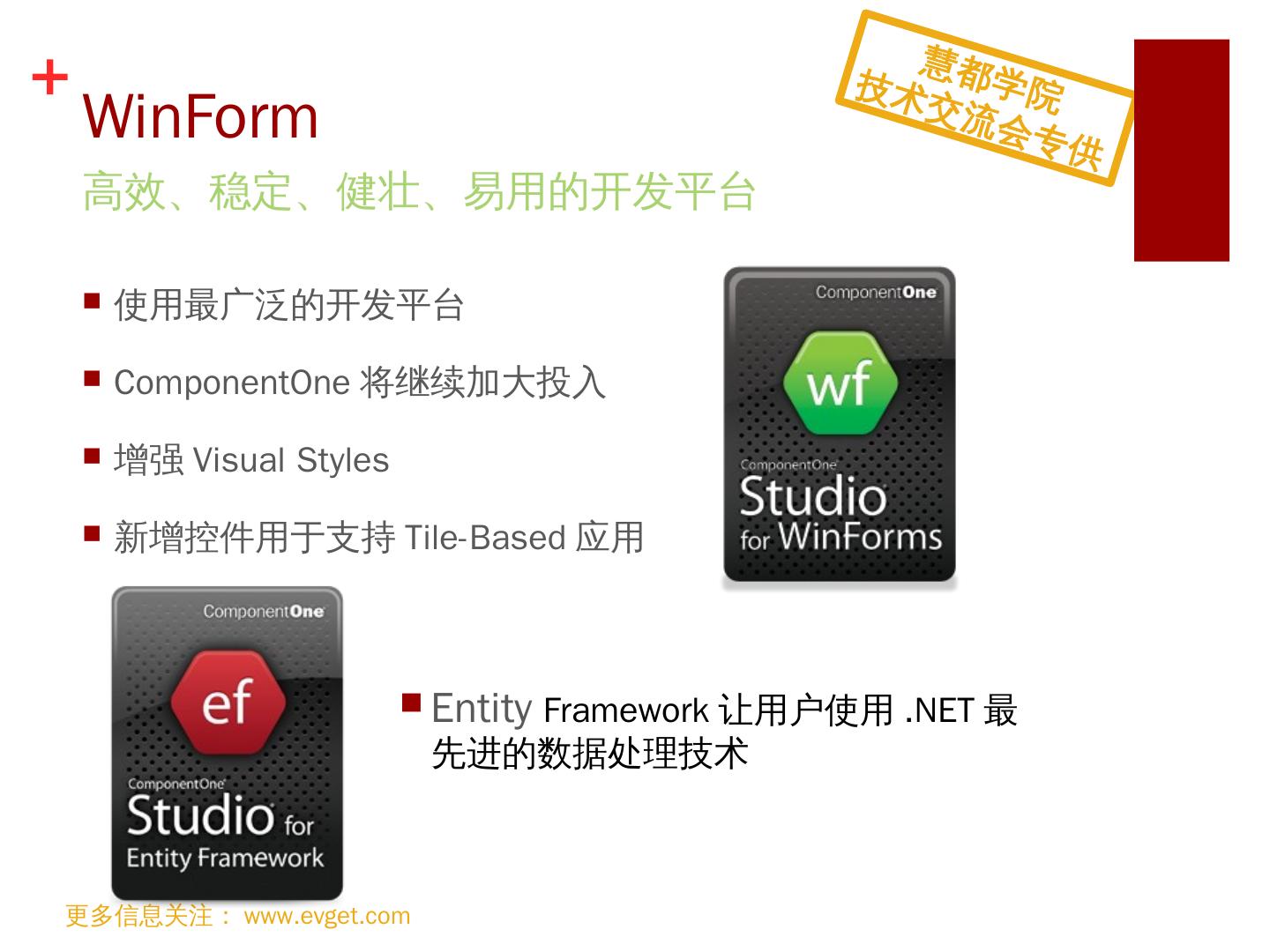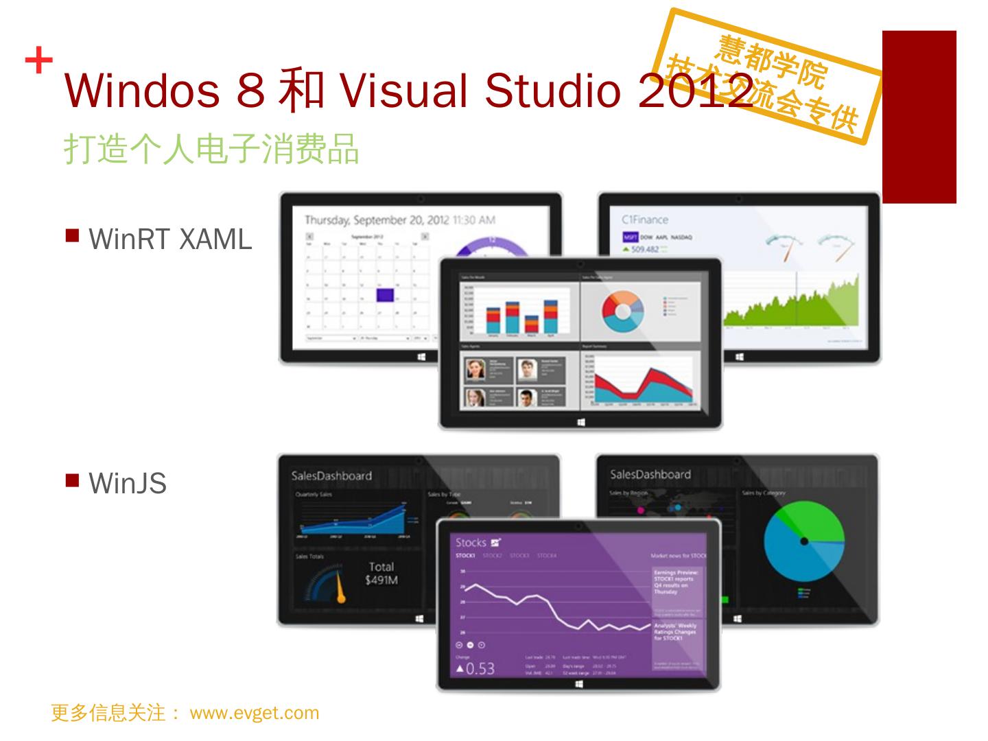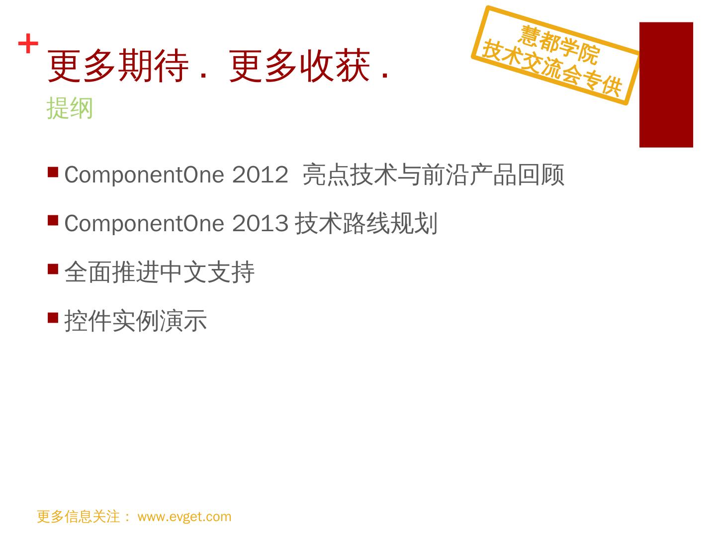 支持HTML5; 跨浏览器支持; 便捷切换主题; 支持MVVM KnockoutJS; 支持iCal格式. 引领. Web. 前端控件潮流. 更多信息关注:www.evget.com. 慧都学院. 技术交流会 ...
