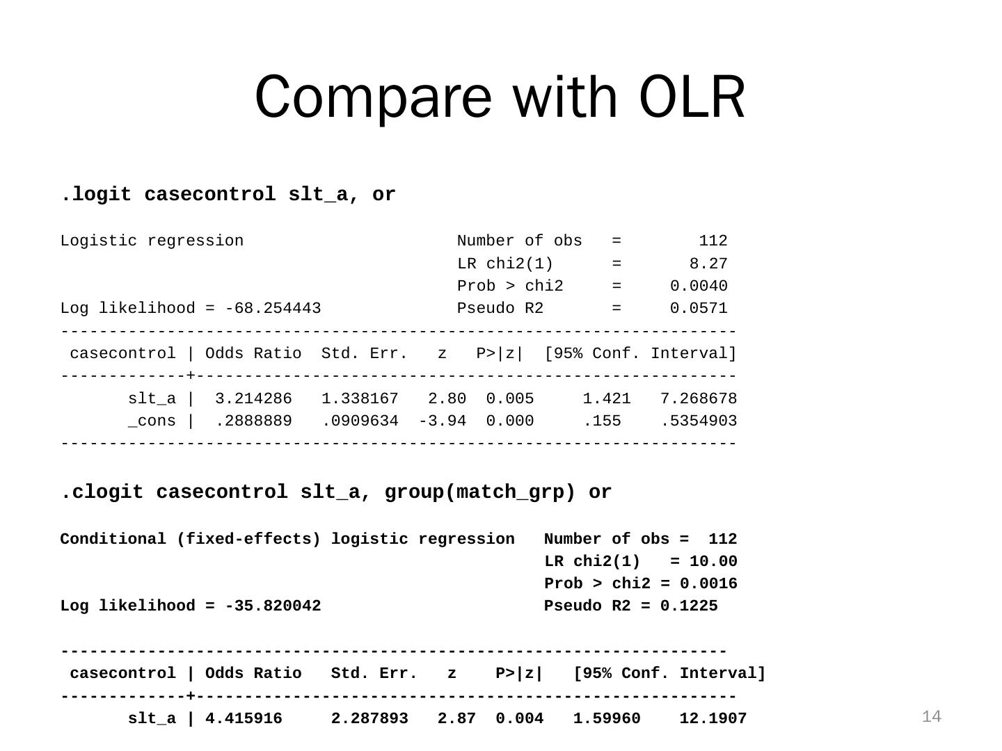 Conditional logistic regression. Matched case-control study design. Types of matching: one (1:1) or several (1:m) controls matched to each case; Exposure ...