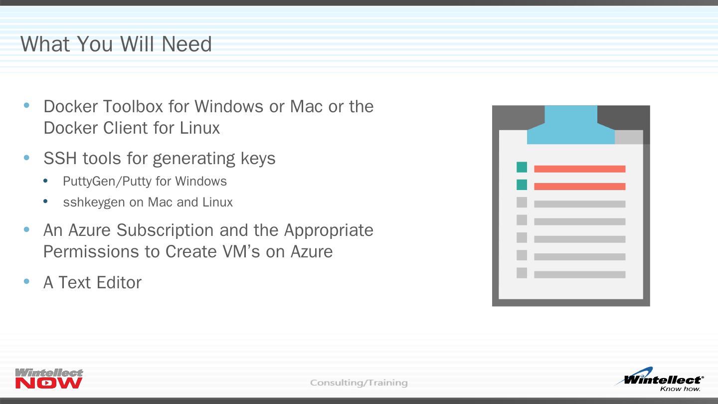 Docker Toolbox for Windows or Mac or the Docker Client for Linux; SSH tools for generating keys. PuttyGen/Putty for Windows; sshkeygen on Mac and Linux.