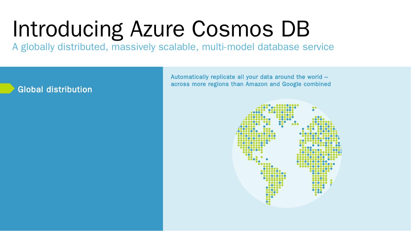 16 .Introducing Azure Cosmos DB A globally distributed, massively scalable, multi-model database service Global distribution Automatically replicate all your data around the world – across more regions than Amazon and Google combined