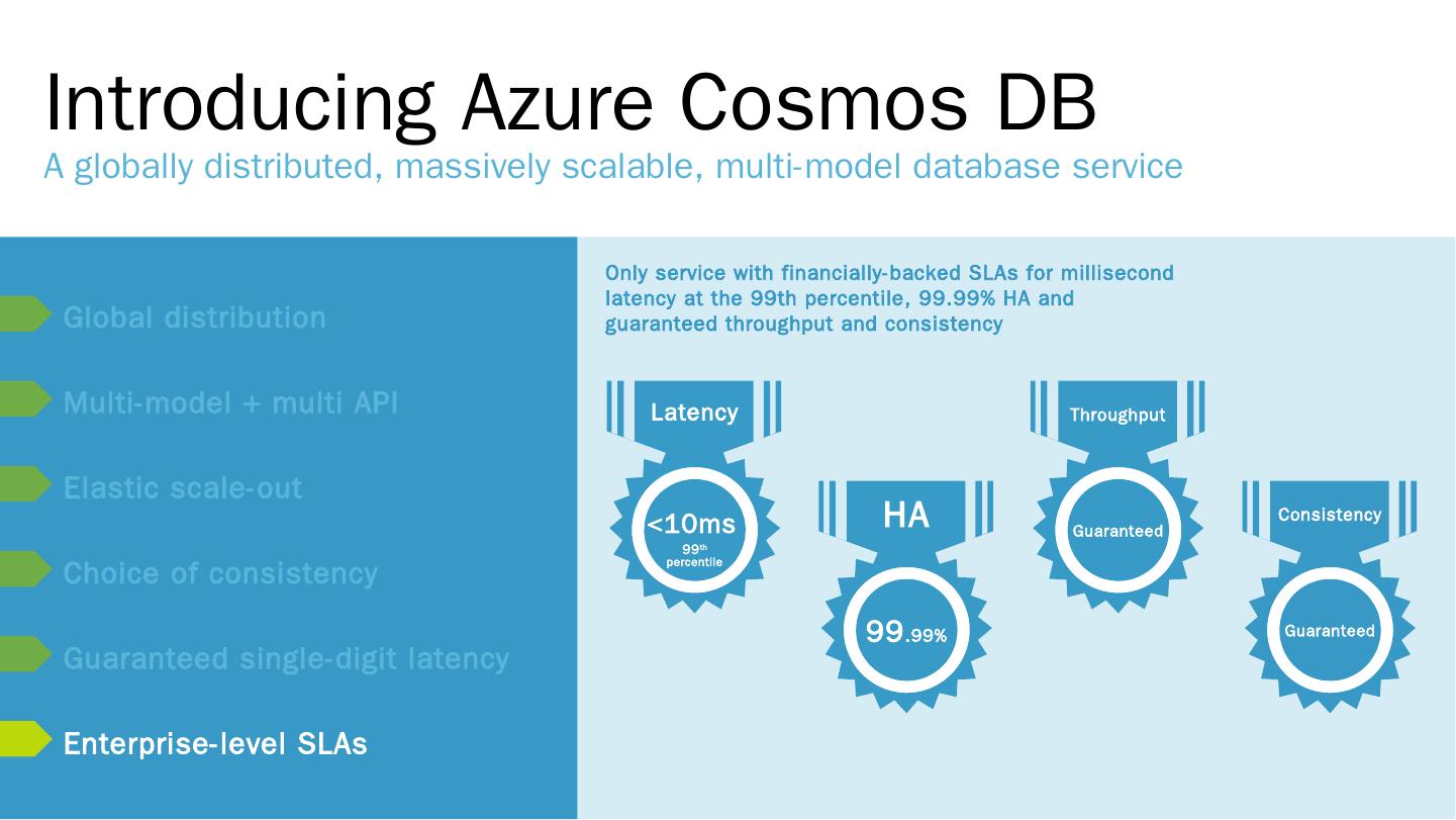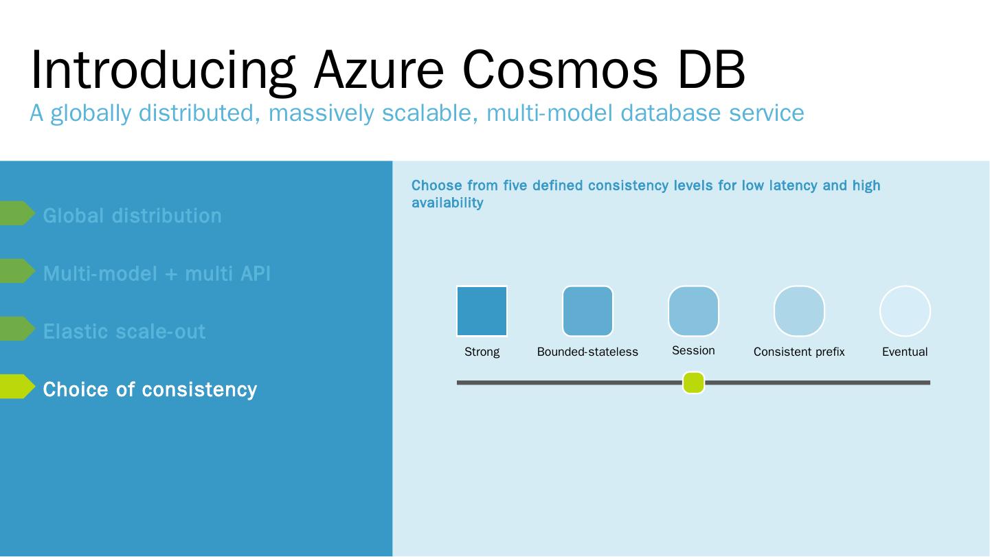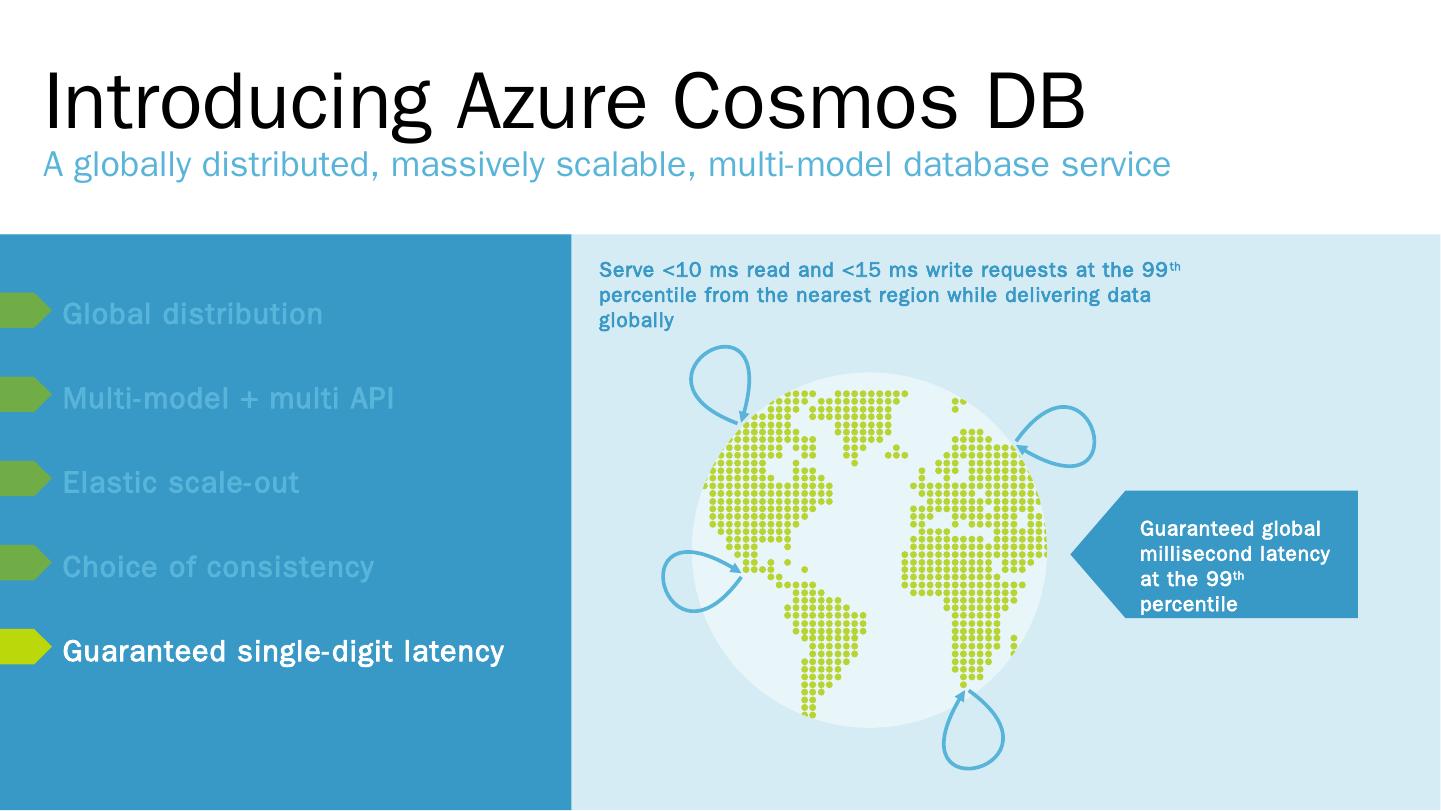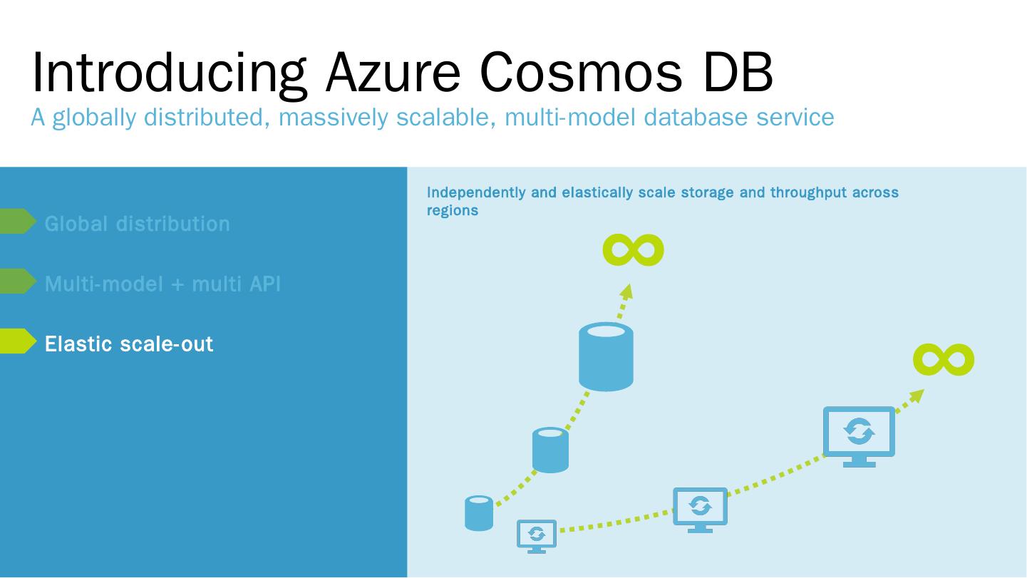 14 .Introducing Azure Cosmos DB A globally distributed, massively scalable, multi-model database service Global distribution Multi-model + multi API Elastic scale-out Choice of consistency Guaranteed single-digit latency Enterprise-level SLAs