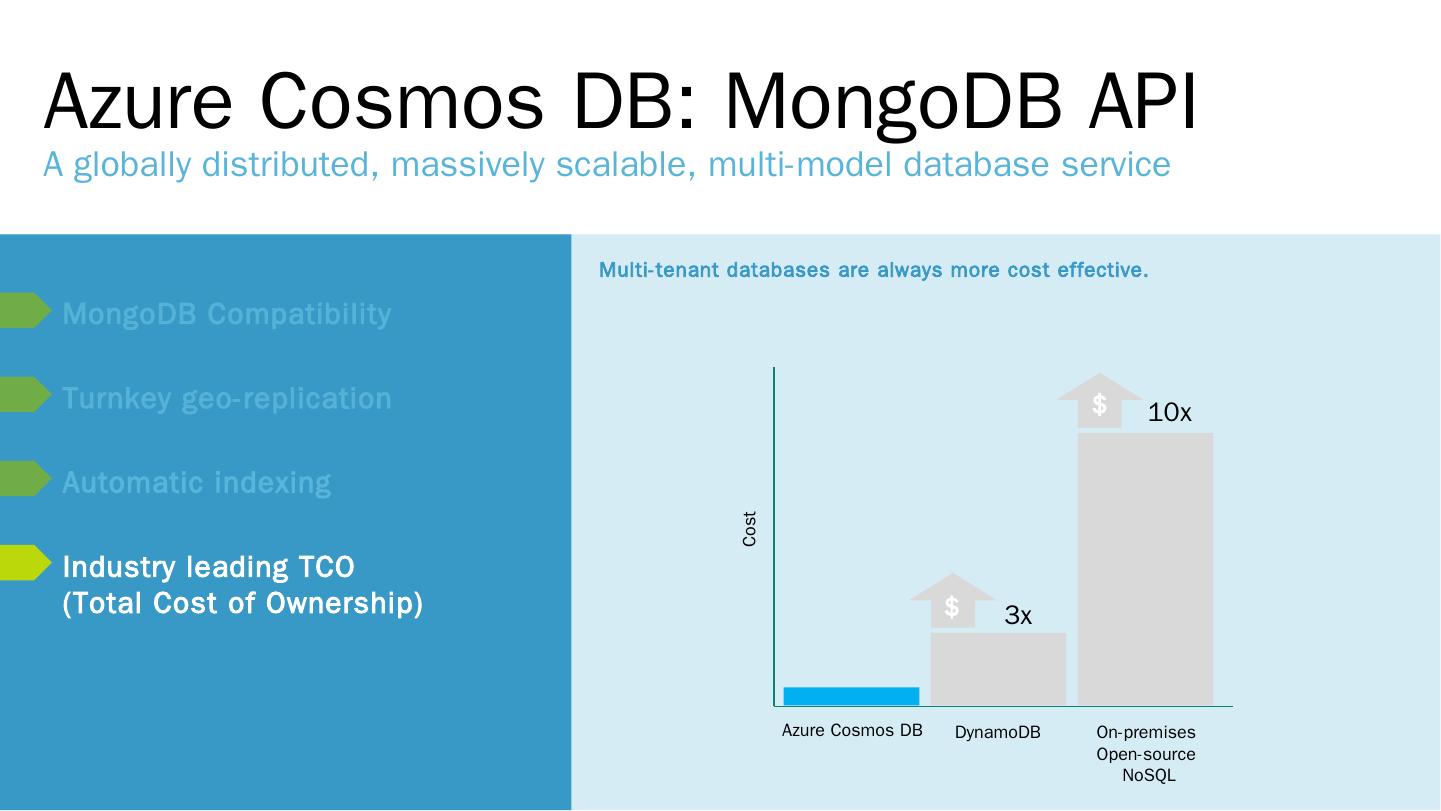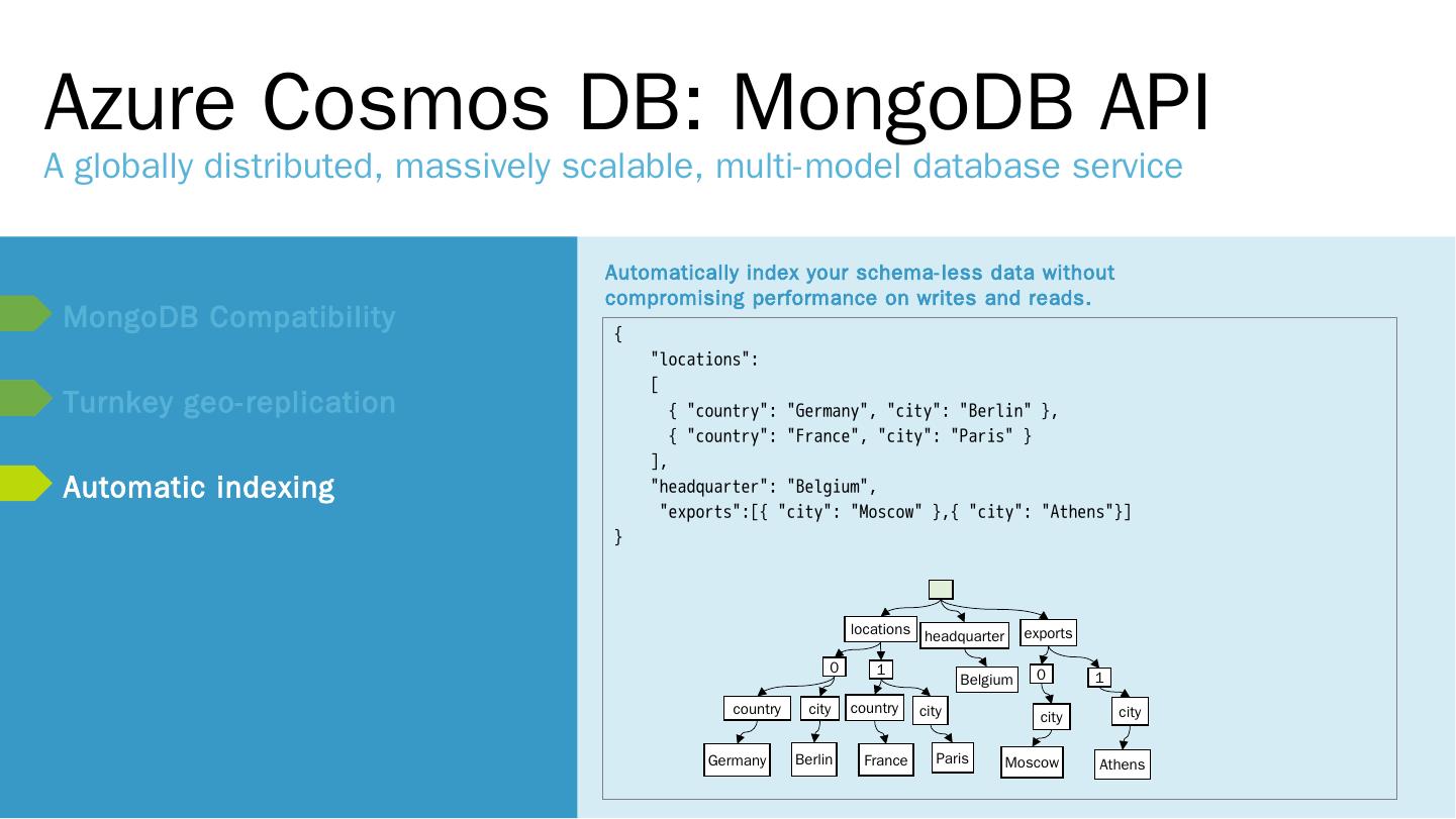 15 .Azure Cosmos DB: MongoDB API A globally distributed, massively scalable, multi-model database service MongoDB Compatibility Turnkey geo-replication Automatically index your schema-less data without compromising performance on writes and reads. { "locations": [ { "country": "Germany", "city": "Berlin" }, { "country": "France", "city": "Paris" } ], "headquarter": "Belgium", "exports":[{ "city": "Moscow" },{ "city": "Athens"}] } locations headquarter exports 0 1 country Germany city Berlin country France city Paris city Moscow city Athens Belgium 0 1 Automatic indexing