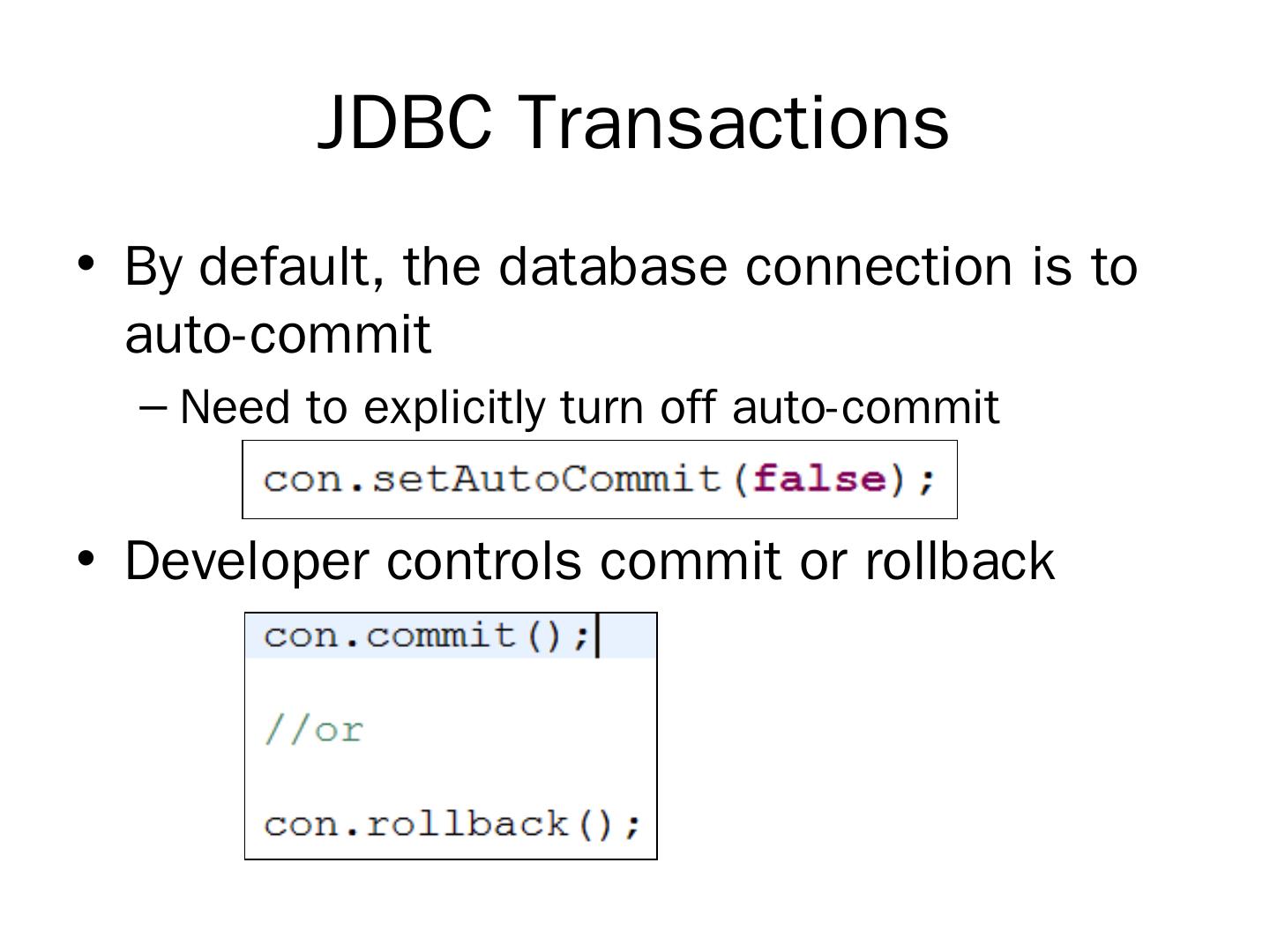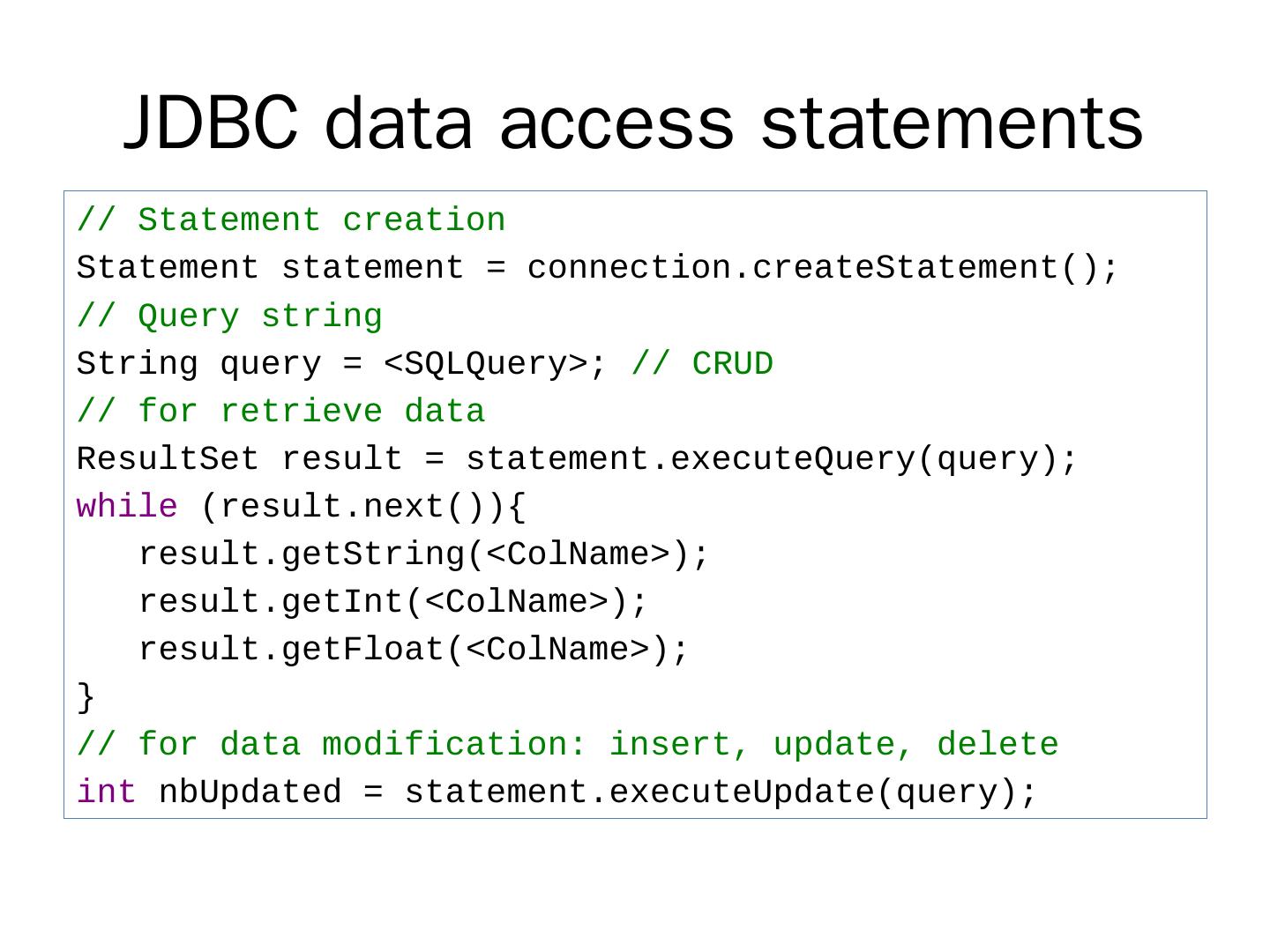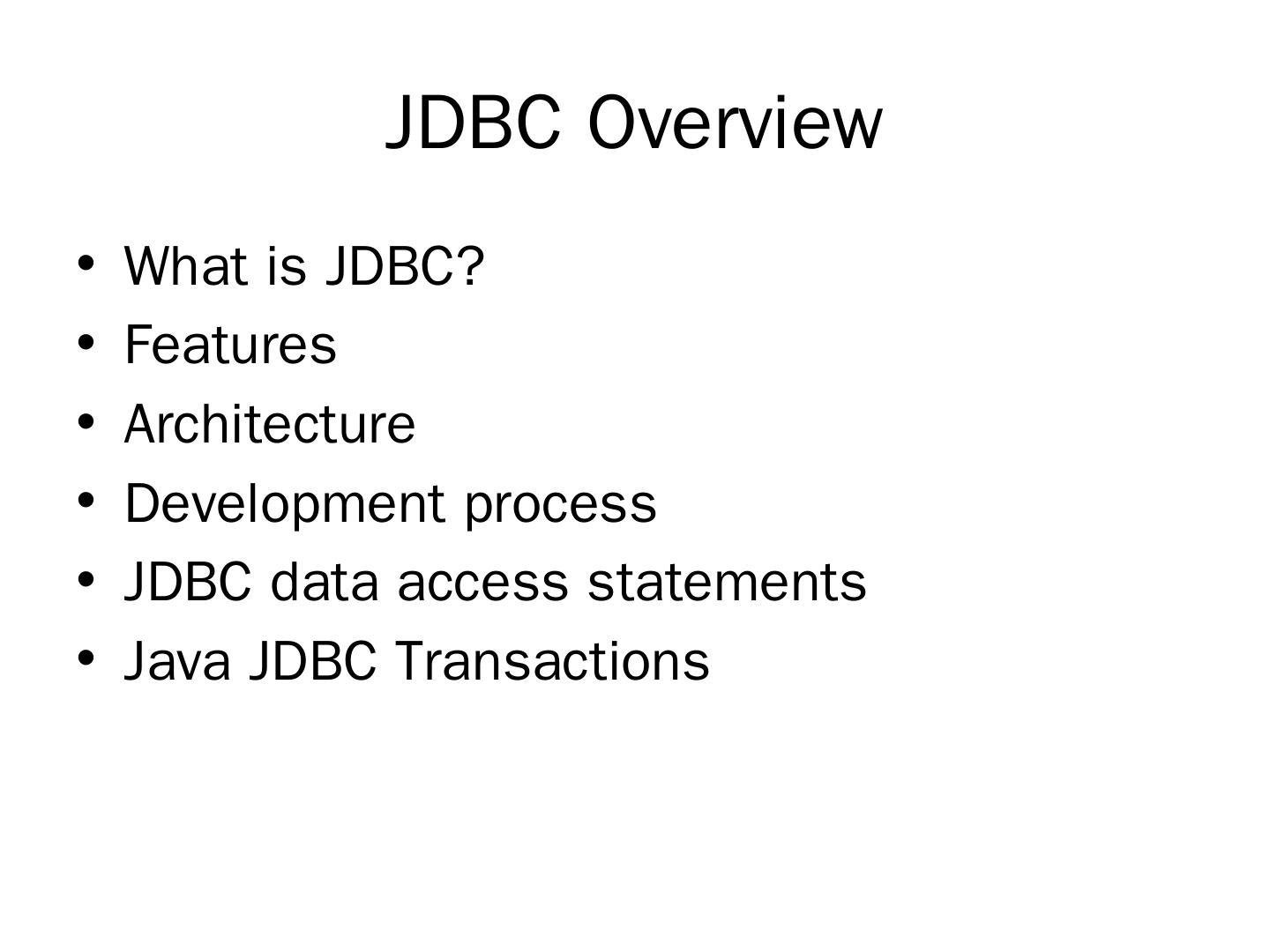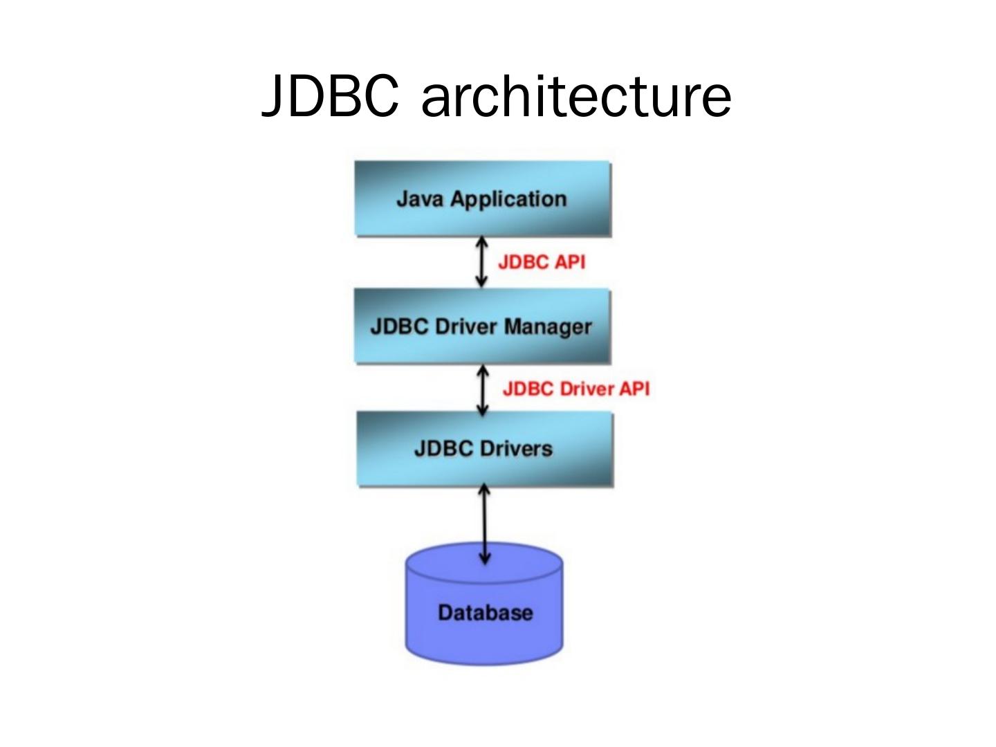 What is JDBC? JDBC. Allows a Java application to connect to a relational database. The major databases are supported such as Oracle, Microsoft SQL Server, ...