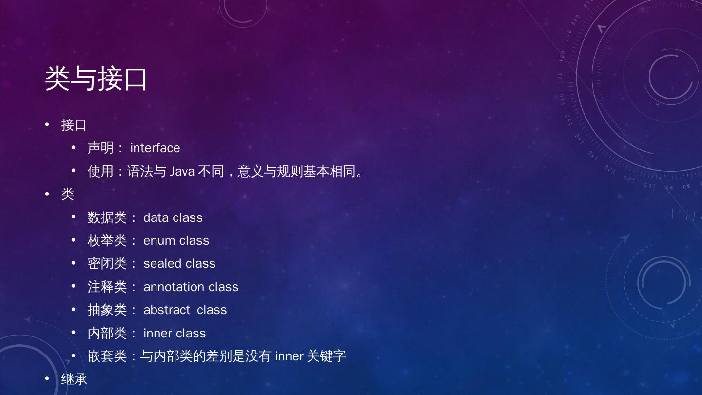 数据类:data class; 枚举类:enum class; 密闭类:sealed class; 注释类:annotation class; 抽象 ... 内联函数; 集合; 代理; 反射; 泛型; 协程; 等等.