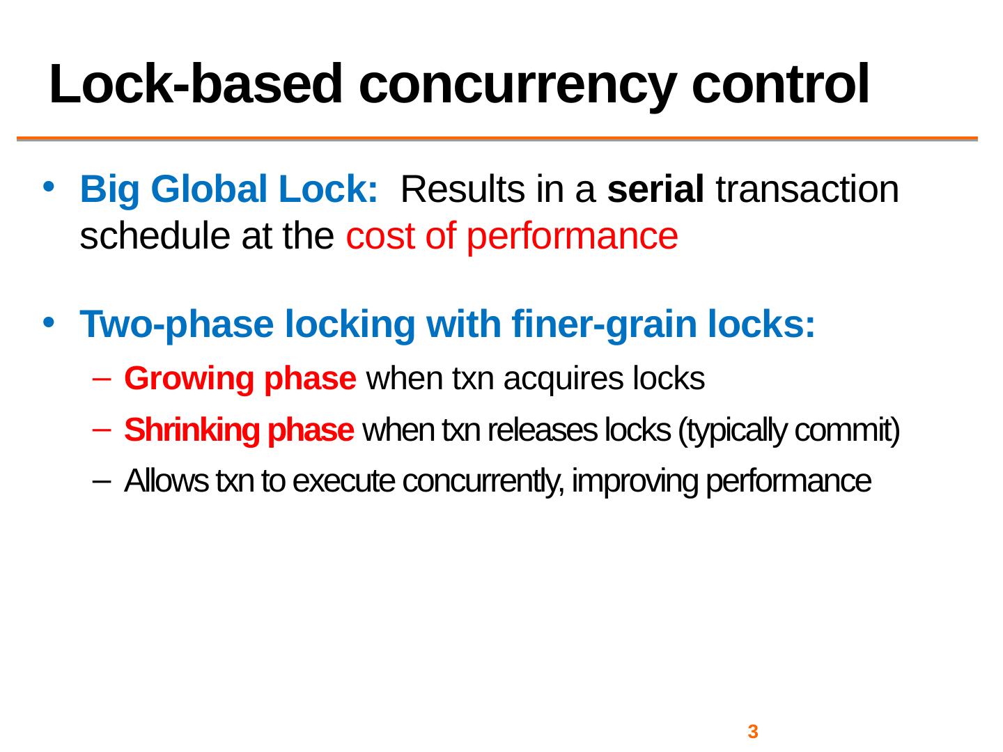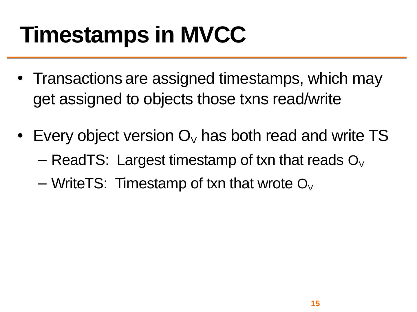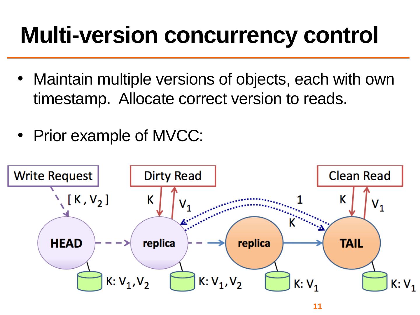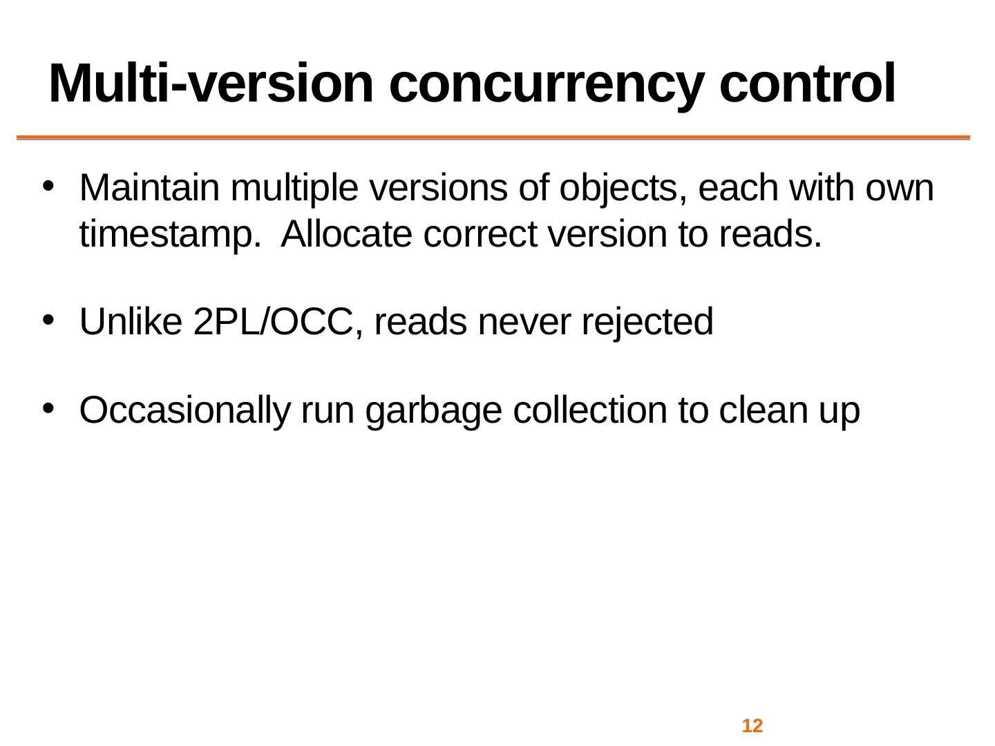 Prior example of MVCC: 11. Multi-version concurrency control. Maintain multiple versions of objects, each with own timestamp. Allocate correct version to reads.