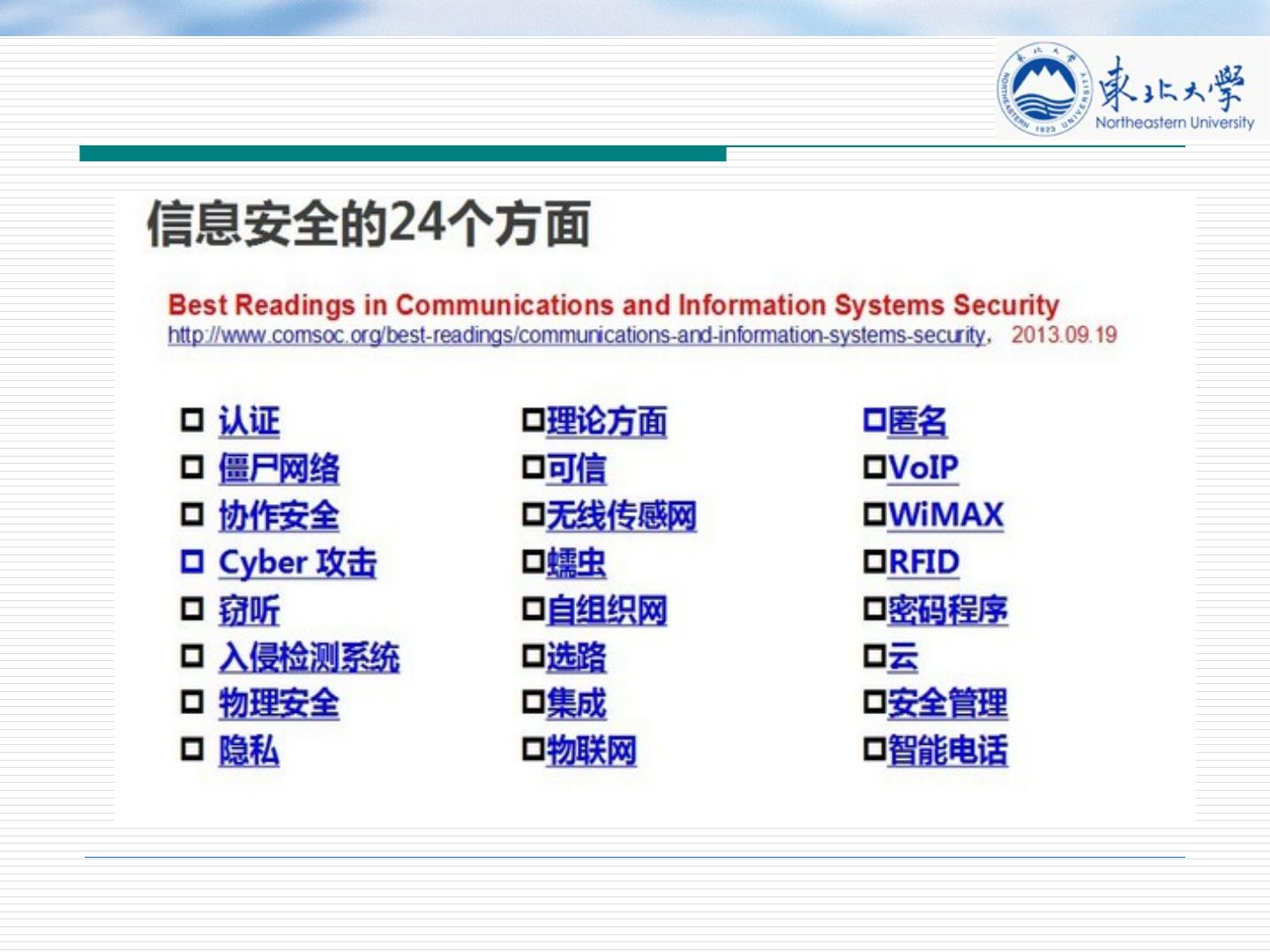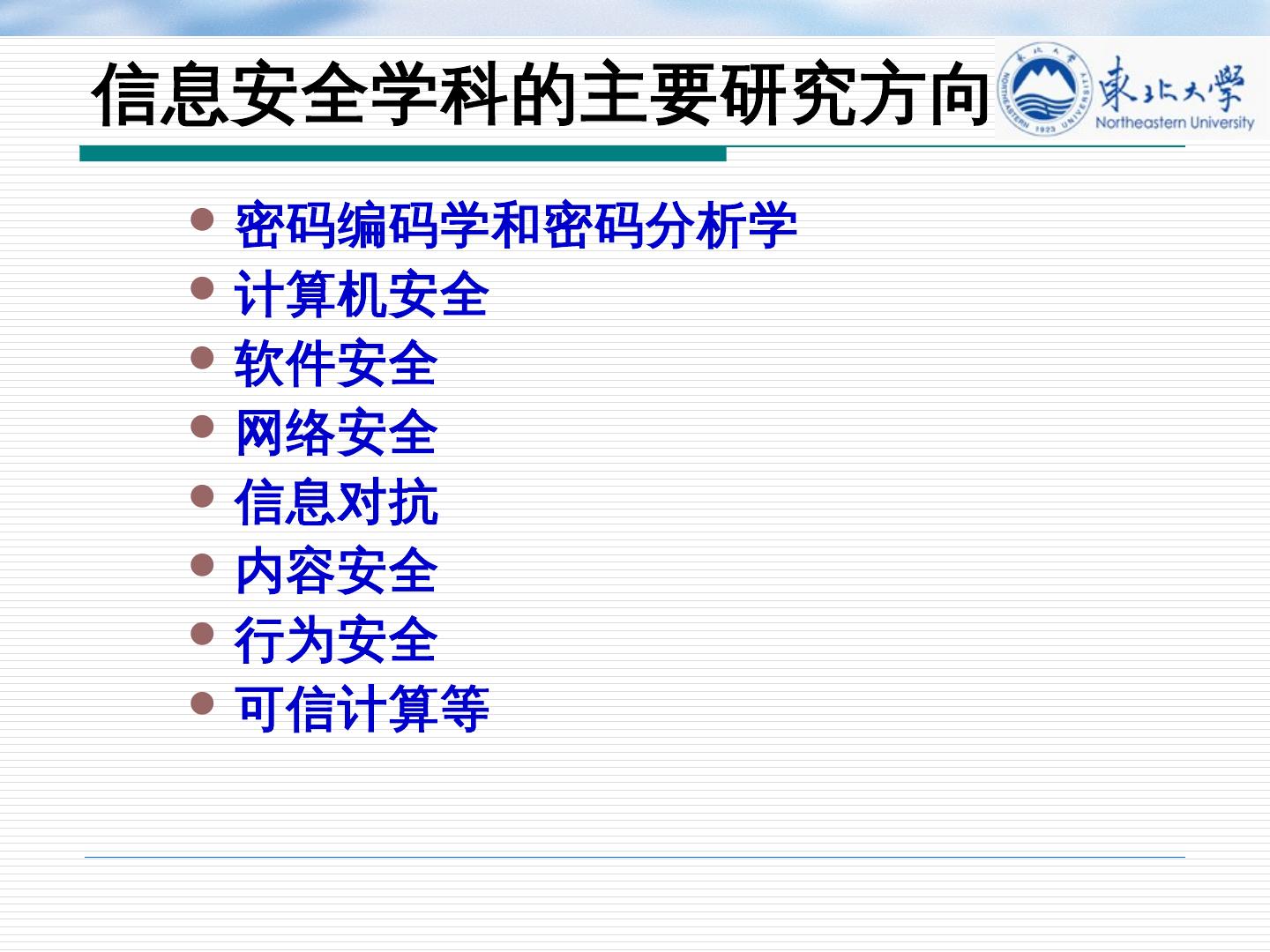 6 .信息安全学科的主要研究方向 密码编码学和密码分析学 计算机安全 软件安全 网络安全 信息对抗 内容安全 行为安全 可信计算等