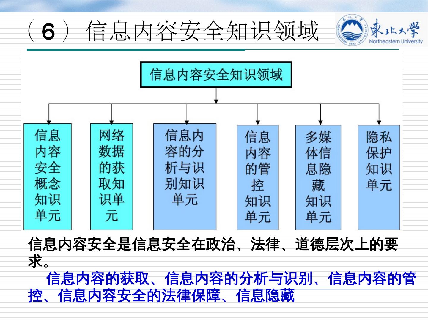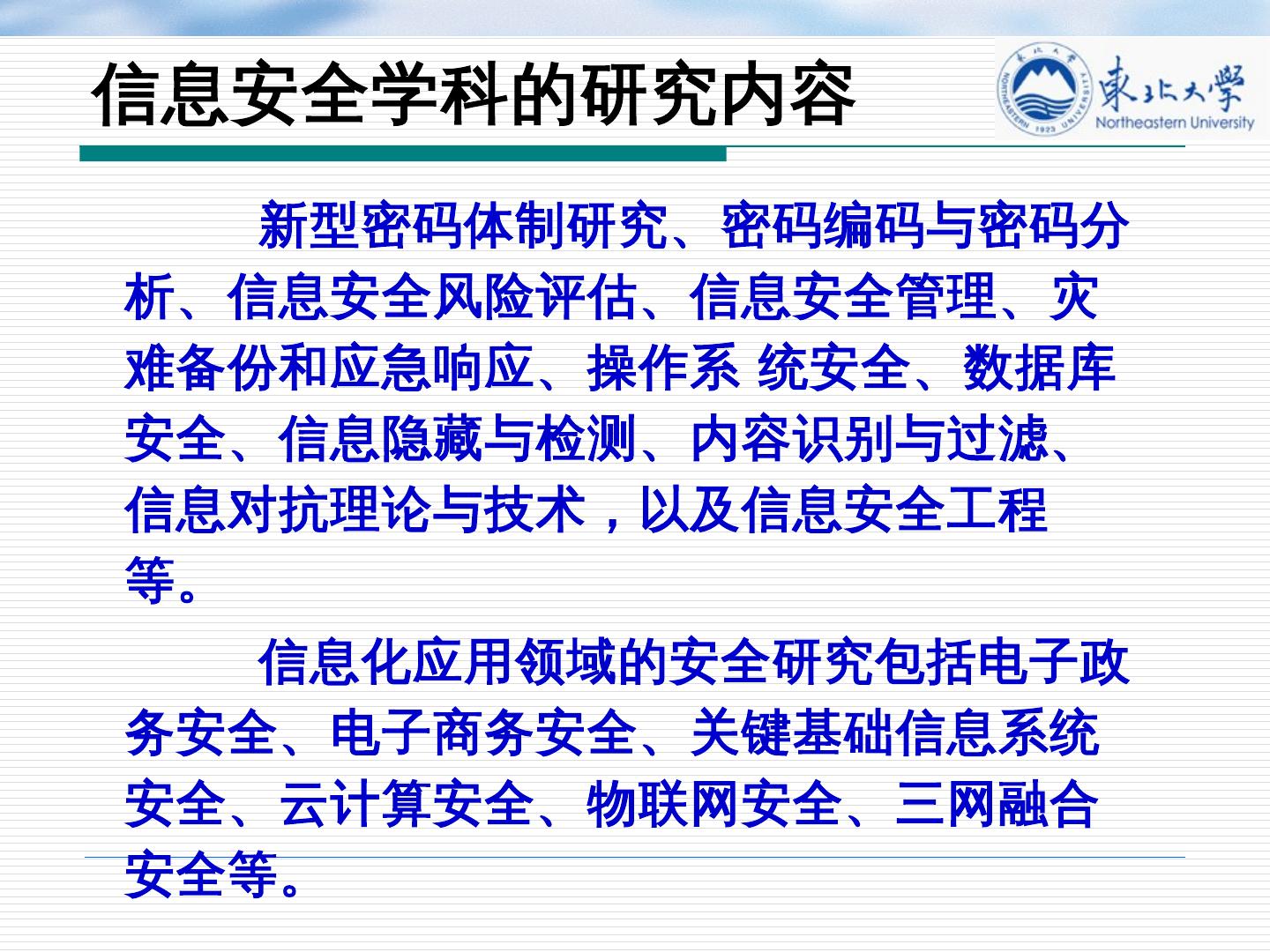 7 .信息安全学科 的研究内容 新型密码体制研究、密码编码与密码分析、信息安全风险评估、信息安全管理、灾难备份和应急响应、操作 系 统 安全、数据库安全、信息隐藏与检测、内容识别与过滤、信息对抗理论与技术,以及信息安全工程等。 信息化应用领域的安全研究包括电子政务安全、电子商务安全、关键基础信息系统安全、云计算安全、物联网安全、三网融合安全等。