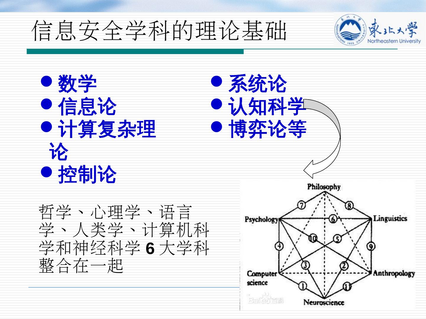 8 .信息安全学科的理论基础 数学 信息论 计算复杂理论 控制论 系统论 认知科学 博弈论等 哲学 、心理学 、语言学、人类学、计算机科学和神经科学 6 大学科整合在一起