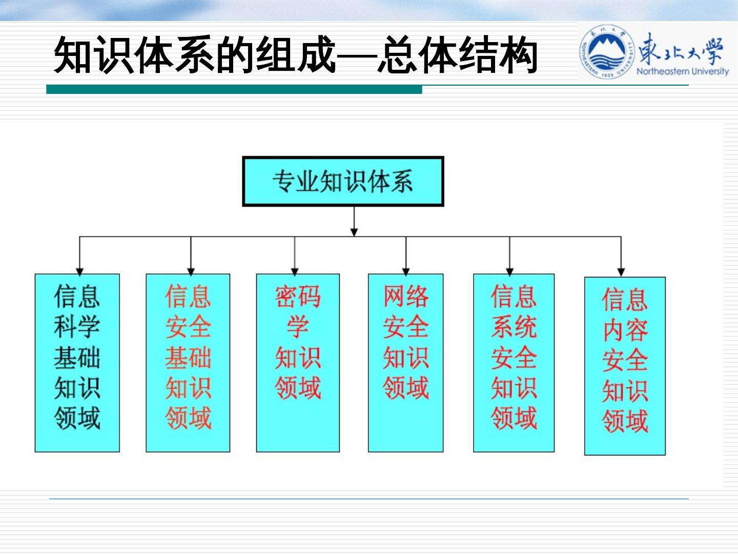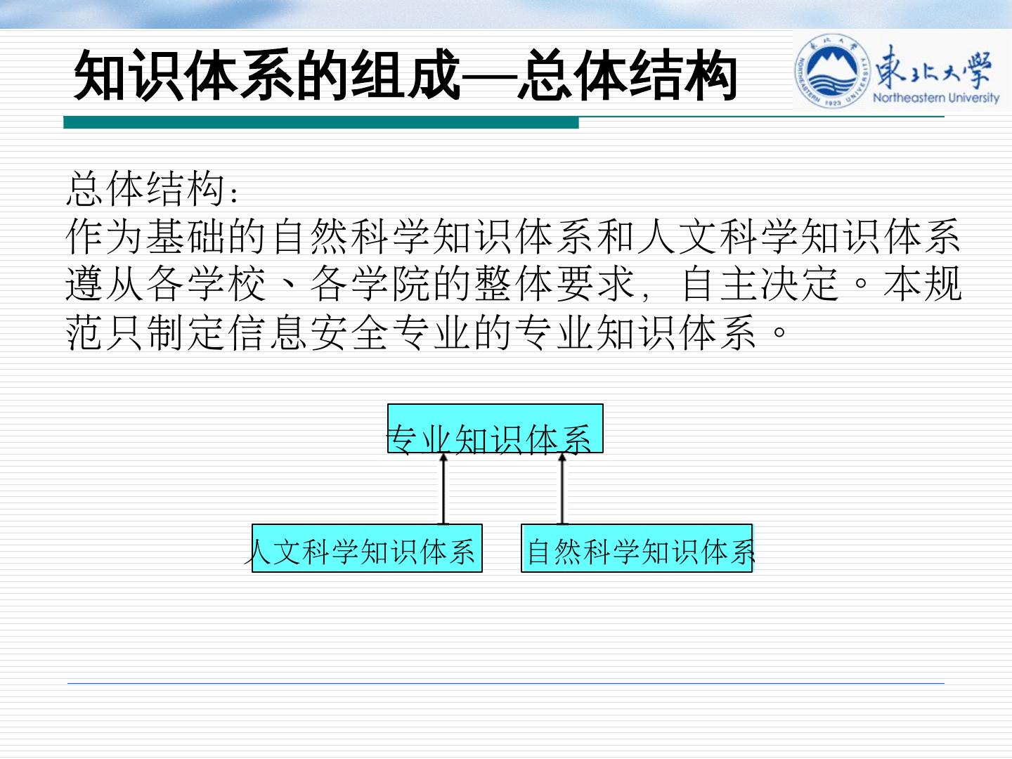 12 .知识体系的 组成 — 总体结构 总体结构 : 作为基础的自然科学知识体系和人文科学知识体系 遵从各学校、各学院的整体要求,自主决定。本规 范只制定信息安全专业的专业知识体系 。 自然科学知识体系 人文科学知识体系 专业知识体系