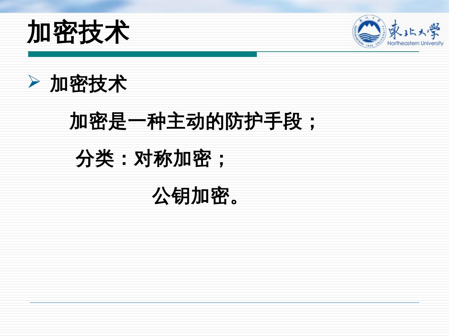 17 .加密技术 加密技术 加密是一种主动的防护手段; 分类:对称加密; 公钥加密。