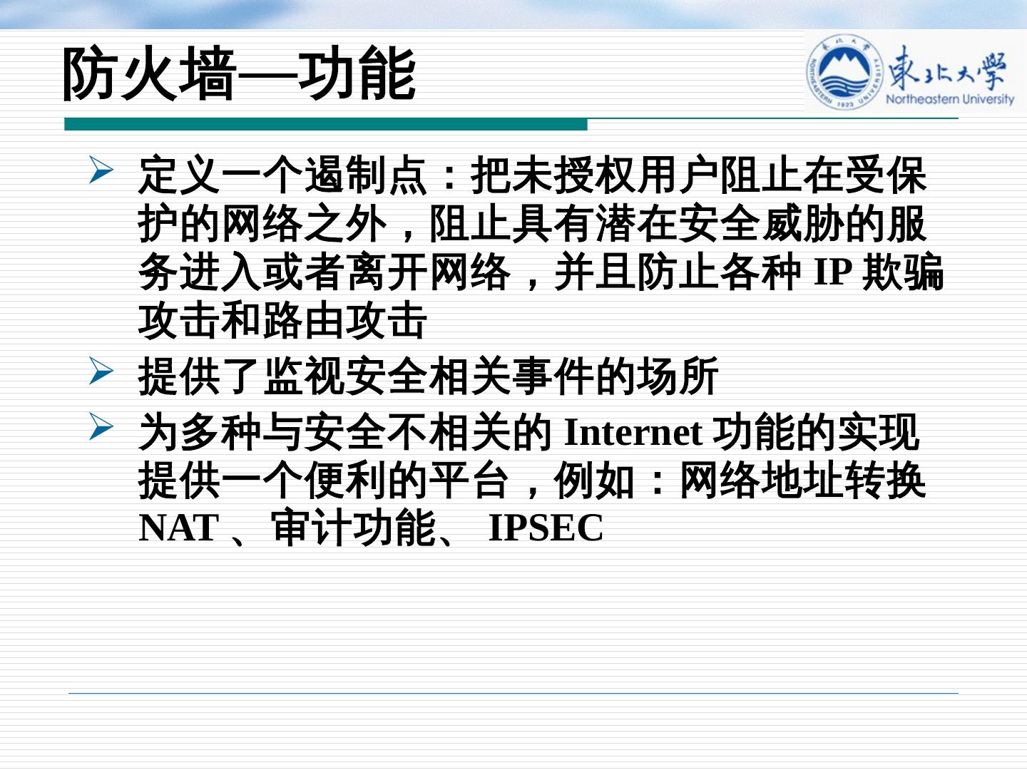 21 .防火墙 — 功能 定义 一个遏制点:把未授权用户阻止在受保护的网络之外,阻止具有潜在安全威胁的服务进入或者离开网络,并且防止各种 IP 欺骗攻击和路由攻击 提供了监视安全相关事件的场所 为多种与安全不相关的 Internet 功能的实现提供一个便利的平台,例如:网络地址转换 NAT 、审计功能、 IPSEC