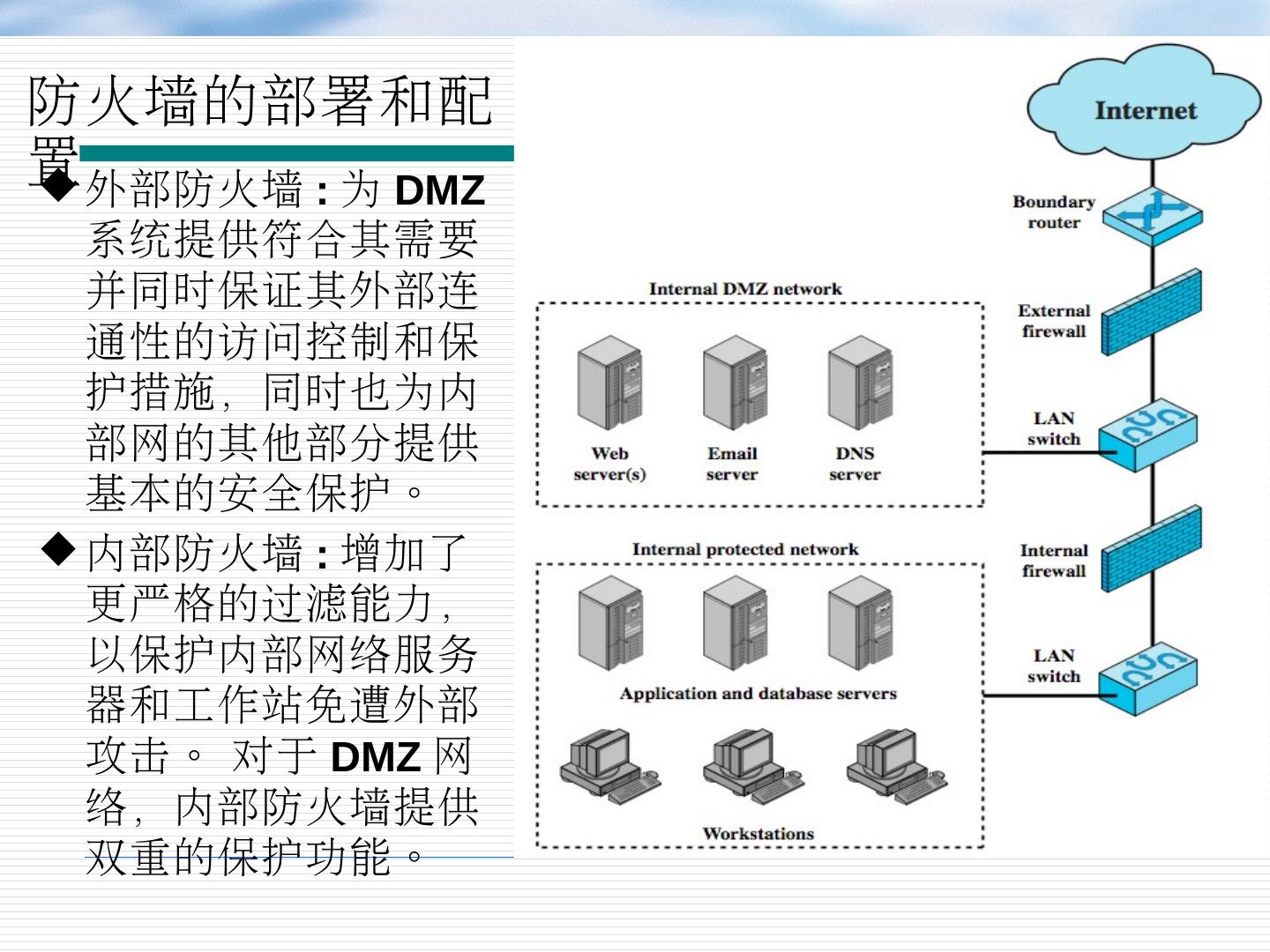 22 .防火墙的部署和配置 外部 防火墙 : 为 DMZ 系统提供符合其需要并同时保证其外部连通性的访问控制和保护措施,同时也为内部网的其他部分提供基本的安全保护 。 内部防火墙 : 增加 了更严格的过滤能力,以保护内部网络服务器和工作站免遭外部攻击 。 对于 DMZ 网络,内部防火墙提供双重的保护功能 。
