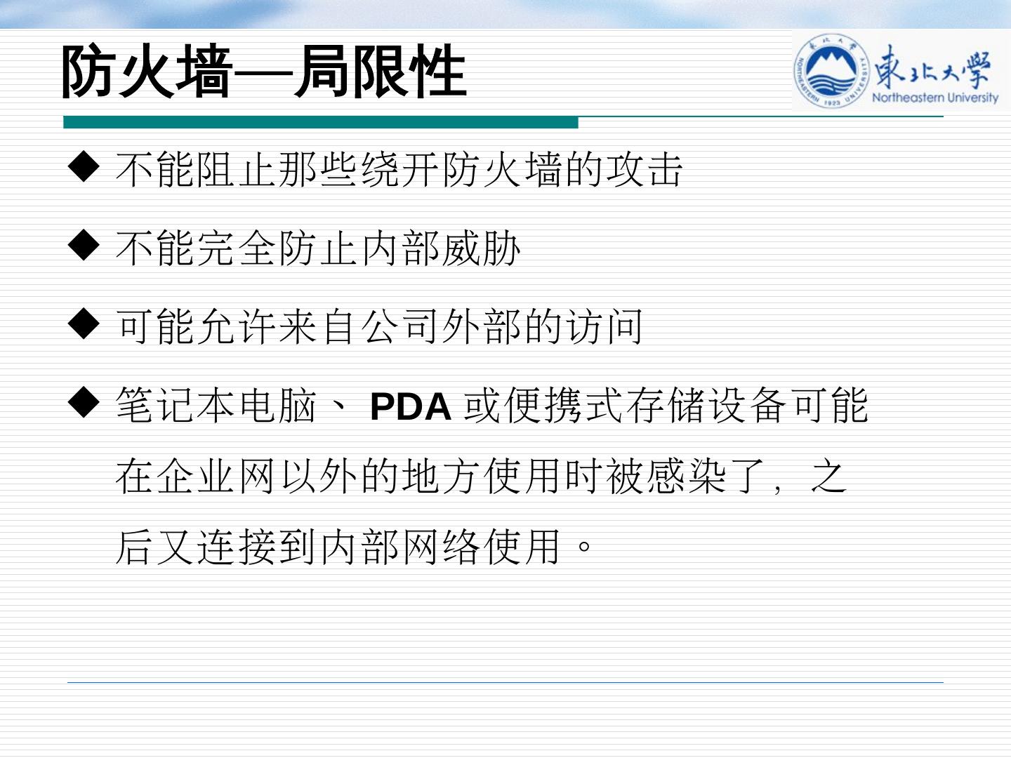23 .防火墙 — 局限性 不能 阻止那些绕开防火墙的攻击 不能完全防止内部威胁 可能允许来自公司外部的访问 笔记本电脑、 PDA 或便携式存储设备可能在企业网以外的地方使用时被感染了,之后又连接到内部网络使用。