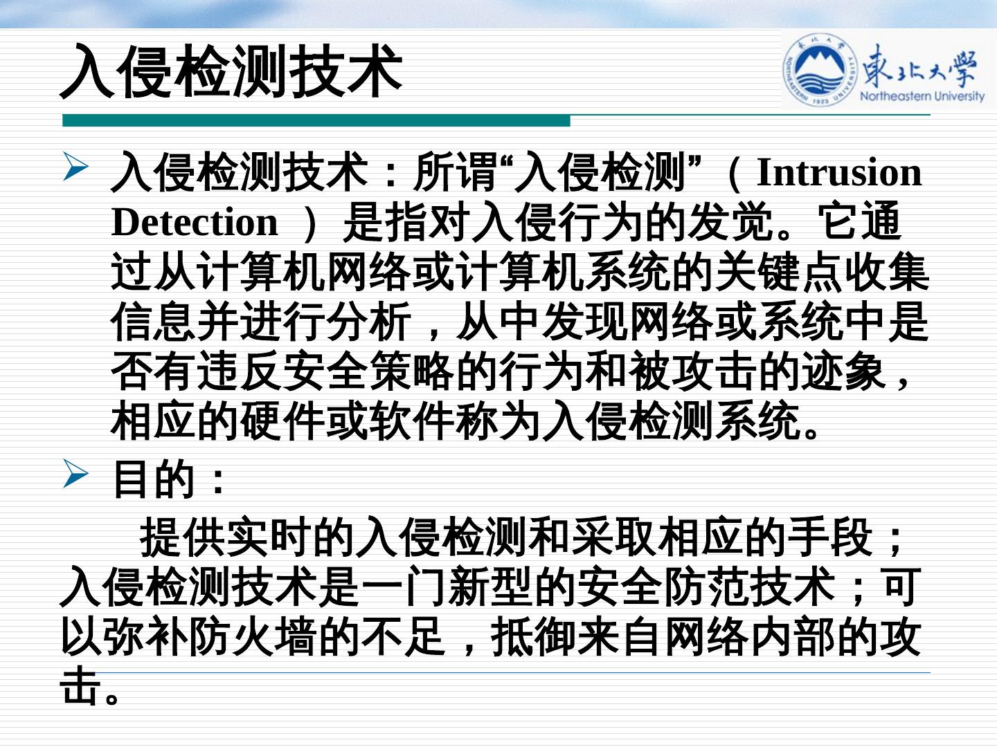 24 .入侵检测技术 入侵检测 技术:所谓“入侵检测”( Intrusion Detection ) 是 指对 入侵行为的发觉。它通过从计算机网络或计算机系统的关键点收集信息并进行分析,从中发现网络或系统中是否有违反安全策略的行为和被攻击的 迹象 , 相应的硬件或软件称为入侵检测系统 。 目的: 提供实时的入侵检测和采取相应的手段;入侵检测技术是一门新型的安全防范技术;可以弥补防火墙的不足,抵御来自网络内部的攻击。