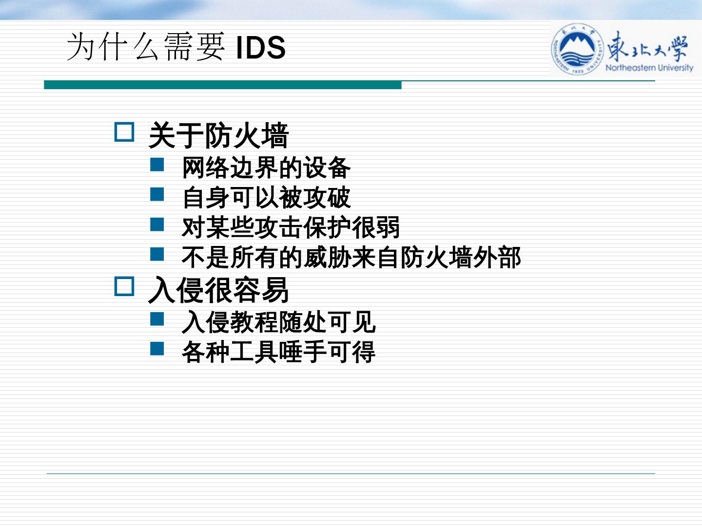 25 .为什么需要 IDS 关于防火墙 网络边界的设备 自身可以被攻破 对某些攻击保护很弱 不是所有的威胁来自防火墙外部 入侵很容易 入侵教程随处可见 各种工具唾手可得