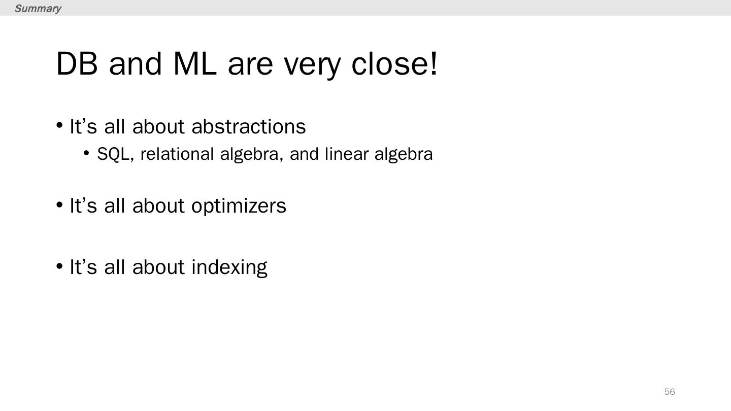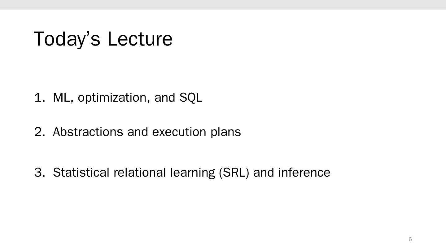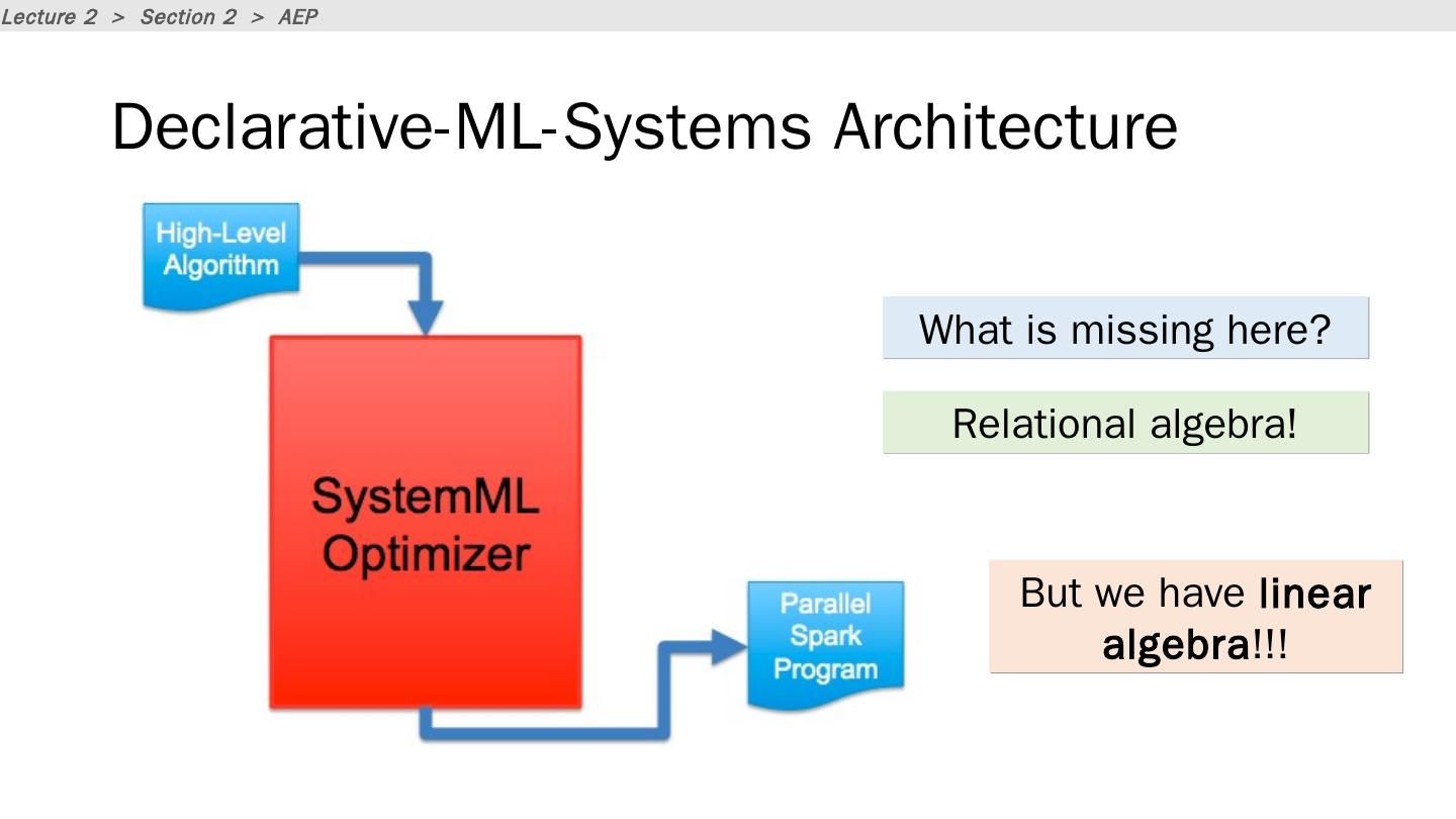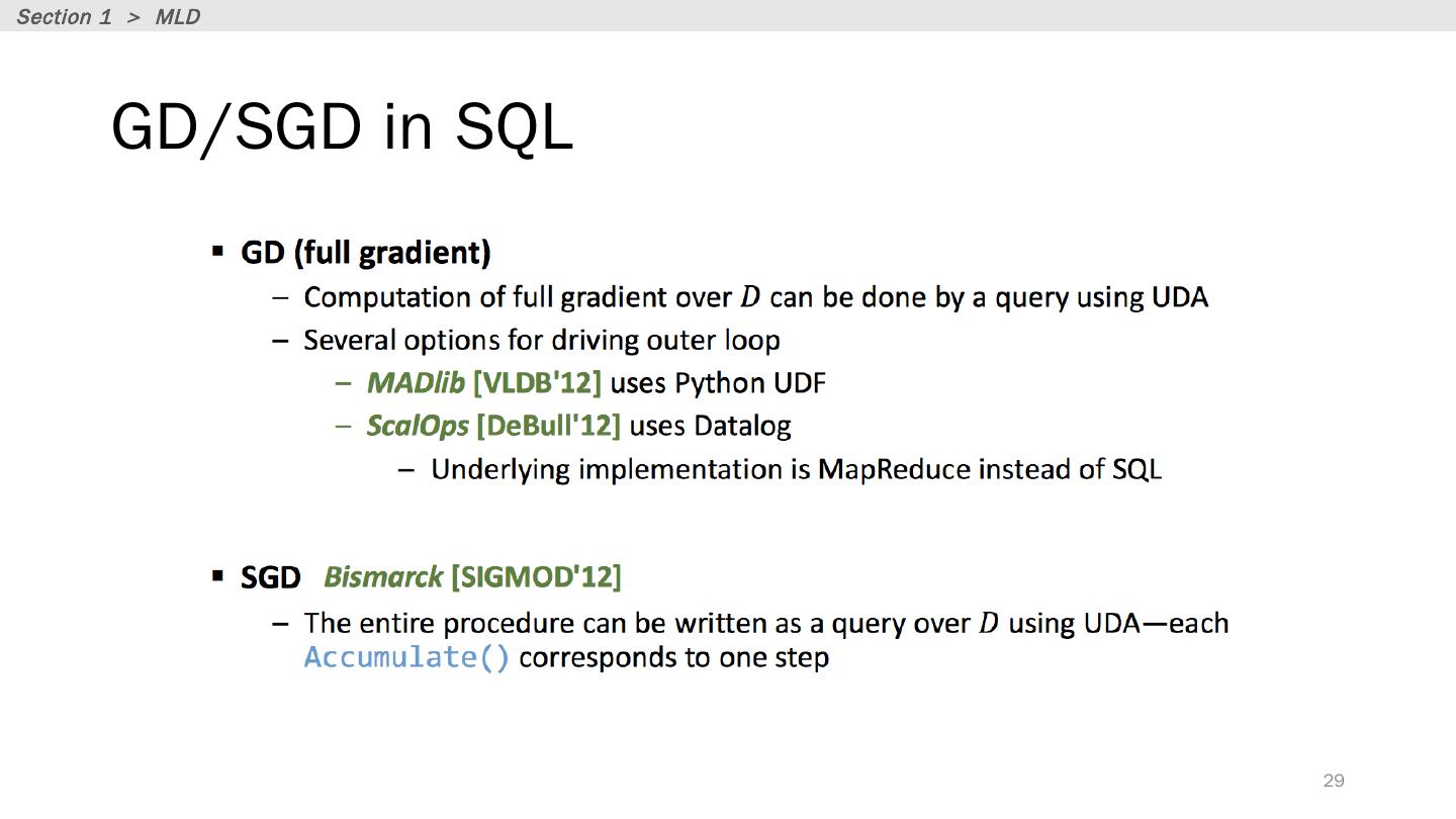 Slides reused from: SystemML Talk @ Spark Summit 2016 Kumar et al. @ SIGMOD 2017, Domingos @ CIKM 2013. Announcements. Waiting list: we are at ...