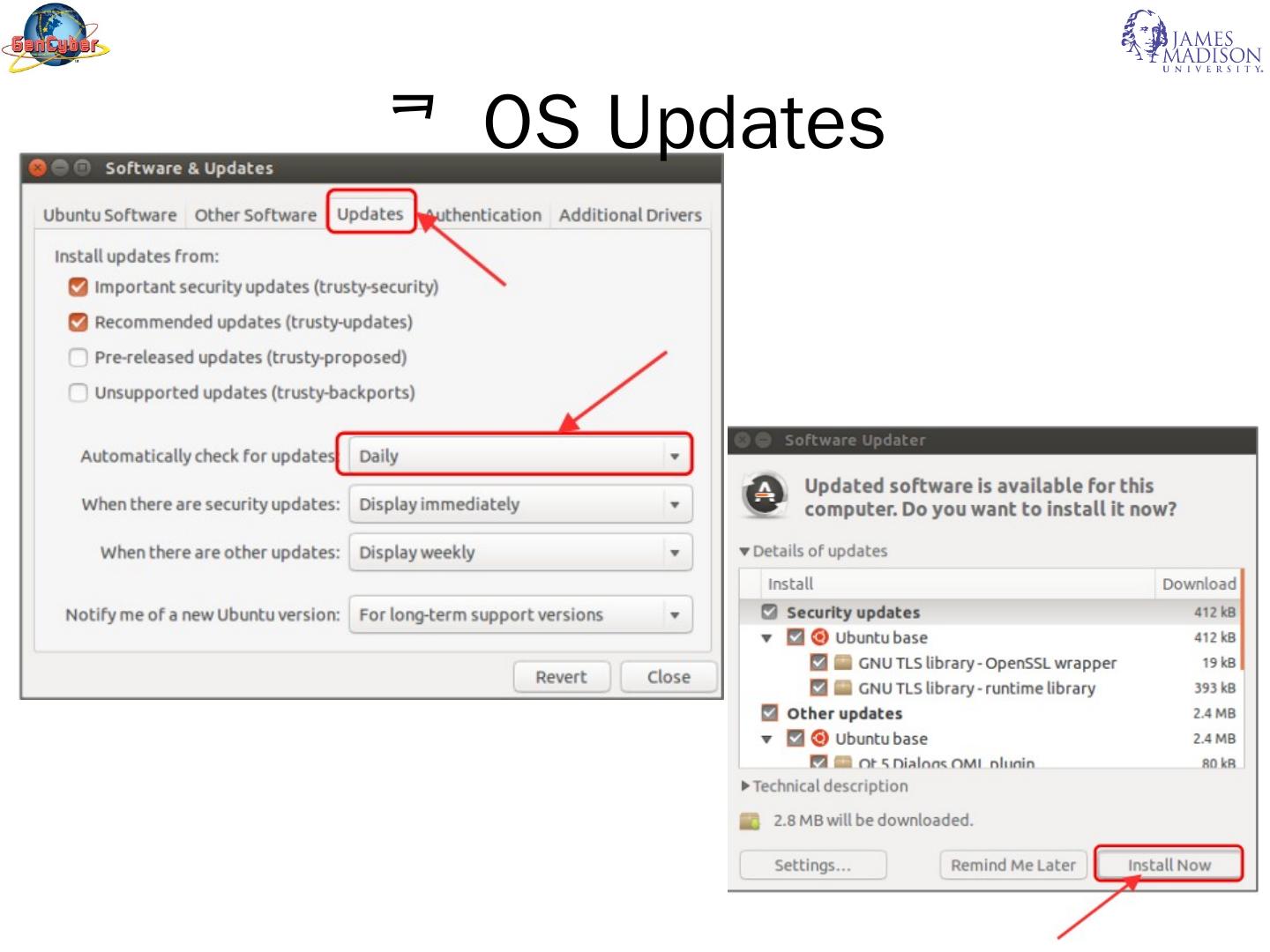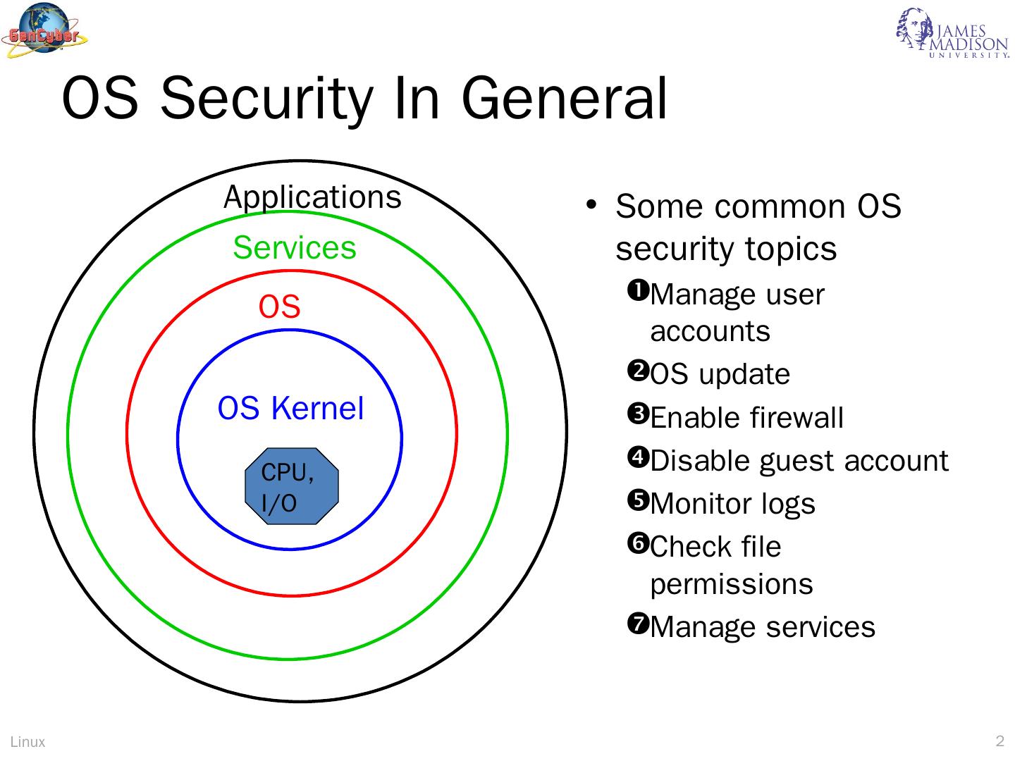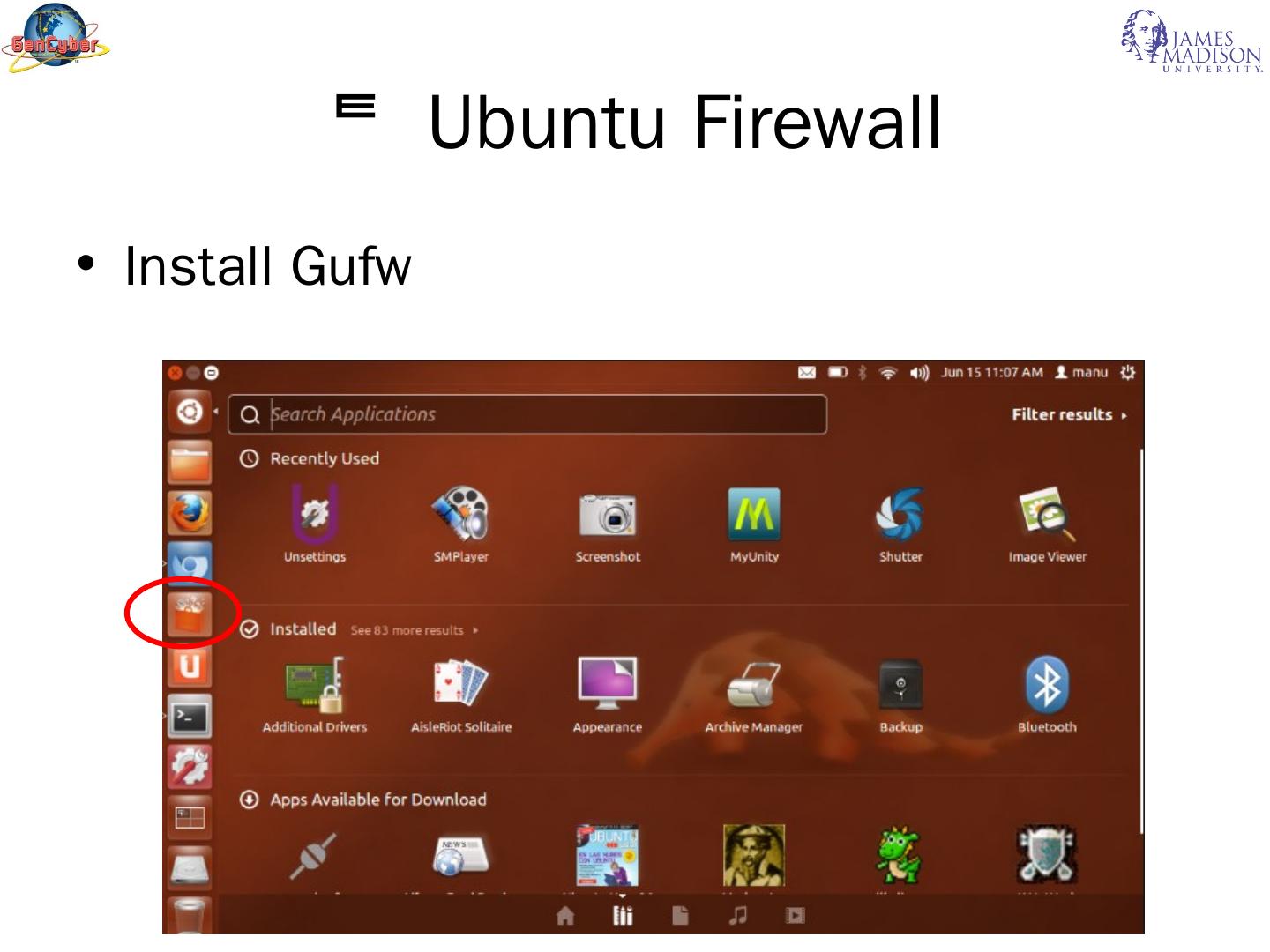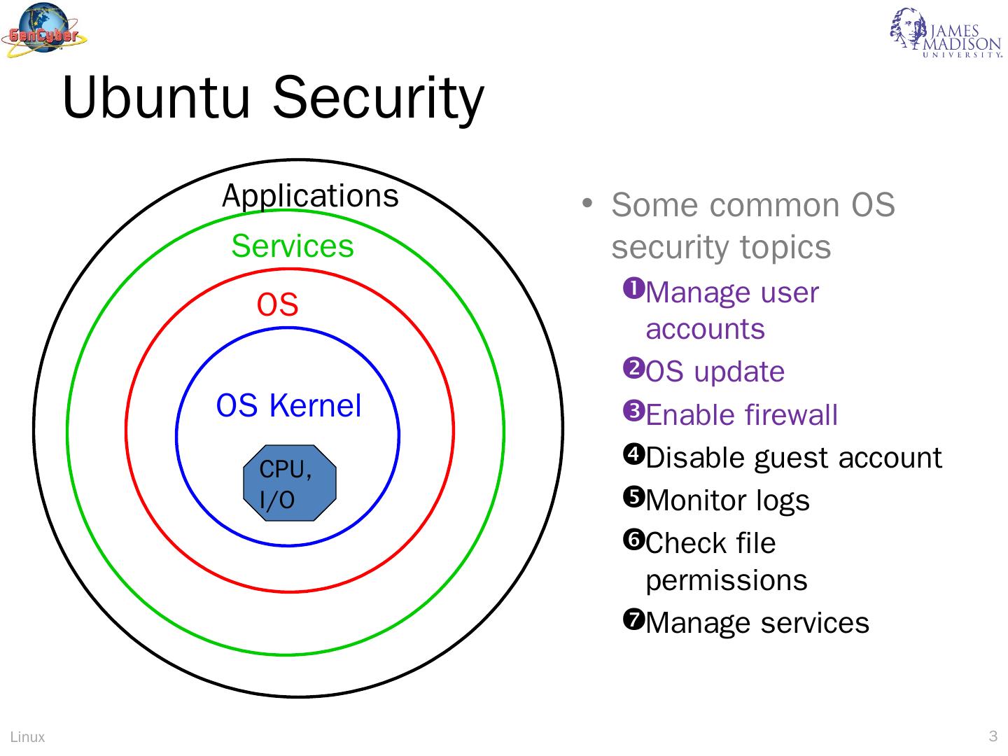Applications. Linux. Ubuntu Security. Some common OS security topics. Manage user accounts; OS update; Enable firewall; Disable guest account; Monitor logs ...