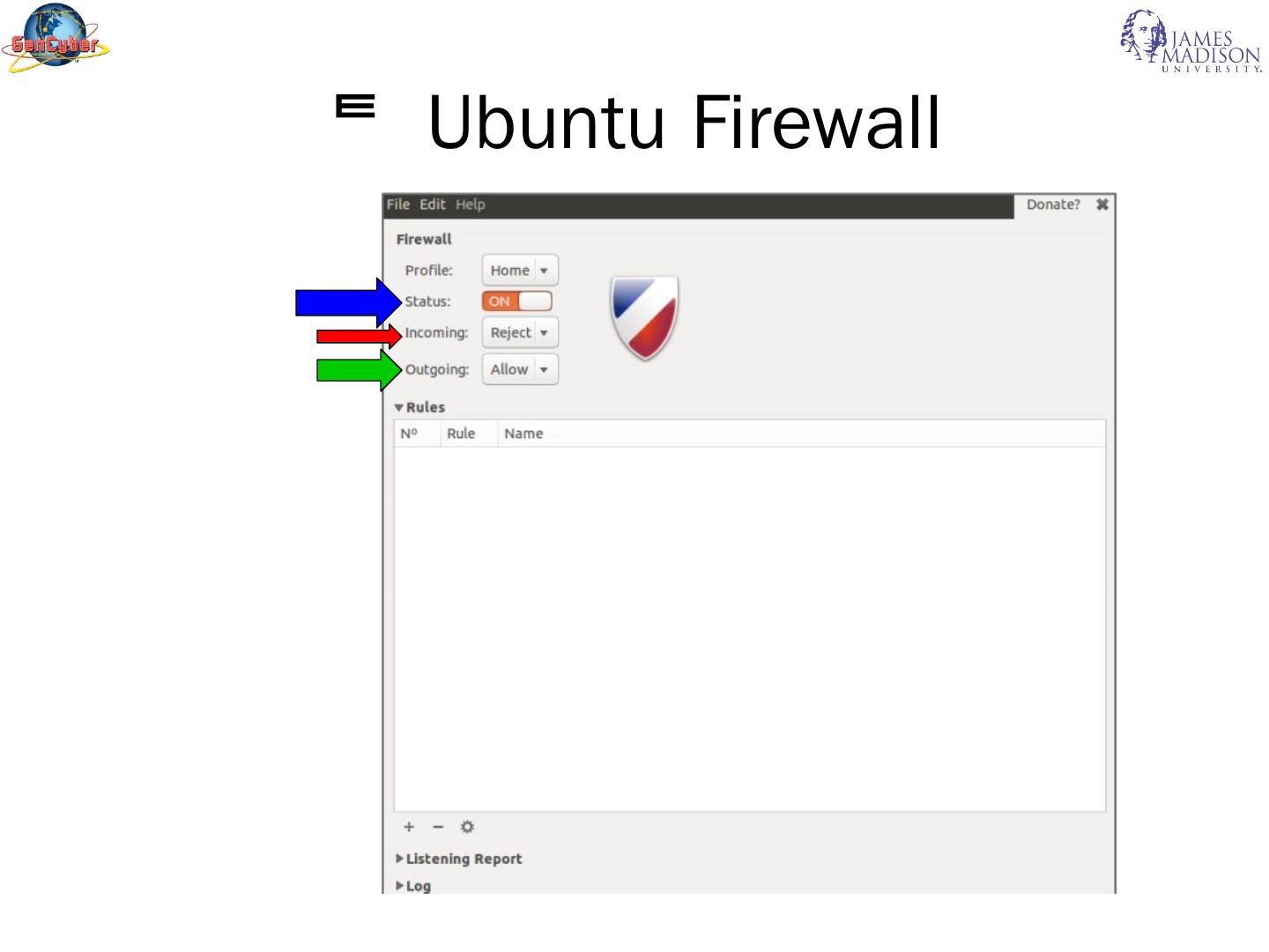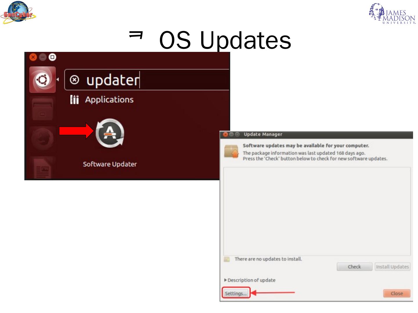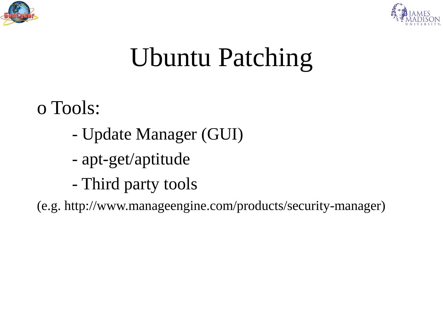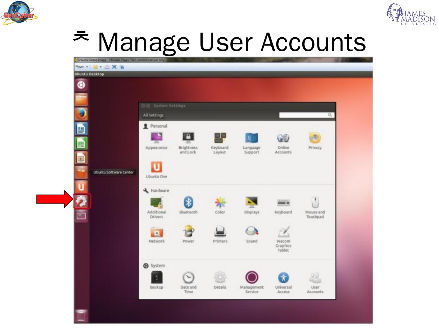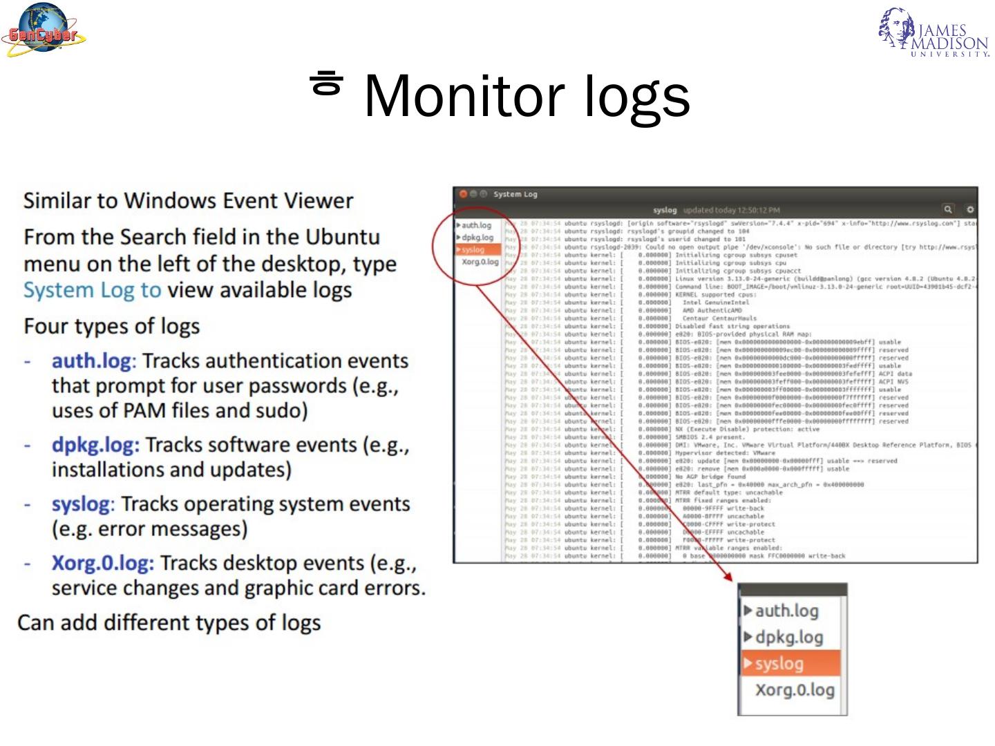 Applications. Linux. Ubuntu Security. Some common OS security topics. Manage user accounts; OS update; Enable firewall; Disable guest account; Monitor logs ...
