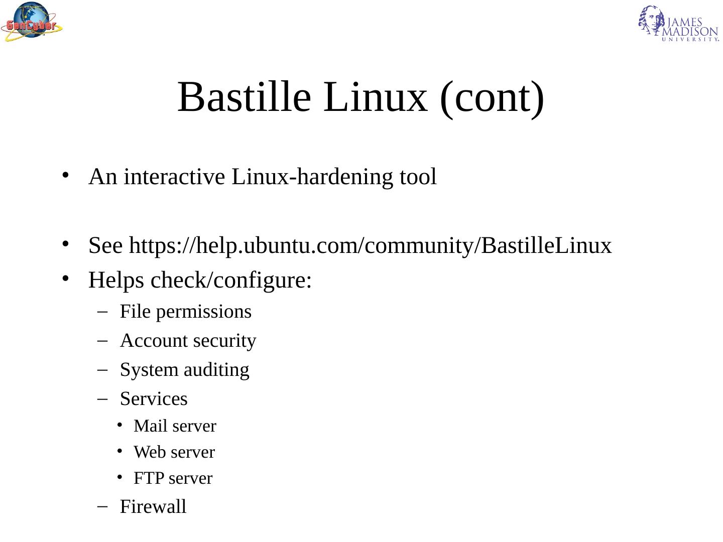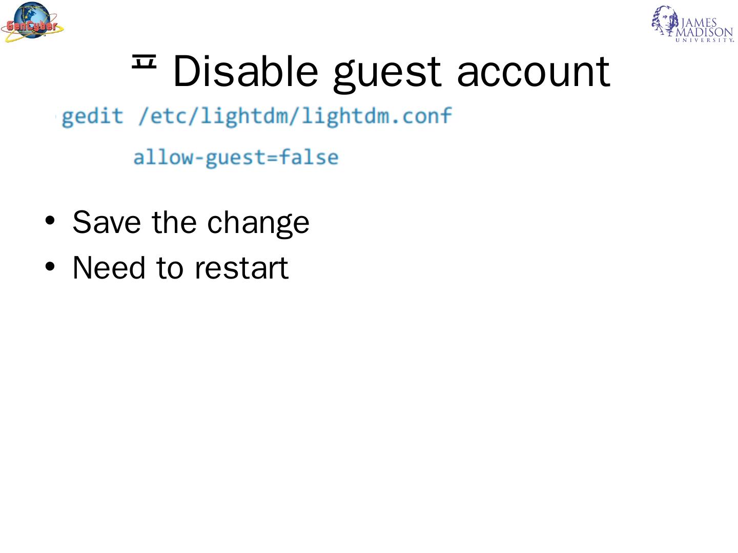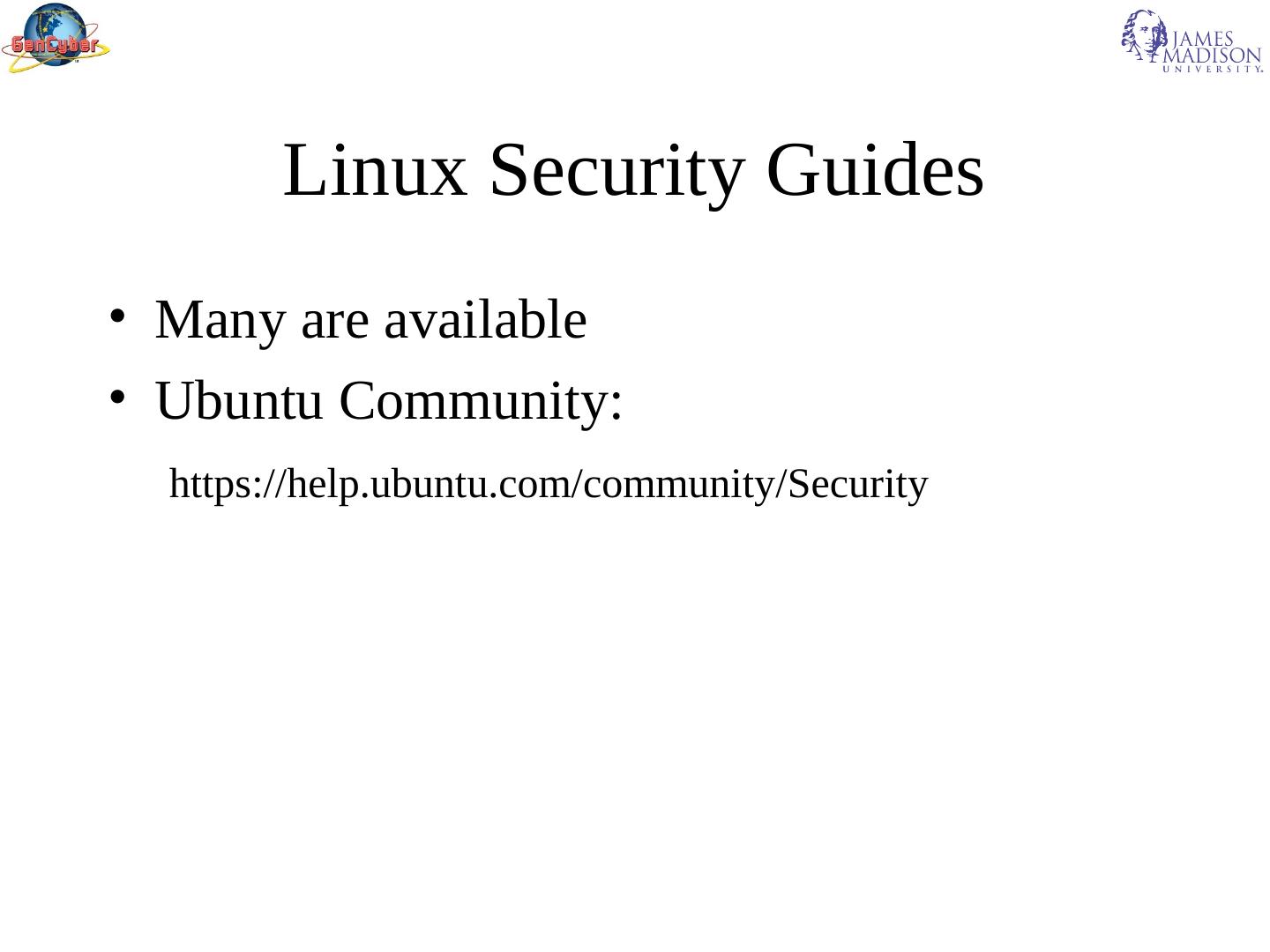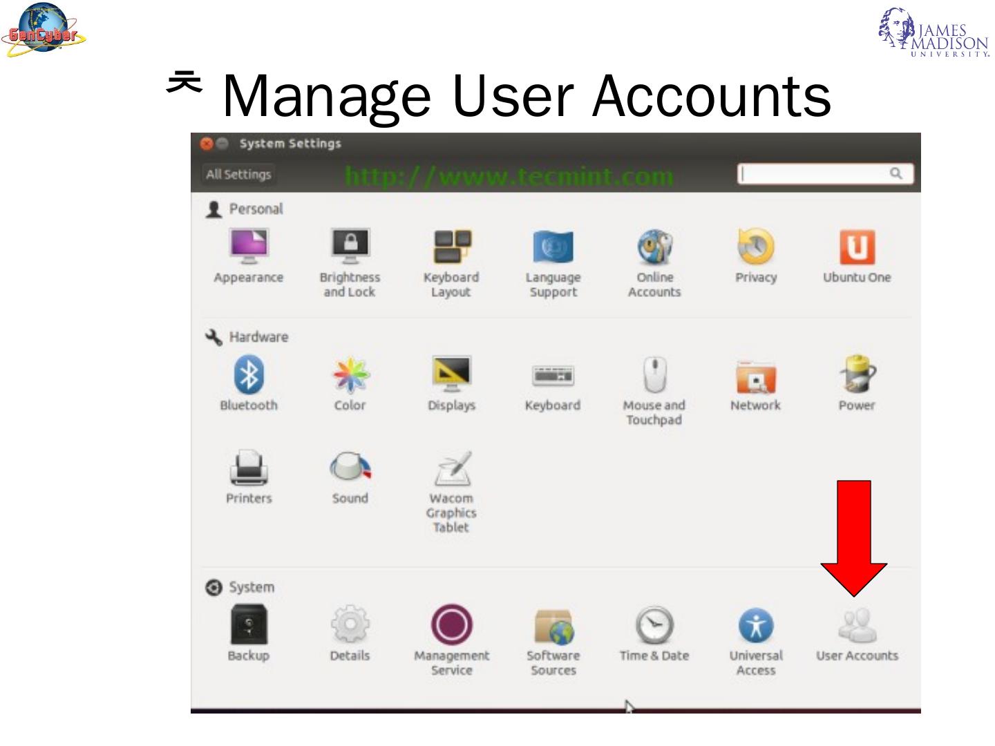 Applications. Linux. Ubuntu Security. Some common OS security topics. Manage user accounts; OS update; Enable firewall; Disable guest account; Monitor logs ...