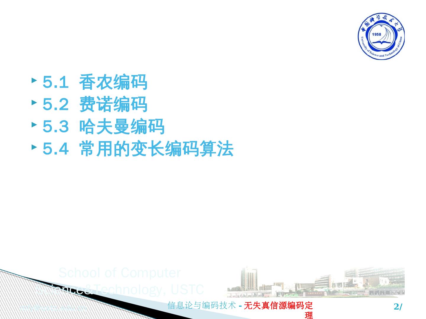 5.1 香农编码; 5.2 费诺编码; 5.3 哈夫曼编码; 5.4 常用的变长编码算法. 信息论与编码技术- .... 求二进制费诺码,二进制霍夫曼码,三进制霍夫曼码。 28. 5.4 常用的变长 ...