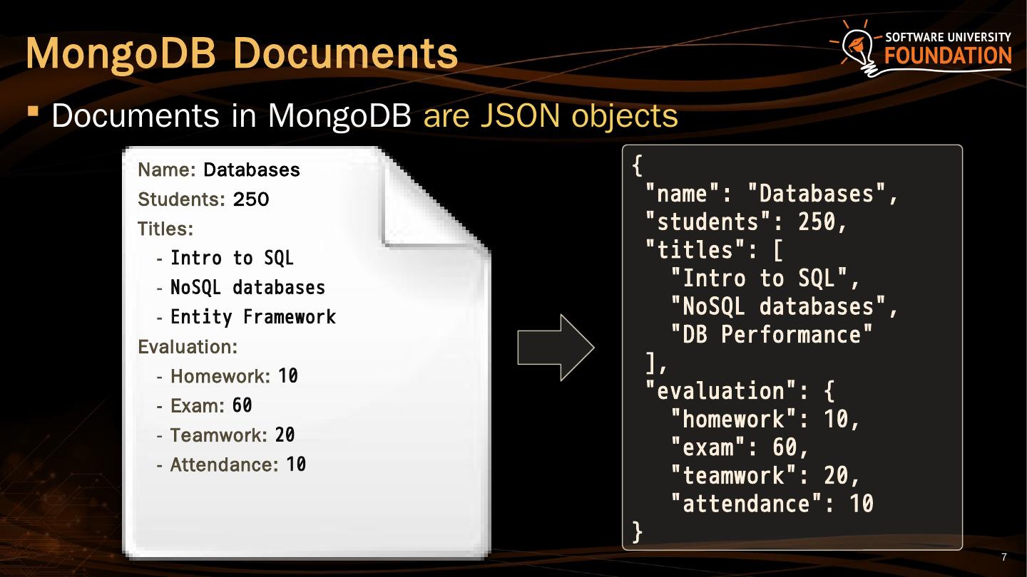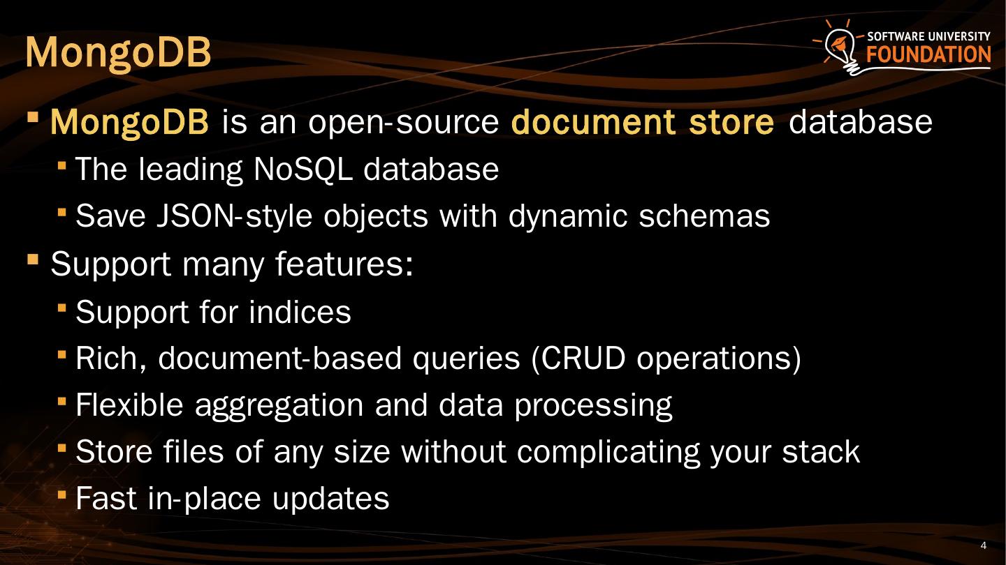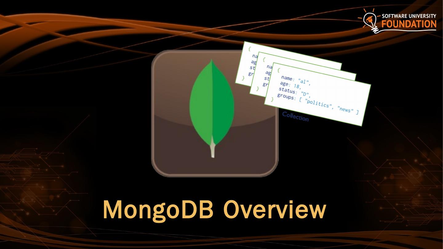 MongoDB Overview. MongoDB is an open-source document store database. The leading NoSQL database; Save JSON-style objects with dynamic schemas.