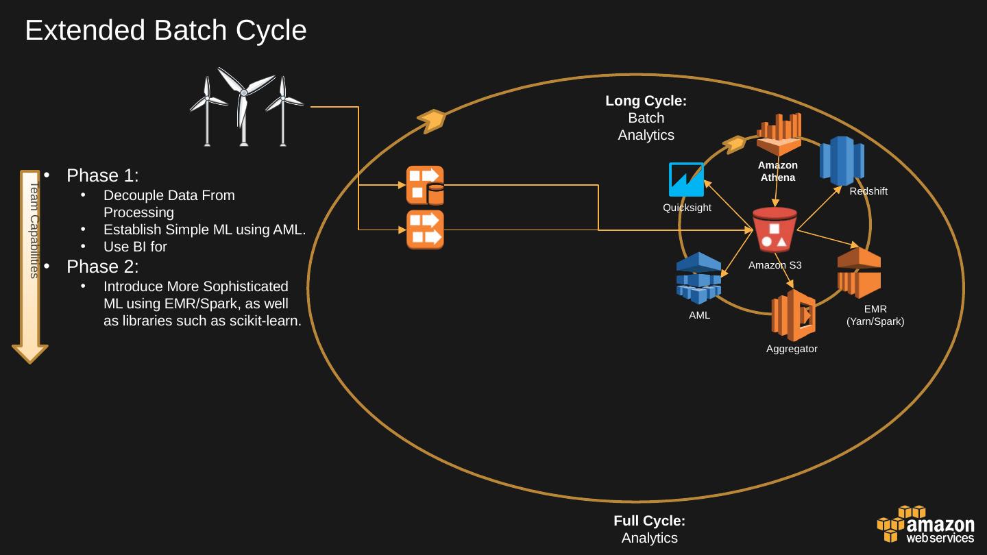 Amazon Athena. AML. Quicksight. Team Capabilities. Kinesis Streams. Kinesis Firehose. Amazon S3. Redshift. EMR. (Yarn/Spark). Aggregator. Long Cycle:.