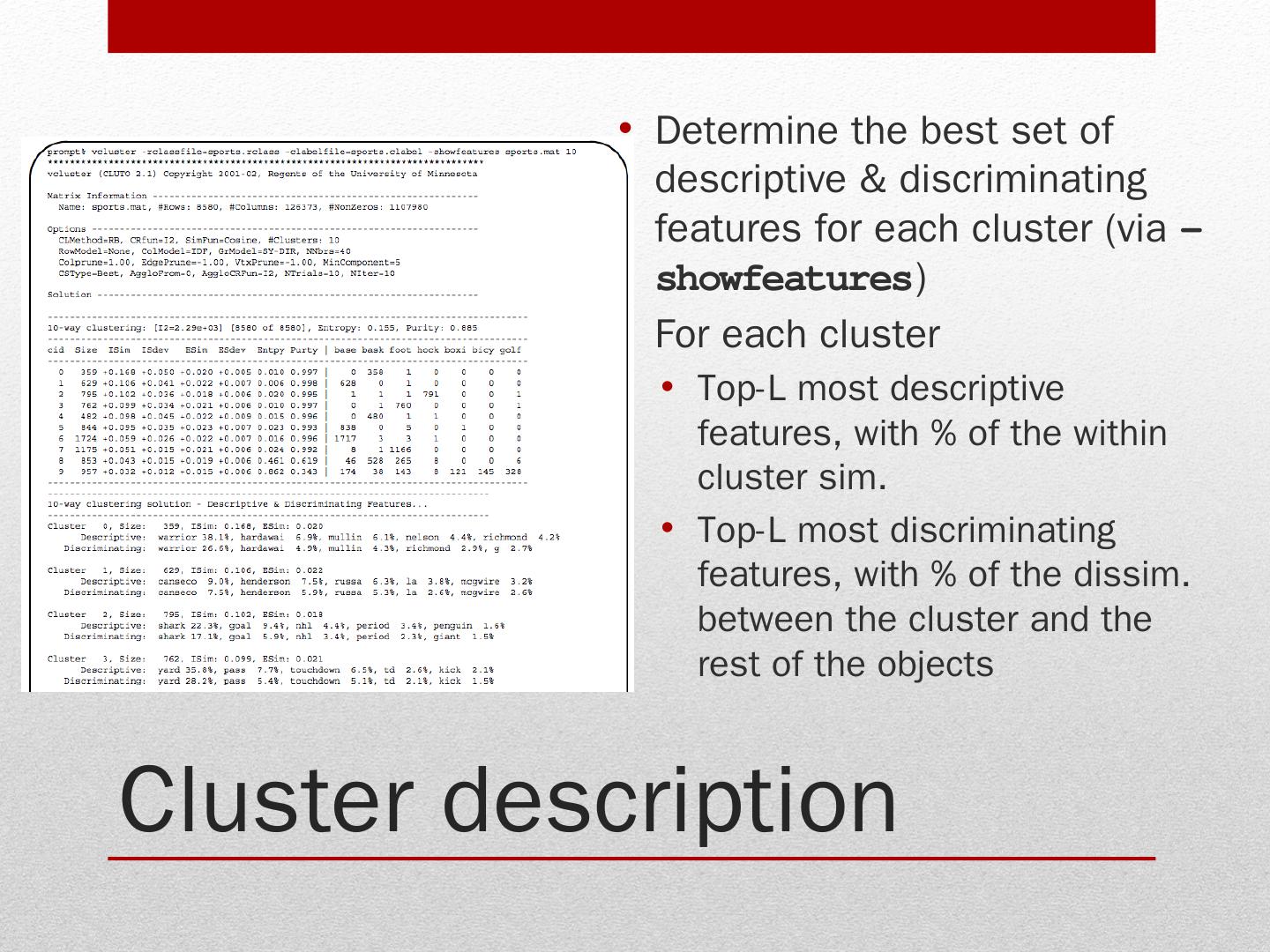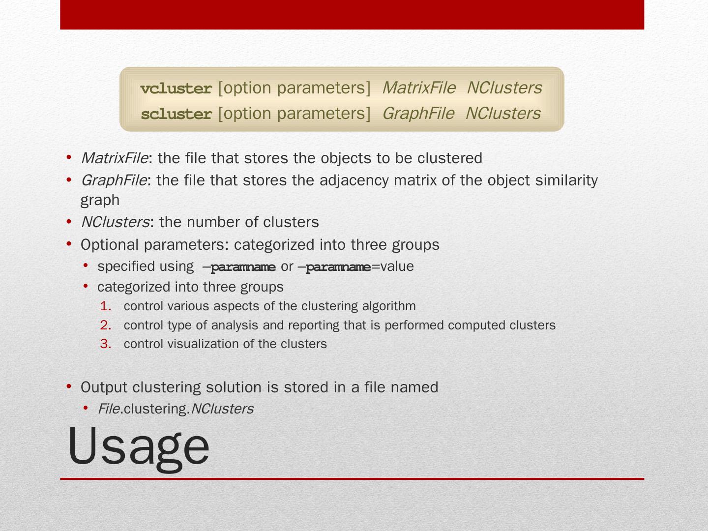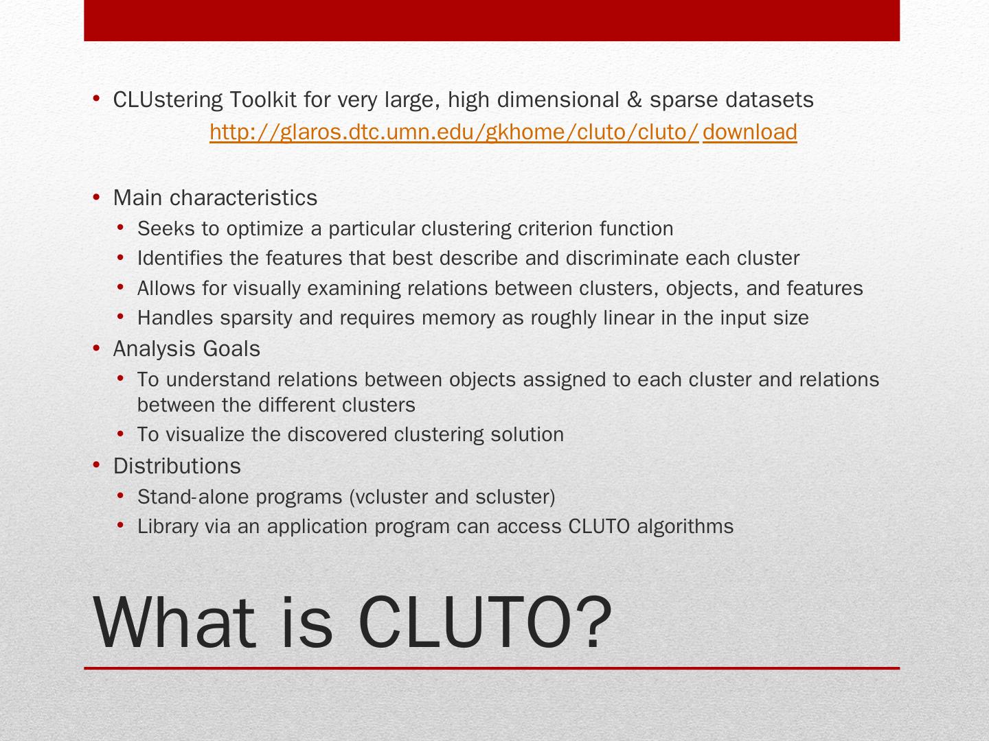 Stand-alone programs (vcluster and scluster); Library via an application program can access CLUTO algorithms. Clustering algorithms. Programs: vcluster: takes ...
