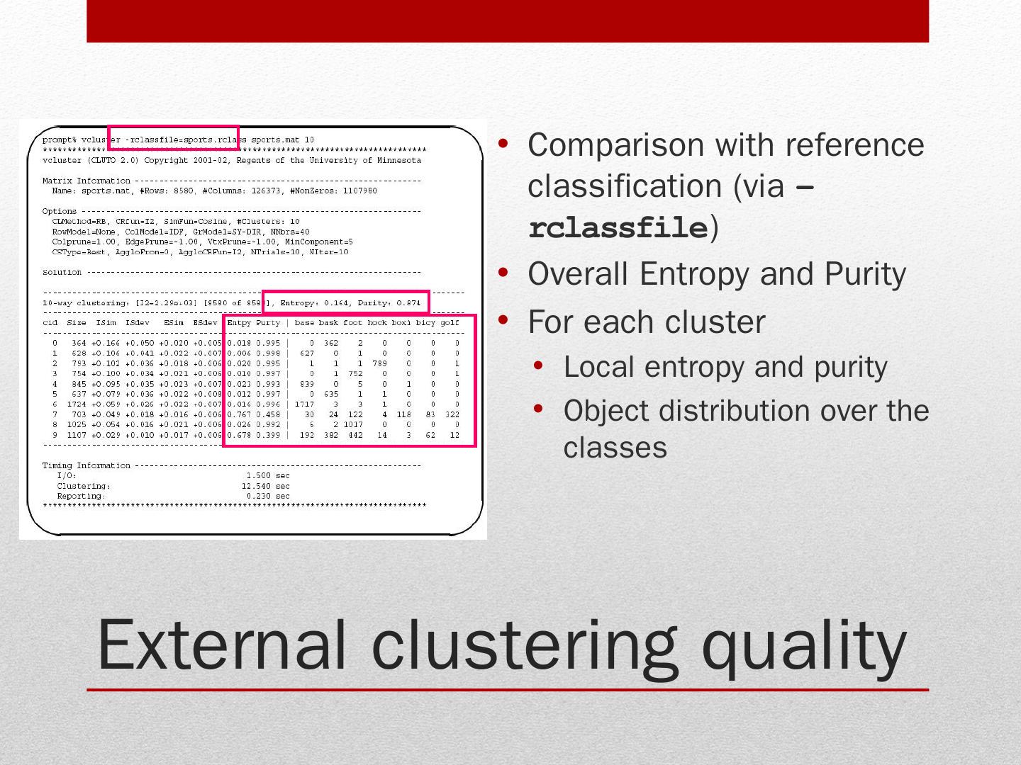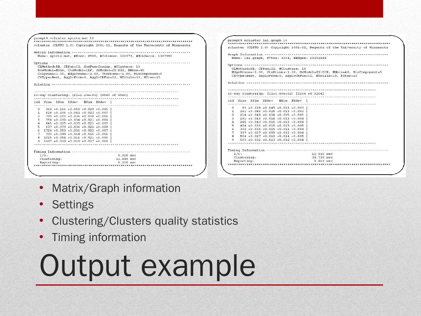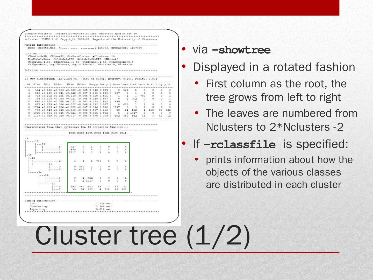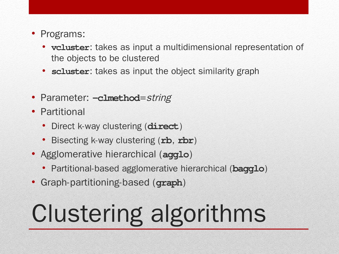 Stand-alone programs (vcluster and scluster); Library via an application program can access CLUTO algorithms. Clustering algorithms. Programs: vcluster: takes ...