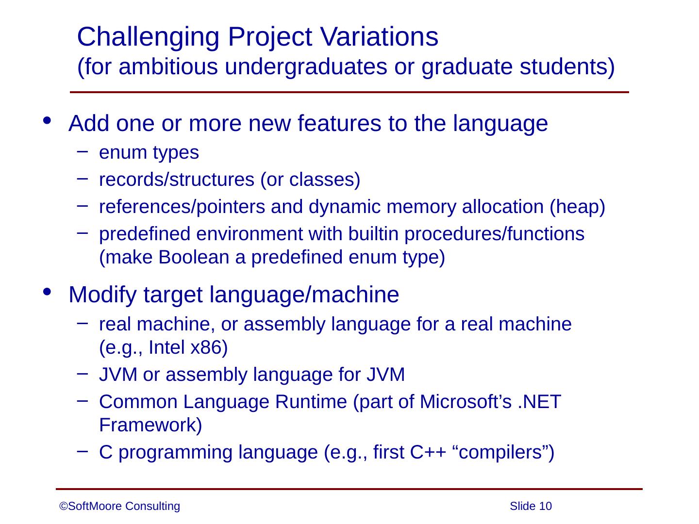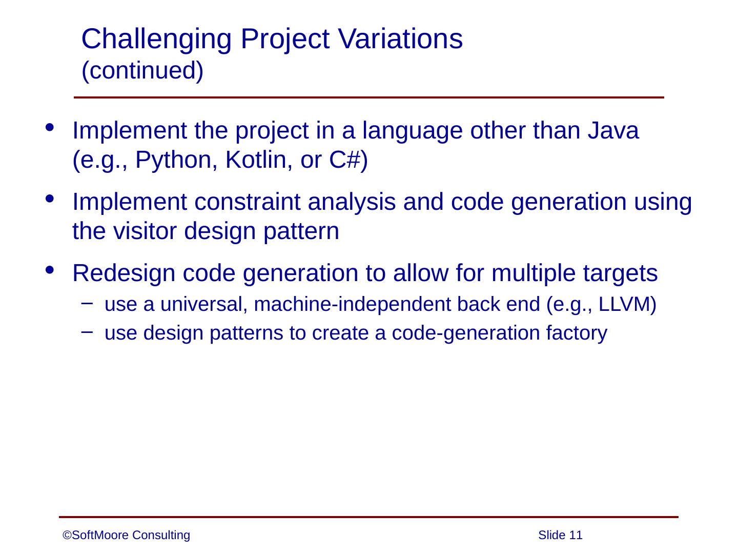 Implement the project in a language other than Java (e.g., Python, Kotlin, or C#); Implement constraint analysis and code generation using the visitor design ...