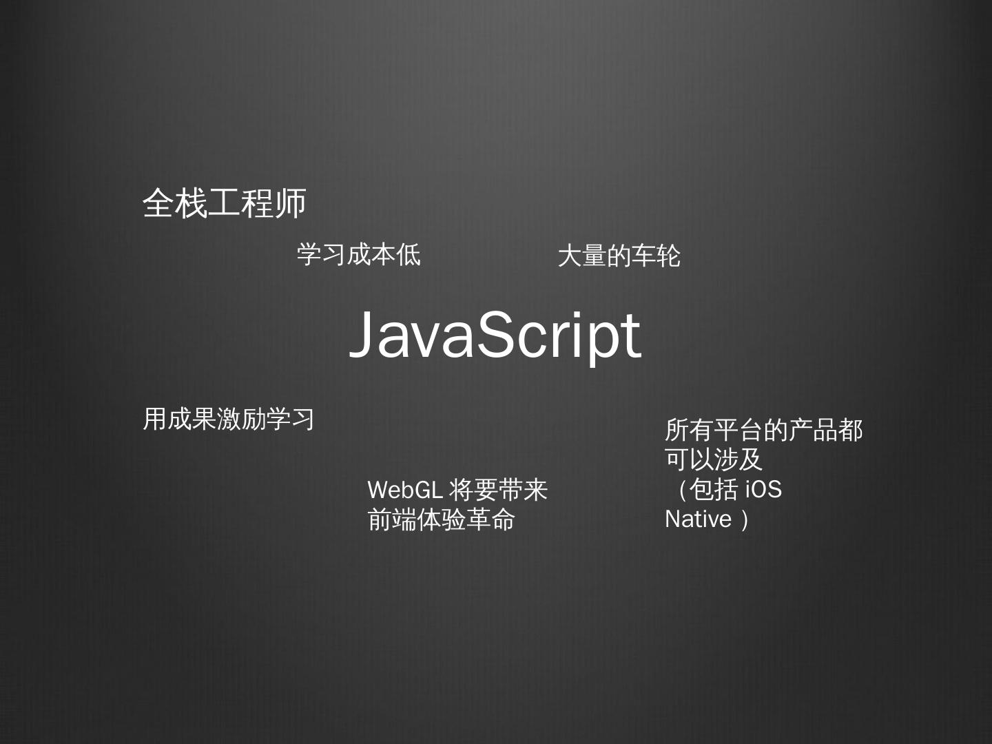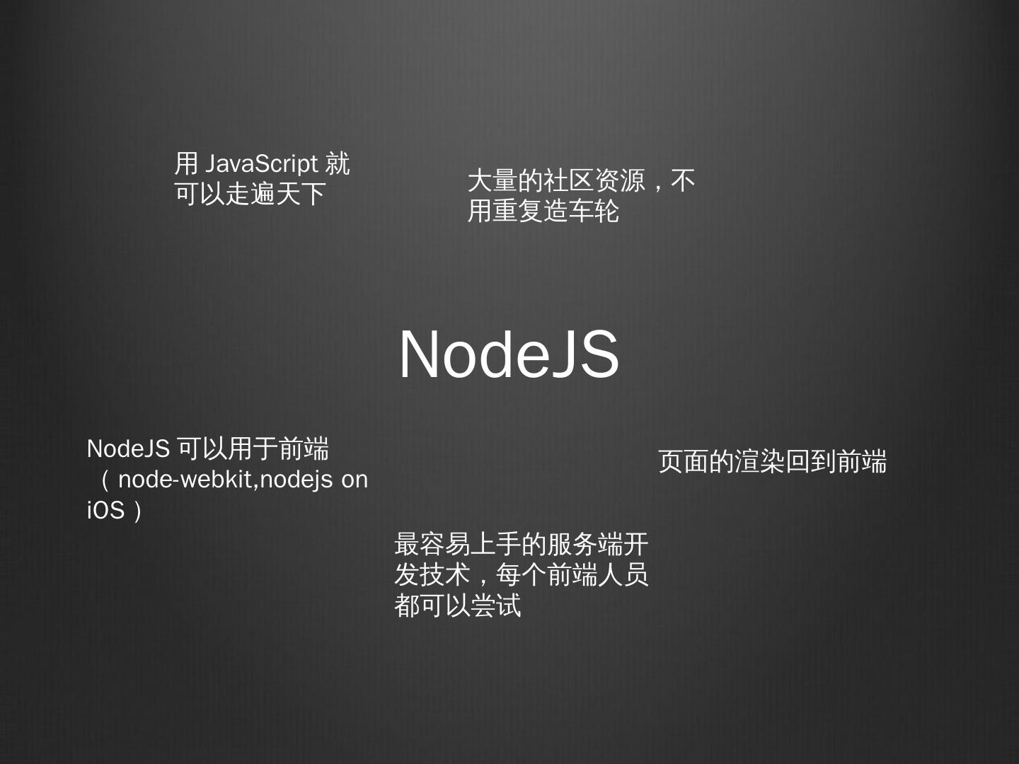 Javascriptcore(iOS). 成本更低,多设备兼容. Chrome Store. Android4.4的布局. NodeJS. 用JavaScript就可以走遍天下. 大量的社区资源,不用重复造车轮. NodeJS ...