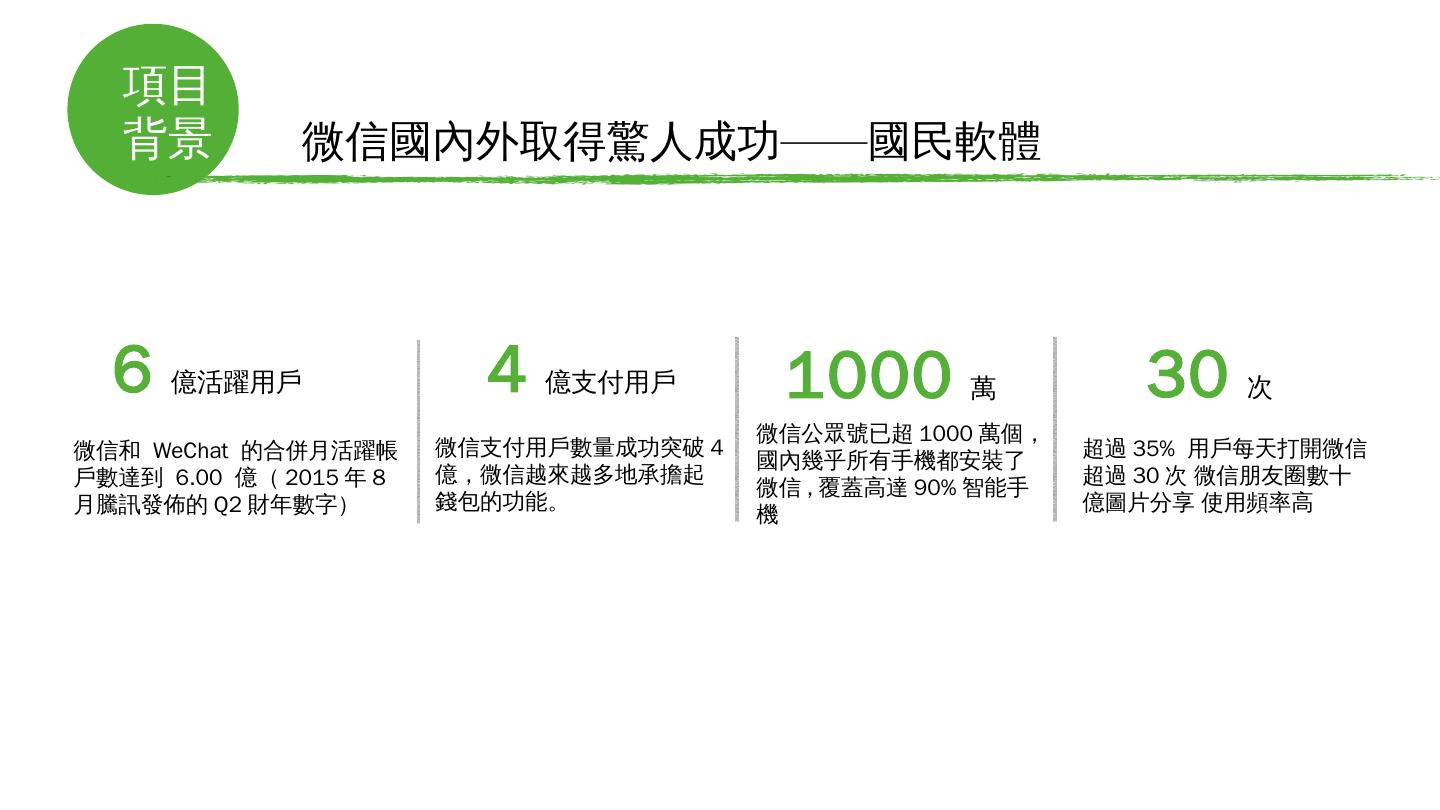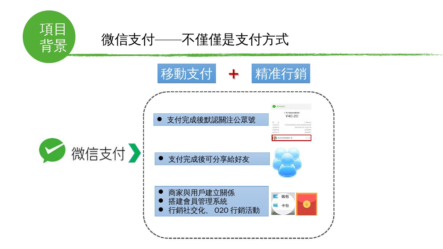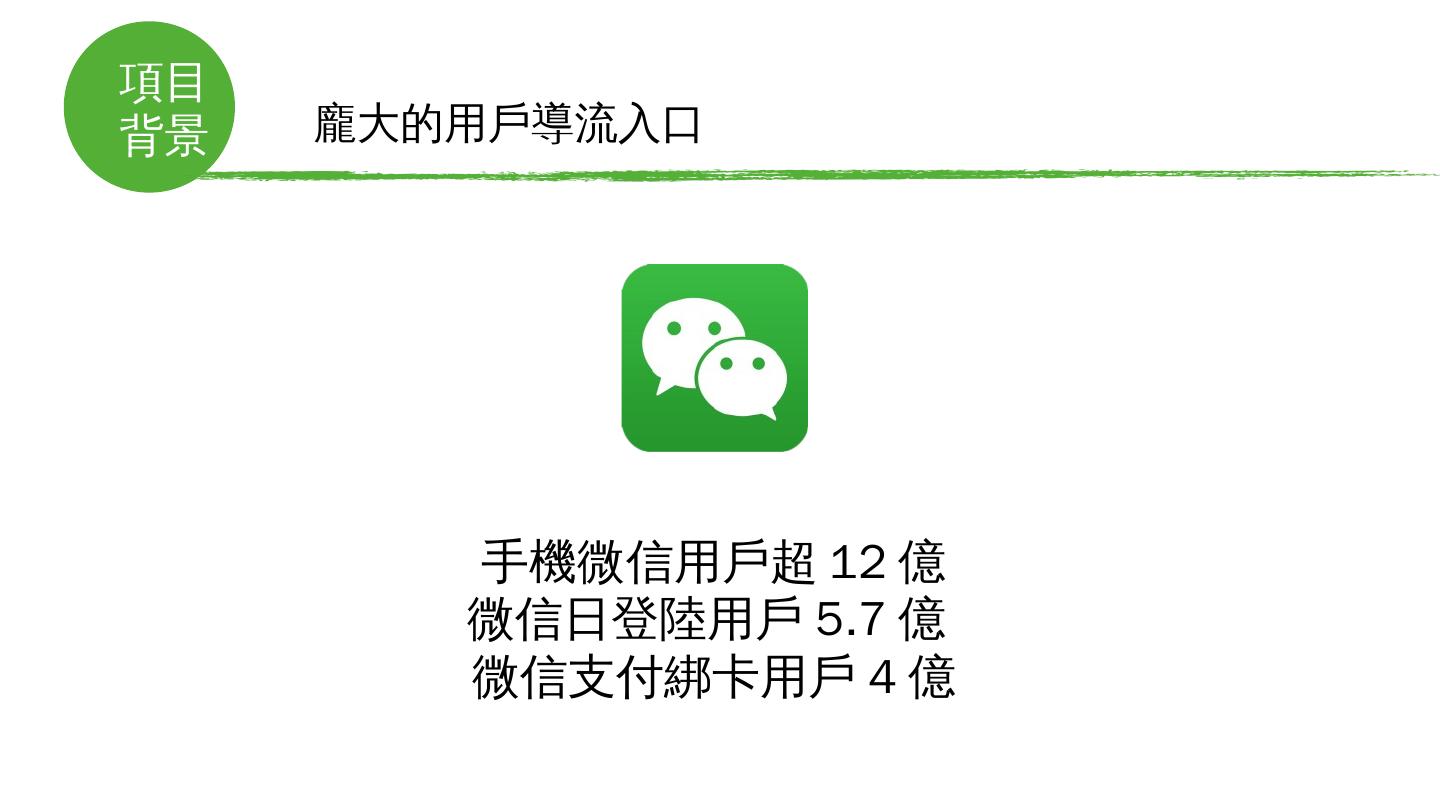 境外微信支付解決方案. 微通. 龐大的用戶導流入口. 手機微信用戶超12億. 微信日登陸用戶5.7億. 微信支付綁卡用戶4億. 項目. 背景. 微信國內外取得驚人成功——國民 ...