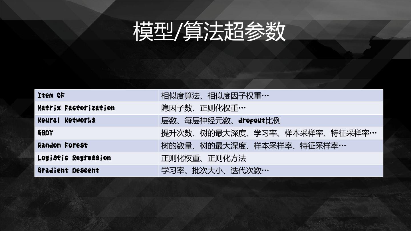 8 . 模型/算法超参数 Item CF 相似度算法、相似度因子权重… Matrix Factorization 隐因子数、正则化权重… Neural Networks 层数、每层神经元数、dropout比例 GBDT 提升次数、树的最大深度、学习率、样本采样率、特征采样率… Random Forest 树的数量、树的最大深度、样本采样率、特征采样率… Logistic Regression 正则化权重、正则化方法 Gradient Descent 学习率、批次大小、迭代次数…