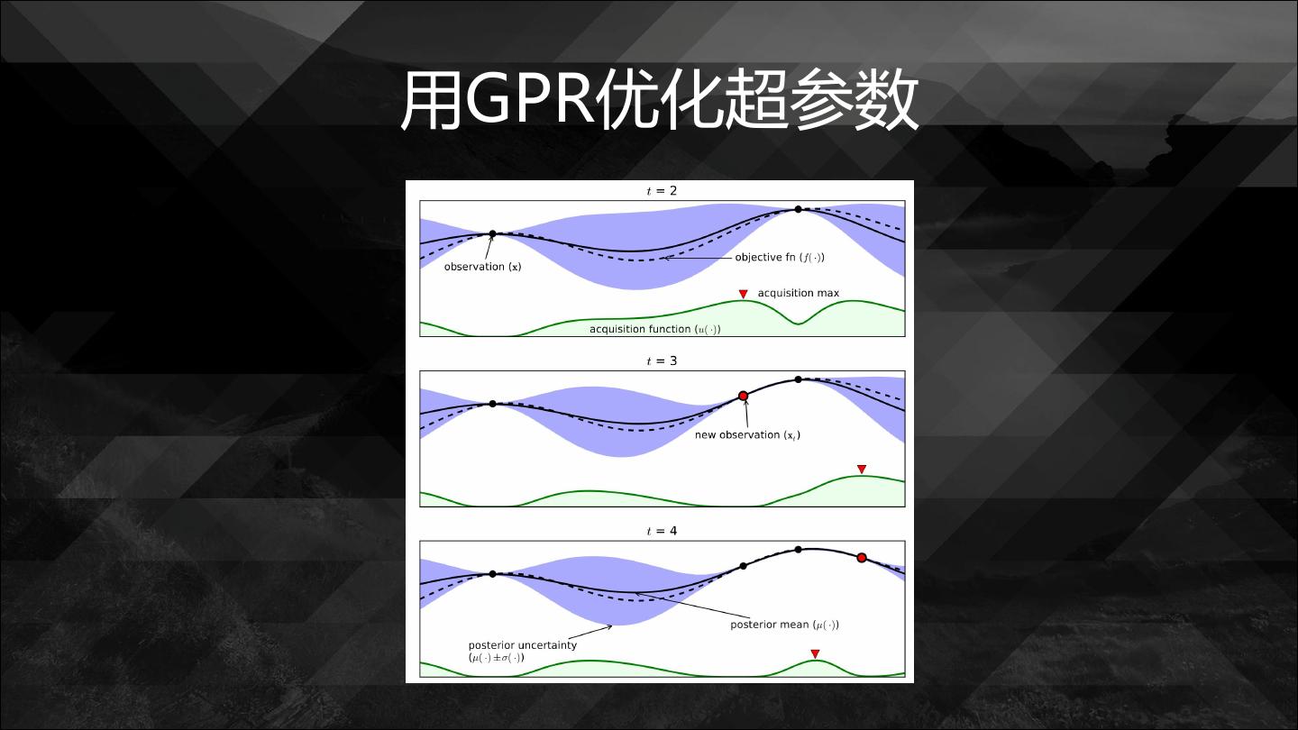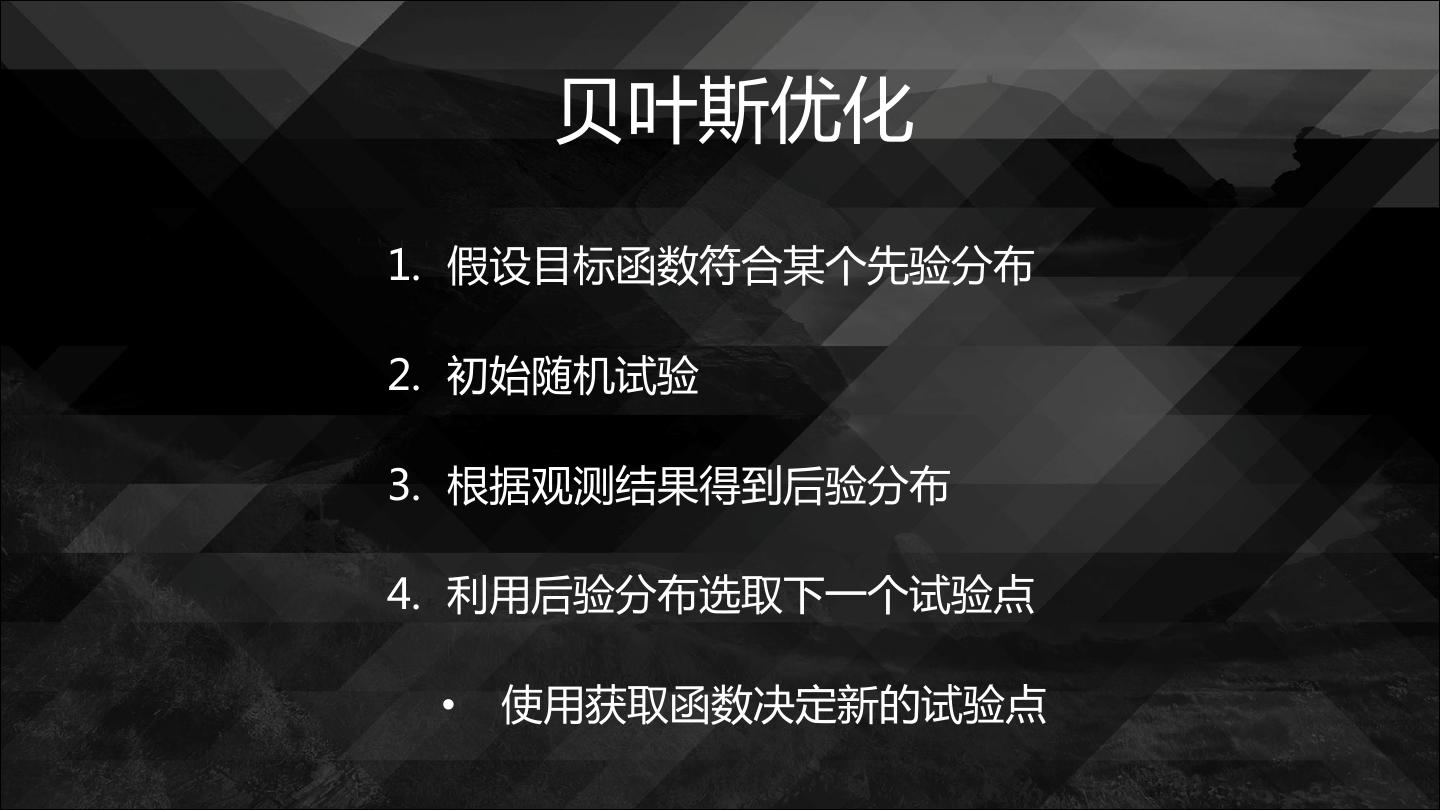15 . 贝叶斯优化 1. 假设目标函数符合某个先验分布 2. 初始随机试验 3. 根据观测结果得到后验分布 4. 利用后验分布选取下一个试验点 • 使用获取函数决定新的试验点