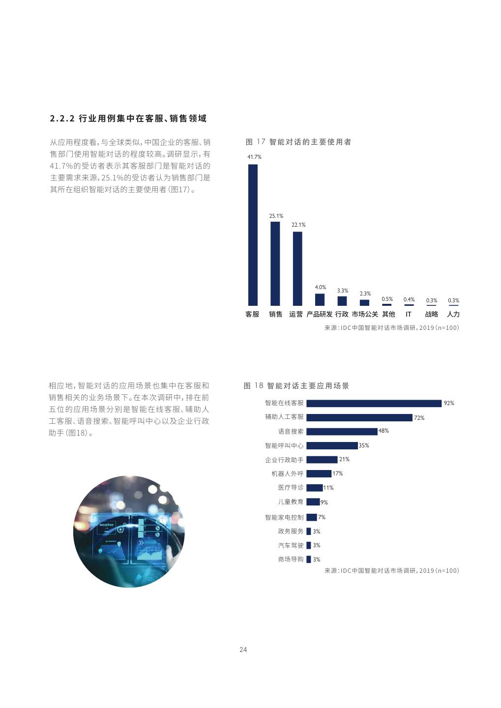 23 . 兰 腊 㼆 霢 遤 ⚌ 䎾 欽 䎛 岌⟱ ⚌ 䫏 餴 䠑 䡦 鳅 䔂 劥妃靈灇⚥絟㣐㢴侨涸「霄⟱⚌邍爙䊺絑䎾欽䧴姻㖈鿈縭兰腊㼆霢կ➢遤⚌♳溏ꆄ輑⥂ꤗծ兰腊㹻㾀ծ⟱⚌剪 ⸉ծ歏㉁ꨪ㈒瘝㖈兰腊㼆霢涸ꅷ欽♳㢅✵곭⯓귬껏㬛⛙ծ⼕毫⨴䐀ծ佟⸉岁ծ假康ⴀ遤瘝遤⚌姻㖈⸈䘯鿈縭蒜㤉 㕃կ 图 15 智 能 对话 的 行 业 应 用 情 况 9.1% 9.1% 9.1% 9.1% 9.1% 9.1% 9.1% 8.3% 20.0% 18.2% 18.2% 10.0% 36.4% 45.5% 45.5% 45.5% 50.0% 36.4% 30.0% 90.9% 72.7% 27.3% 27.3% 27.3% 54.5% 20.0% 25.0% 36.4% 20.0% 18.2% 18.2% 18.2% 16.7% ꆄ輑⥂ꤗ 兰腊㹻㾀 ⟱⚌剪⸉ 歏㉁ꨪ㈒ 귬껏㬛⛙ ⼕毫⨴䐀 佟⸉岁 假康ⴀ遤 侅肫㛆雲 歋✵㔋莓❀Ⰶ涸⾲㔔ⴔ고ㄤざ雦⛓ꢂ〳腊㶸㖈㽵䊵 雦ⴢ㖈劢勻 雦ⴢ㖈劢勻 鵮㖈霉⠮劢勻 䊺絑䎾欽 姻㖈鿈縭 䎃ⰻ⢪欽 䎃ⰻ⢪欽 欽鸀ㄤ⟟⧩ 勻彂*%$⚥㕂兰腊㼆霢䋑㖞靈灇O 图 1 6 智能对话的投入计划 ⟱⚌⛲馊〄䠑霋ⵌ兰腊㼆霢䪮助䫏 25% 34% 34% Ⰶ涸ꅾ銳կ㖈鲱炽⟝ծ*5剪⸉ㄤ㉁⚌ 36% 剪⸉倰絟㣐㢴侨涸鄄靈灇⟱⚌ 71% 鿪䊺絑剣湱䎾涸䫏Ⰶ鲱⟝ㄤ炽⟝ 41% 僽⟱⚌䫏Ⰶ涸ꅾ挿㕃կ 66% 64% 63% 34% 29% 3% 鲱⟝ 炽⟝ 侨䰘剪⸉ *5剪⸉ ㉁⚌剪⸉ 梡㖈剣䫏Ⰶ 梡㖈剣䫏Ⰶ 梡㖈尵䫏Ⰶ た絯䩧皾鷅⸈ ♶䩧皾鷅⸈ ⛲♶䩧皾䫏Ⰶ 勻彂*%$⚥㕂兰腊㼆霢䋑㖞靈灇O 23