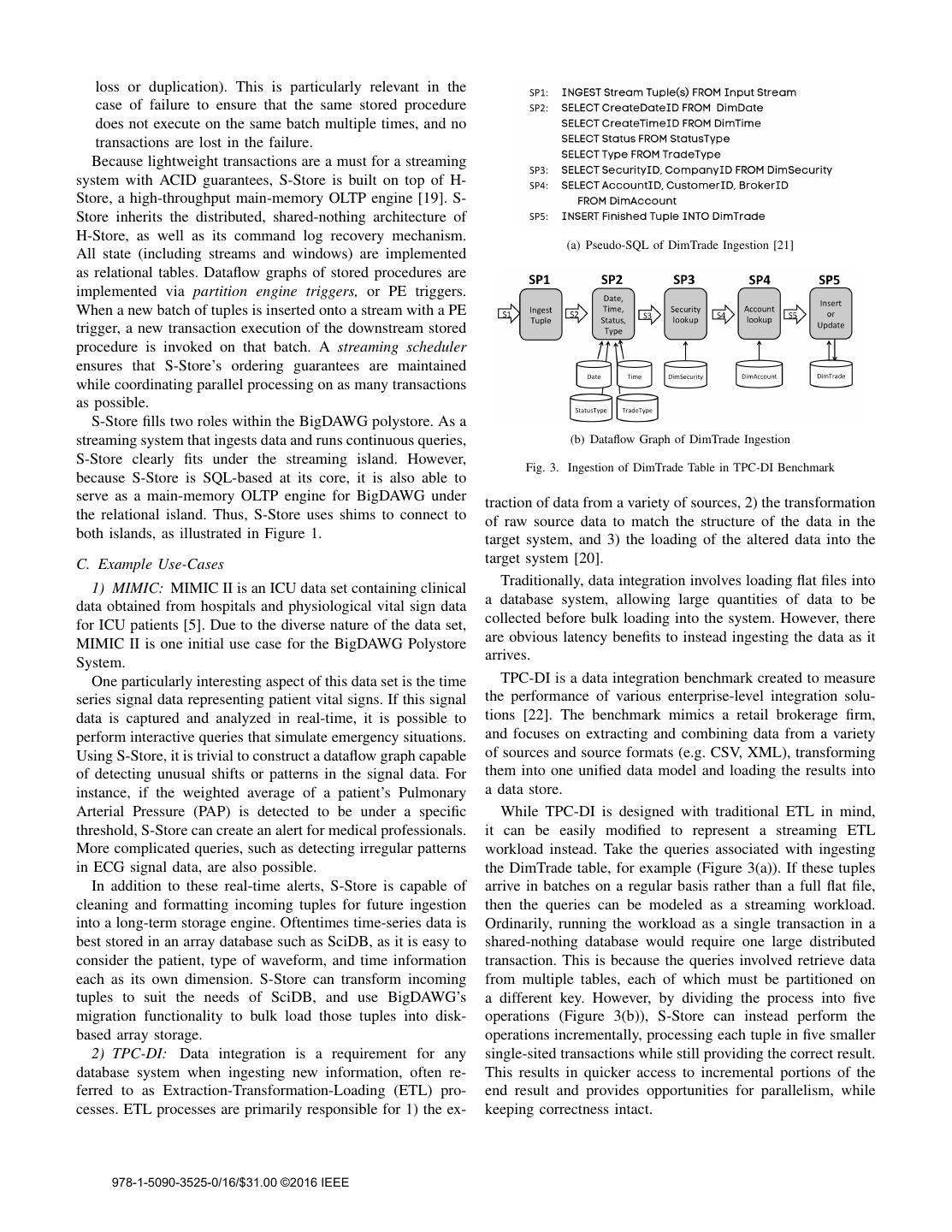 7 .[12] A. Elmore, J. Duggan, M. Stonebraker, M. Balazinska, U. Cetintemel, V. Gadepally, J. Heer, B. Howe, J. Kepner, T. Kraska, S. Madden, D. Maier, T. Mattson, S. Papadopoulos, J. Parkhurst, N. Tatbul, M. Var- tak, and S. Zdonik, “A Demonstration of the BigDAWG Polystore System,” The Proceedings of the VLDB Endowment (PVLDB), vol. 8, no. 12, August 2015. [13] J. Meehan, N. Tatbul, S. Zdonik, C. Aslantas, U. Cetintemel, J. Du, T. Kraska, S. Madden, D. Maier, A. Pavlo, M. Stonebraker, K. Tufte, and H. Wang, “S-Store: Streaming Meets Transaction Processing,” PVLDB, vol. 8, no. 13, pp. 2134–2145, 2015. [14] U. Cetintemel, J. Du, T. Kraska, S. Madden, D. Maier, J. Meehan, A. Pavlo, M. Stonebraker, E. Sutherland, N. Tatbul, K. Tufte, H. Wang, and S. Zdonik, “S-Store: A Streaming NewSQL System for Big Velocity Applications (Demonstration),” in International Conference on Very Large Data Bases (VLDB’14), Hangzhou, China, September 2014. [15] N. Tatbul et al., “Handling Shared, Mutable State in Stream Processing with Correctness Guarantees,” IEEE Data Engineering Bulletin, to appear. [16] D. Abadi et al., “Aurora: A New Model and Architecture for Data Stream Management,” VLDB Journal, vol. 12, no. 2, 2003. [17] A. Arasu et al., “STREAM: The Stanford Data Stream Management System,” in Data Stream Management: Processing High-Speed Data Streams, 2004. [18] S. Chandrasekaran et al., “TelegraphCQ: Continuous Dataflow Process- ing for an Uncertain World,” in CIDR, 2003. [19] R. Kallman et al., “H-Store: A High-Performance, Distributed Main Memory Transaction Processing System,” PVLDB, vol. 1, no. 2, 2008. [20] P. Vassiliadis, “A Survey of Extract-Transform-Load Technology,” IJDWM, vol. 5, no. 3, pp. 1–27, 2009. [21] Transaction Processing Performance Council (TPC), “TPC Benchmark DI (Version 1.1.0),” http://www.tpc.org/tpcdi/, Nov. 2014. [22] M. Poess, T. Rabl, H.-A. Jacobsen, and B. Caufield, “TPC-DI: The First Industry Benchmark for Data Integration,” Proc. VLDB Endow., vol. 7, no. 13, pp. 1367–1378, Aug. 2014. [23] M. Zaharia, T. Das, H. Li, T. Hunter, S. Shenker, and I. Stoica, “Discretized Streams: Fault-tolerant Streaming Computation at Scale,” in SOSP, 2013, pp. 423–438. [24] A. Toshniwal, S. Taneja, A. Shukla, K. Ramasamy, J. M. Patel, S. Kulka- rni, J. Jackson, K. Gade, M. Fu, J. Donham, N. Bhagat, S. Mittal, and D. V. Ryaboy, “Storm @Twitter,” in SIGMOD, 2014, pp. 147–156. [25] J. Kreps, N. Narkhede, and J. Rao, “Kafka: A Distributed Messaging System for Log Processing,” in NetDB Workshop, 2011. [26] The Transaction Processing Council, “TPC-C Benchmark (Revision 5.9.0),” http://www.tpc.org/tpcc/, 2007. [27] M. J. Carey, L. M. Haas, P. M. Schwarz, M. Arya, W. Cody, R. Fagin, M. Flickner, A. W. Luniewski, W. Niblack, D. Petkovic et al., “Towards heterogeneous multimedia information systems: The garlic approach,” in Research Issues in Data Engineering, 1995: Distributed Object Man- agement, Proceedings. RIDE-DOM’95. Fifth International Workshop on. IEEE, 1995, pp. 124–131. 978-1-5090-3525-0/16/$31.00 ©2016 IEEE