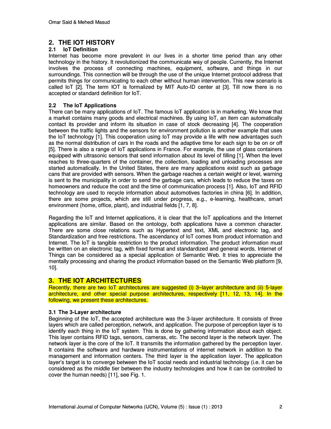 14 .Omar Said & Mehedi Masud 8. CONCLUSION In this paper, an IoT survey is presented. IoT history, which contains the IoT definition and the applications, are demonstrated. Also, the IoT architectures, which are called 3-layer and 5-layer, with recent special purpose ones are showed. The IoT challenges such as the mass gathered information, security, privacy, and some networking challenges are introduced. In addition, the IoT database requirements, trials, and models are demonstrated. Finally, our IoT future vision is discussed. 9. REFERENCES 1. Luigi A., Antonio I., Giacomo M. 2010.The Internet of Things: A survey. Science Direct journal of Computer Networks, Volume 54, Pages: 2787–2805. 2. Yinghui H., Guanyu L., 2010. Descriptive Models for Internet of Things. IEEE International Conference on Intelligent Control and Information Processing, Dalian, China, Pages: 483- 486. 3. Mealling M, 2003 Auto-ID Object Name Service (ONS) v1.0, Auto-ID Center Working Draft. 4. Bo Y., Guangwen H., 2008. Application of RFID and Internet of Things in Monitoring and Anti- counterfeiting for Products. International Seminar on Business and Information, Wuhan, Hubei, China, Pages: 392- 395. 5. Zouganeli E., Einar Svinnset I., 2009. Connected Objects and the Internet of Things - a Paradigm Shift. International Conference on Photonics in Switching, Pisa, Italy, Pages: 1-4. 6. Tongzhu Z., Xueping W., Jiangwei C., Xianghai L., Pengfei C., 2010 .Automotive recycling information management based on the internet of things and RFID technology. IEEE International Conference on Advanced Management Science (ICAMS), Changchun, China, page(s): 620 – 622. 7. Muriel D., Juan F., 2010. Expanding the learning environment: combining physicality and virtuality The Internet of Things for eLearning. IEEE International Conference on Advanced Learning Technologies (ICALT), Sousse, Tunisia, Pages: 730- 731. 8. Gustavo G, Mario O., Carlos K., 2008. Early infrastructure of an Internet of Things in Spaces for Learning. Eighth IEEE International Conference on Advanced Learning Technologies, Cantabria, Spain, Pages: 381-383. 9. Yinghui H., Guanyu L., 2010. A Semantic Analysis for Internet of Things. IEEE International Conference on Intelligent Computation Technology and Automation, Shenzhen, China, Pages: 336- 339. 10. Yuxi Liu, Guohui Zhou, Key Technologies and Applications of Internet of Things, IEEE Fifth International Conference on Intelligent Computation Technology and Automation, Hunan China, pp: 197-200, 2012. 11. Miao W., Ting L., Fei L., ling S., Hui D., 2010.Research on the architecture of Internet of things. IEEE International Conference on Advanced Computer Theory and Engineering (ICACTE), Sichuan province, China, Pages: 484-487. 12. Jinxin Z., Mangui L., 2010. A New Architecture for Converged Internet of Things. International Conference on Internet Technology and Applications, Beijing, China, Pages: 1 - 4. 13. Zhang J, Liang M., 2010. A New Architecture for Converged Internet of Things. IEEE International Conference on Internet Technology and Applications, Wuhan, China, Pages: 1- 4. 14. Inge G., 2008. Architecture for the Internet of Things (IoT): API and interconnect. 2nd International Journal of Computer Networks (IJCN), Volume (5) : Issue (1) : 2013 14