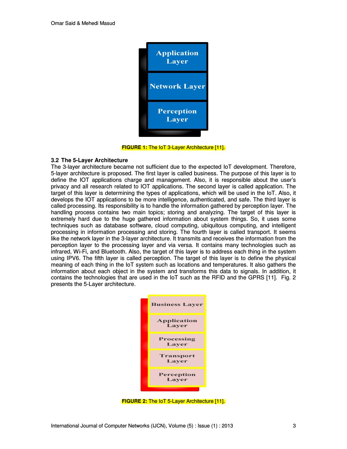 3 .Omar Said & Mehedi Masud FIGURE 1: The IoT 3-Layer Architecture [11]. 3.2 The 5-Layer Architecture The 3-layer architecture became not sufficient due to the expected IoT development. Therefore, 5-layer architecture is proposed. The first layer is called business. The purpose of this layer is to define the IOT applications charge and management. Also, it is responsible about the user’s privacy and all research related to IOT applications. The second layer is called application. The target of this layer is determining the types of applications, which will be used in the IoT. Also, it develops the IOT applications to be more intelligence, authenticated, and safe. The third layer is called processing. Its responsibility is to handle the information gathered by perception layer. The handling process contains two main topics; storing and analyzing. The target of this layer is extremely hard due to the huge gathered information about system things. So, it uses some techniques such as database software, cloud computing, ubiquitous computing, and intelligent processing in information processing and storing. The fourth layer is called transport. It seems like the network layer in the 3-layer architecture. It transmits and receives the information from the perception layer to the processing layer and via versa. It contains many technologies such as infrared, Wi-Fi, and Bluetooth. Also, the target of this layer is to address each thing in the system using IPV6. The fifth layer is called perception. The target of this layer is to define the physical meaning of each thing in the IoT system such as locations and temperatures. It also gathers the information about each object in the system and transforms this data to signals. In addition, it contains the technologies that are used in the IoT such as the RFID and the GPRS [11]. Fig. 2 presents the 5-Layer architecture. FIGURE 2: The IoT 5-Layer Architecture [11]. International Journal of Computer Networks (IJCN), Volume (5) : Issue (1) : 2013 3