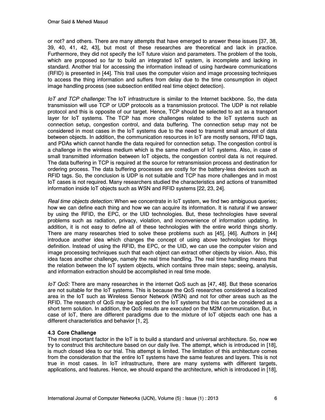 6 .Omar Said & Mehedi Masud or not? and others. There are many attempts that have emerged to answer these issues [37, 38, 39, 40, 41, 42, 43], but most of these researches are theoretical and lack in practice. Furthermore, they did not specify the IoT future vision and parameters. The problem of the tools, which are proposed so far to build an integrated IoT system, is incomplete and lacking in standard. Another trial for accessing the information instead of using hardware communications (RFID) is presented in [44]. This trail uses the computer vision and image processing techniques to access the thing information and suffers from delay due to the time consumption in object image handling process (see subsection entitled real time object detection). IoT and TCP challenge: The IoT infrastructure is similar to the Internet backbone. So, the data transmission will use TCP or UDP protocols as a transmission protocol. The UDP is not reliable protocol and this is opposite of our target. Hence, TCP should be selected to act as a transport layer for IoT systems. The TCP has more challenges related to the IoT systems such as connection setup, congestion control, and data buffering. The connection setup may not be considered in most cases in the IoT systems due to the need to transmit small amount of data between objects. In addition, the communication resources in IoT are mostly sensors, RFID tags, and PDAs which cannot handle the data required for connection setup. The congestion control is a challenge in the wireless medium which is the same medium of IoT systems. Also, in case of small transmitted information between IoT objects, the congestion control data is not required. The data buffering in TCP is required at the source for retransmission process and destination for ordering process. The data buffering processes are costly for the battery-less devices such as RFID tags. So, the conclusion is UDP is not suitable and TCP has more challenges and in most IoT cases is not required. Many researchers studied the characteristics and actions of transmitted information inside IoT objects such as WSN and RFID systems [22, 23, 24]. Real time objects detection: When we concentrate in IoT system, we find two ambiguous queries; how we can define each thing and how we can acquire its information. It is natural if we answer by using the RFID, the EPC, or the UID technologies. But, these technologies have several problems such as radiation, privacy, violation, and inconvenience of information updating. In addition, it is not easy to define all of these technologies with the entire world things shortly. There are many researches tried to solve these problems such as [45], [46]. Authors in [44] introduce another idea which changes the concept of using above technologies for things definition. Instead of using the RFID, the EPC, or the UID, we can use the computer vision and image processing techniques such that each object can extract other objects by vision. Also, this idea faces another challenge, namely the real time handling. The real time handling means that the relation between the IoT system objects, which contains three main steps; seeing, analysis, and information extraction should be accomplished in real time mode. IoT QoS: There are many researches in the internet QoS such as [47, 48]. But these scenarios are not suitable for the IoT systems. This is because the QoS researches considered a localized area in the IoT such as Wireless Sensor Network (WSN) and not for other areas such as the RFID. The research of QoS may be applied on the IoT systems but this can be considered as a short term solution. In addition, the QoS results are executed on the M2M communication. But, in case of IoT, there are different paradigms due to the mixture of IoT objects each one has a different characteristics and behavior [1, 2]. 4.3 Core Challenge The most important factor in the IoT is to build a standard and universal architecture. So, now we try to construct this architecture based on our daily live. The attempt, which is introduced in [18], is much closed idea to our trial. This attempt is limited. The limitation of this architecture comes from the consideration that the entire IoT systems have the same features and layers. This is not true in most cases. In IoT infrastructure, there are many systems with different targets, applications, and features. Hence, we should expand the architecture, which is introduced in [18], International Journal of Computer Networks (IJCN), Volume (5) : Issue (1) : 2013 6