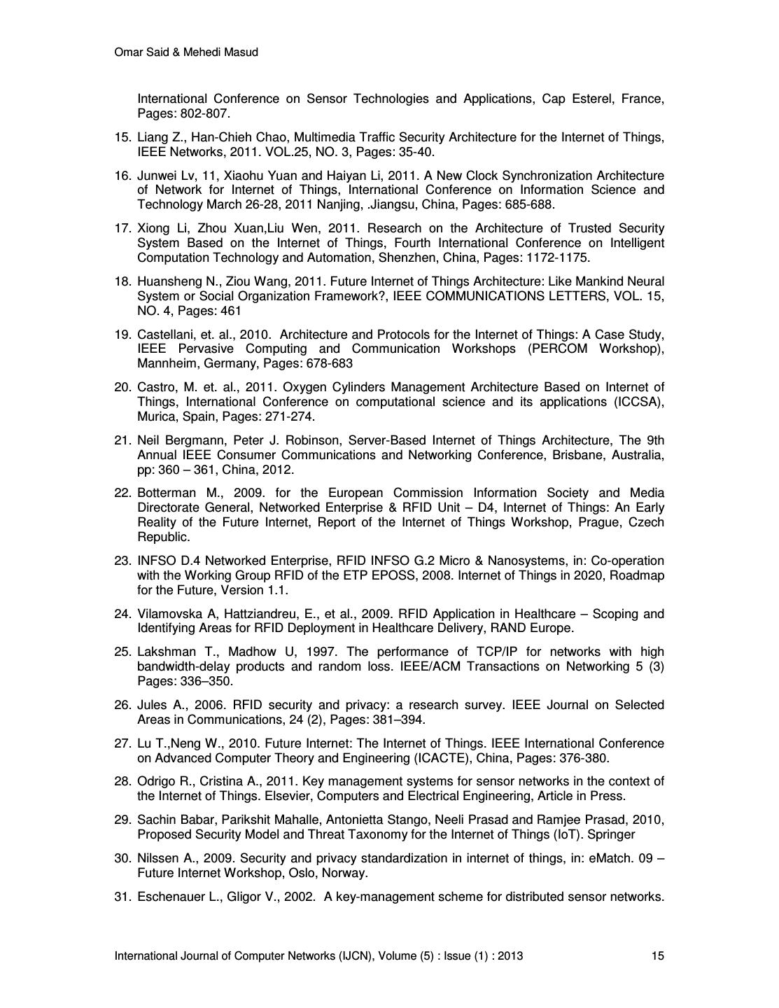 15 .Omar Said & Mehedi Masud International Conference on Sensor Technologies and Applications, Cap Esterel, France, Pages: 802-807. 15. Liang Z., Han-Chieh Chao, Multimedia Traffic Security Architecture for the Internet of Things, IEEE Networks, 2011. VOL.25, NO. 3, Pages: 35-40. 16. Junwei Lv, 11, Xiaohu Yuan and Haiyan Li, 2011. A New Clock Synchronization Architecture of Network for Internet of Things, International Conference on Information Science and Technology March 26-28, 2011 Nanjing, .Jiangsu, China, Pages: 685-688. 17. Xiong Li, Zhou Xuan,Liu Wen, 2011. Research on the Architecture of Trusted Security System Based on the Internet of Things, Fourth International Conference on Intelligent Computation Technology and Automation, Shenzhen, China, Pages: 1172-1175. 18. Huansheng N., Ziou Wang, 2011. Future Internet of Things Architecture: Like Mankind Neural System or Social Organization Framework?, IEEE COMMUNICATIONS LETTERS, VOL. 15, NO. 4, Pages: 461 19. Castellani, et. al., 2010. Architecture and Protocols for the Internet of Things: A Case Study, IEEE Pervasive Computing and Communication Workshops (PERCOM Workshop), Mannheim, Germany, Pages: 678-683 20. Castro, M. et. al., 2011. Oxygen Cylinders Management Architecture Based on Internet of Things, International Conference on computational science and its applications (ICCSA), Murica, Spain, Pages: 271-274. 21. Neil Bergmann, Peter J. Robinson, Server-Based Internet of Things Architecture, The 9th Annual IEEE Consumer Communications and Networking Conference, Brisbane, Australia, pp: 360 – 361, China, 2012. 22. Botterman M., 2009. for the European Commission Information Society and Media Directorate General, Networked Enterprise & RFID Unit – D4, Internet of Things: An Early Reality of the Future Internet, Report of the Internet of Things Workshop, Prague, Czech Republic. 23. INFSO D.4 Networked Enterprise, RFID INFSO G.2 Micro & Nanosystems, in: Co-operation with the Working Group RFID of the ETP EPOSS, 2008. Internet of Things in 2020, Roadmap for the Future, Version 1.1. 24. Vilamovska A, Hattziandreu, E., et al., 2009. RFID Application in Healthcare – Scoping and Identifying Areas for RFID Deployment in Healthcare Delivery, RAND Europe. 25. Lakshman T., Madhow U, 1997. The performance of TCP/IP for networks with high bandwidth-delay products and random loss. IEEE/ACM Transactions on Networking 5 (3) Pages: 336–350. 26. Jules A., 2006. RFID security and privacy: a research survey. IEEE Journal on Selected Areas in Communications, 24 (2), Pages: 381–394. 27. Lu T.,Neng W., 2010. Future Internet: The Internet of Things. IEEE International Conference on Advanced Computer Theory and Engineering (ICACTE), China, Pages: 376-380. 28. Odrigo R., Cristina A., 2011. Key management systems for sensor networks in the context of the Internet of Things. Elsevier, Computers and Electrical Engineering, Article in Press. 29. Sachin Babar, Parikshit Mahalle, Antonietta Stango, Neeli Prasad and Ramjee Prasad, 2010, Proposed Security Model and Threat Taxonomy for the Internet of Things (IoT). Springer 30. Nilssen A., 2009. Security and privacy standardization in internet of things, in: eMatch. 09 – Future Internet Workshop, Oslo, Norway. 31. Eschenauer L., Gligor V., 2002. A key-management scheme for distributed sensor networks. International Journal of Computer Networks (IJCN), Volume (5) : Issue (1) : 2013 15