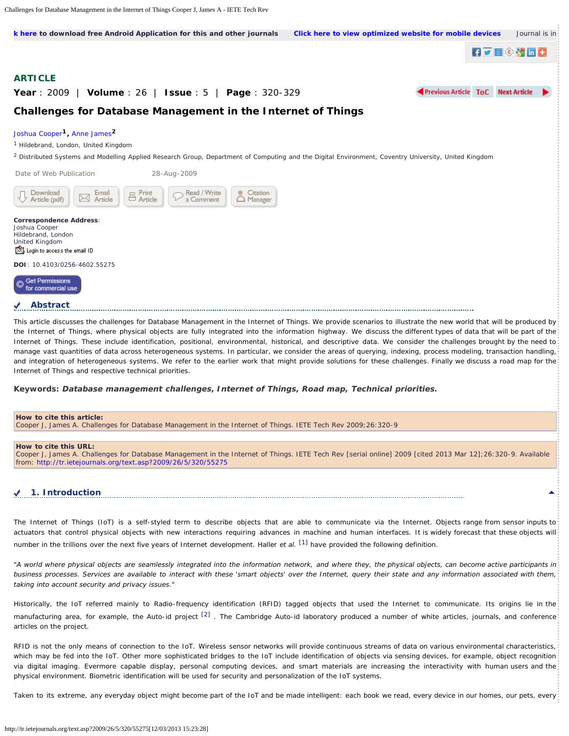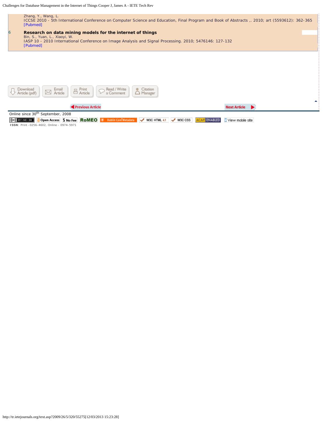 11 .Challenges for Database Management in the Internet of Things Cooper J, James A - IETE Tech Rev Zhang, Y., Wang, L. ICCSE 2010 - 5th International Conference on Computer Science and Education, Final Program and Book of Abstracts ,. 2010; art (5593612): 362-365 [Pubmed] 6 Research on data mining models for the internet of things Bin, S., Yuan, L., Xiaoyi, W. IASP 10 - 2010 International Conference on Image Analysis and Signal Processing. 2010; 5476146: 127-132 [Pubmed] Online since 30th September, 2008 ISSN: Print - 0256- 4602, Online - 0974- 5971 http://tr.ietejournals.org/text.asp?2009/26/5/320/55275[12/03/2013 15:23:28]