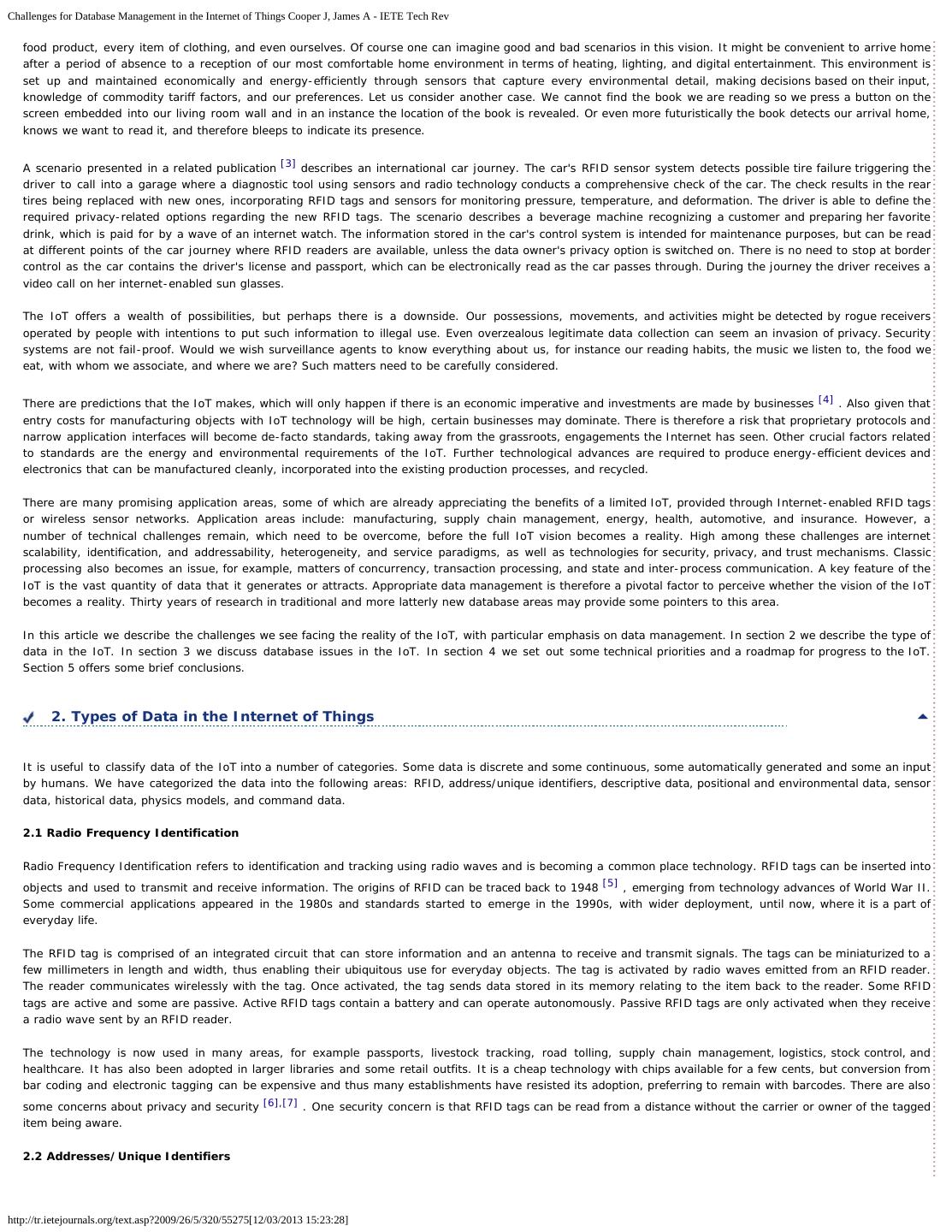 3 .Challenges for Database Management in the Internet of Things Cooper J, James A - IETE Tech Rev food product, every item of clothing, and even ourselves. Of course one can imagine good and bad scenarios in this vision. It might be convenient to arrive home after a period of absence to a reception of our most comfortable home environment in terms of heating, lighting, and digital entertainment. This environment is set up and maintained economically and energy-efficiently through sensors that capture every environmental detail, making decisions based on their input, knowledge of commodity tariff factors, and our preferences. Let us consider another case. We cannot find the book we are reading so we press a button on the screen embedded into our living room wall and in an instance the location of the book is revealed. Or even more futuristically the book detects our arrival home, knows we want to read it, and therefore bleeps to indicate its presence. A scenario presented in a related publication [3] describes an international car journey. The car's RFID sensor system detects possible tire failure triggering the driver to call into a garage where a diagnostic tool using sensors and radio technology conducts a comprehensive check of the car. The check results in the rear tires being replaced with new ones, incorporating RFID tags and sensors for monitoring pressure, temperature, and deformation. The driver is able to define the required privacy-related options regarding the new RFID tags. The scenario describes a beverage machine recognizing a customer and preparing her favorite drink, which is paid for by a wave of an internet watch. The information stored in the car's control system is intended for maintenance purposes, but can be read at different points of the car journey where RFID readers are available, unless the data owner's privacy option is switched on. There is no need to stop at border control as the car contains the driver's license and passport, which can be electronically read as the car passes through. During the journey the driver receives a video call on her internet-enabled sun glasses. The IoT offers a wealth of possibilities, but perhaps there is a downside. Our possessions, movements, and activities might be detected by rogue receivers operated by people with intentions to put such information to illegal use. Even overzealous legitimate data collection can seem an invasion of privacy. Security systems are not fail-proof. Would we wish surveillance agents to know everything about us, for instance our reading habits, the music we listen to, the food we eat, with whom we associate, and where we are? Such matters need to be carefully considered. There are predictions that the IoT makes, which will only happen if there is an economic imperative and investments are made by businesses [4] . Also given that entry costs for manufacturing objects with IoT technology will be high, certain businesses may dominate. There is therefore a risk that proprietary protocols and narrow application interfaces will become de-facto standards, taking away from the grassroots, engagements the Internet has seen. Other crucial factors related to standards are the energy and environmental requirements of the IoT. Further technological advances are required to produce energy-efficient devices and electronics that can be manufactured cleanly, incorporated into the existing production processes, and recycled. There are many promising application areas, some of which are already appreciating the benefits of a limited IoT, provided through Internet-enabled RFID tags or wireless sensor networks. Application areas include: manufacturing, supply chain management, energy, health, automotive, and insurance. However, a number of technical challenges remain, which need to be overcome, before the full IoT vision becomes a reality. High among these challenges are internet scalability, identification, and addressability, heterogeneity, and service paradigms, as well as technologies for security, privacy, and trust mechanisms. Classic processing also becomes an issue, for example, matters of concurrency, transaction processing, and state and inter-process communication. A key feature of the IoT is the vast quantity of data that it generates or attracts. Appropriate data management is therefore a pivotal factor to perceive whether the vision of the IoT becomes a reality. Thirty years of research in traditional and more latterly new database areas may provide some pointers to this area. In this article we describe the challenges we see facing the reality of the IoT, with particular emphasis on data management. In section 2 we describe the type of data in the IoT. In section 3 we discuss database issues in the IoT. In section 4 we set out some technical priorities and a roadmap for progress to the IoT. Section 5 offers some brief conclusions. 2. Types of Data in the Internet of Things It is useful to classify data of the IoT into a number of categories. Some data is discrete and some continuous, some automatically generated and some an input by humans. We have categorized the data into the following areas: RFID, address/unique identifiers, descriptive data, positional and environmental data, sensor data, historical data, physics models, and command data. 2.1 Radio Frequency Identification Radio Frequency Identification refers to identification and tracking using radio waves and is becoming a common place technology. RFID tags can be inserted into objects and used to transmit and receive information. The origins of RFID can be traced back to 1948 [5] , emerging from technology advances of World War II. Some commercial applications appeared in the 1980s and standards started to emerge in the 1990s, with wider deployment, until now, where it is a part of everyday life. The RFID tag is comprised of an integrated circuit that can store information and an antenna to receive and transmit signals. The tags can be miniaturi
